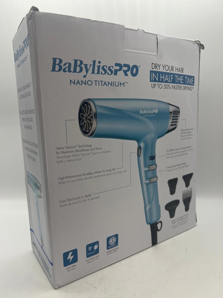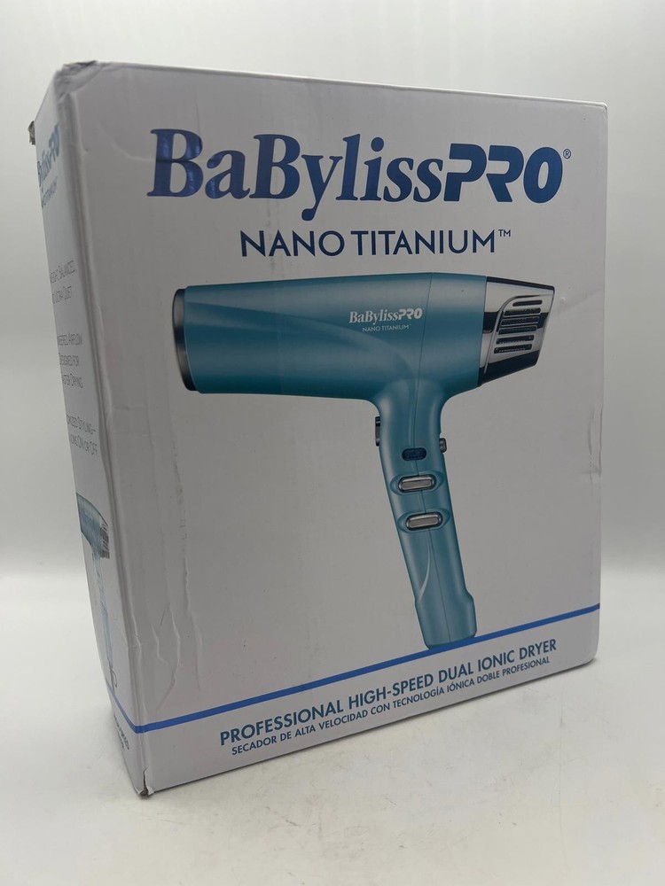Condition: Open Box Grade A, All Attachments Included, Functions Properly. Get smooth, frizz-free hair at home with the BaBylissPRO Nano Titanium Dual Ionic Hair Dryer BNT9100. This professional tool blends advanced technology and simple controls. Enjoy fast, salon-quality hair styling with less effort. The nano titanium element pushes heat evenly across your hair. This means fewer hot spots and less risk of damage. Your hair looks healthy and has extra shine. The dual ionic technology can be turned on for less frizz and quick drying. Turn it off to get more volume and more texture. This flexibility lets you create many different styles, no matter your hair type. The BNT9100 is strong but also very comfortable to use. It feels light in your hand and is carefully shaped so your wrist does not ache, even after long drying sessions. The handle has a digital panel with three precise heat and three speed settings. Use the true cold shot button to lock in your look, keeping styles fresh all day. The controls allow for total customization, from gentle heat for fine hair to powerful airflow for thick or curly types. This nano titanium hair dryer comes with a 9-foot cord. Move easily and style hair from different angles. The box includes helpful attachments. There are two nozzles with cool tips for focused drying. Use the straightening pic to smooth out curls. The diffuser lifts and shapes waves and curls. Find your perfect style, whether you want hair that is straight, full, or bouncy. BaBylissPRO tools are trusted by professional stylists. The brushless motor in the BNT9100 runs quietly and lasts longer than old designs. It stands up to daily use and resists overheating, making it a smart investment. If you want to learn more about nano titanium, see the Wikipedia page on titanium dioxide. This blow dryer helps protect your hair. Nano technology lessens heat damage and keeps your hair's natural bounce. With its digital controls and included attachments, you get the freedom to try new looks at home—without fear of damaging your hair. Bring salon-level styling into your daily routine. The BaBylissPRO Nano Titanium Dual Ionic Hair Dryer BNT9100 delivers performance, ease of use, and options you can trust. Its innovative details give you confidence and control every time you style. For a complete range of beauty and styling products, browse our personal-care collection.