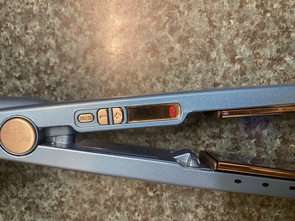 The BaBylissPRO Nano Titanium Hair Iron 450°F is a high-quality flat iron straightener designed for women. With a maximum temperature of 450 °F and a 1" barrel size, this electric hair styling tool is perfect for achieving sleek and straight hair. The ceramic material and titanium heating plate ensure even heat distribution, while the adjustable heat settings allow for customizable styling. This blue-colored iron is from the trusted brand BaByliss PRO, making it a reliable choice for creating salon-quality results at home.