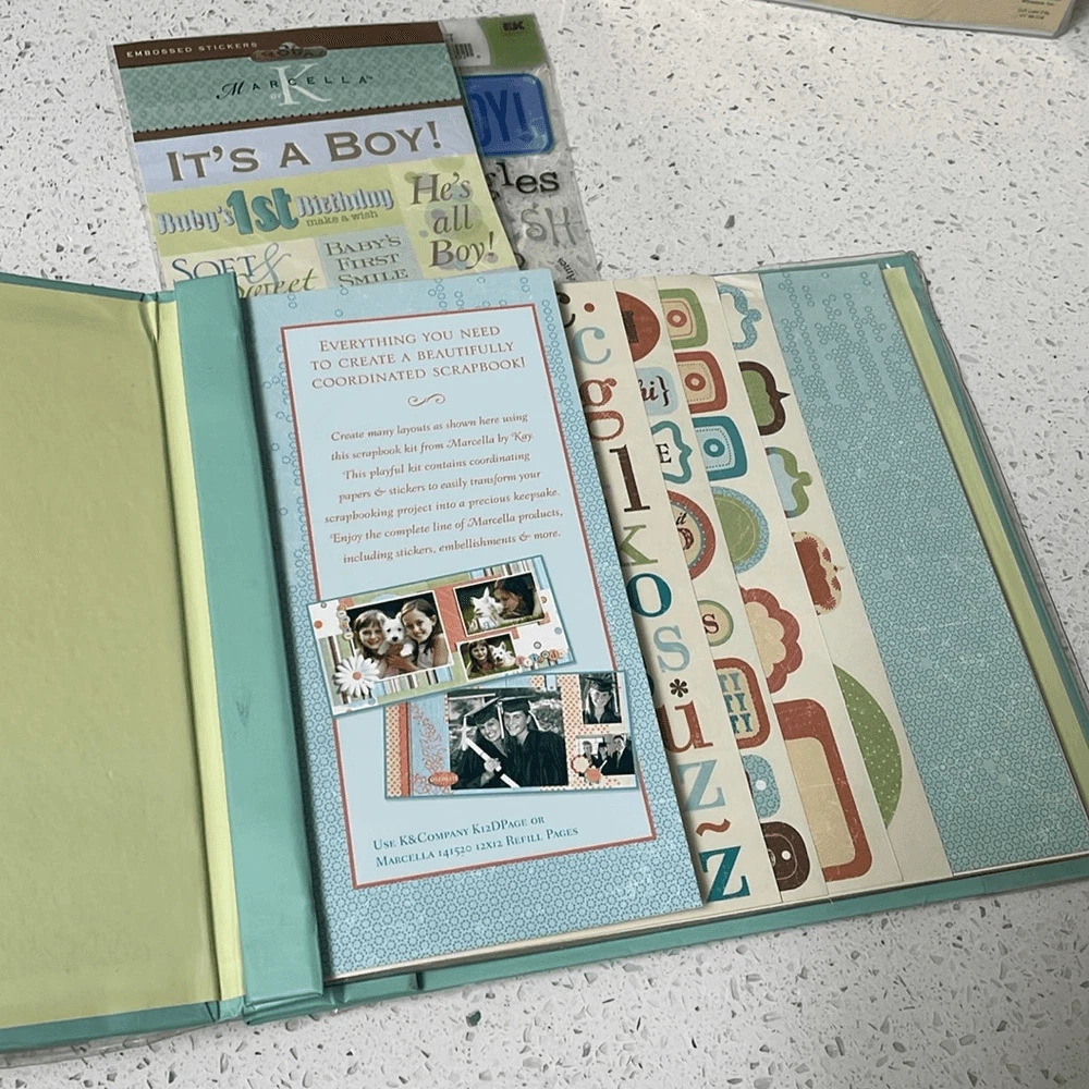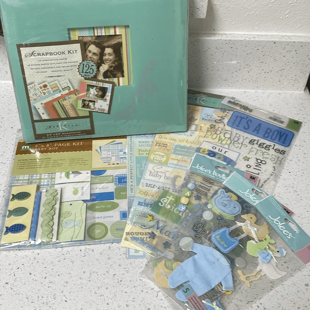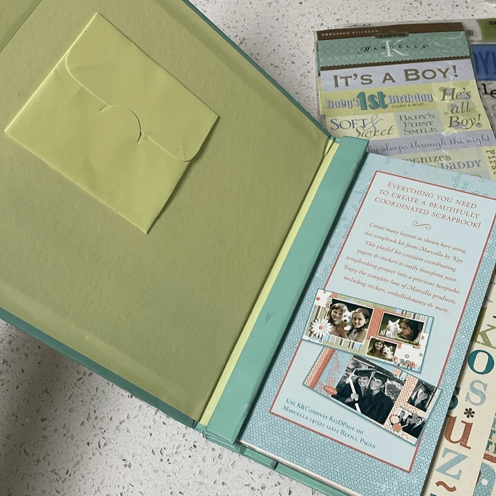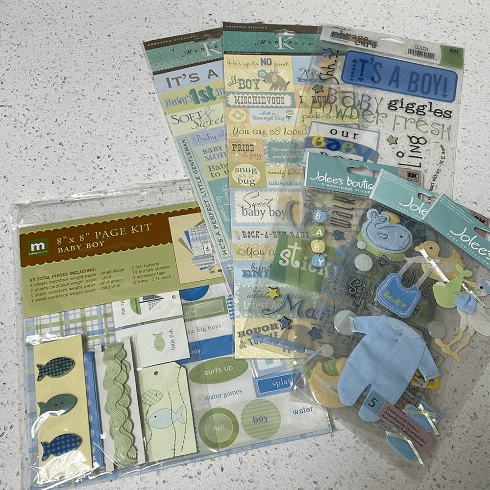 Scrapbook kit/book and supplies for new baby boy! 6 sheets of stickers 8x8 page kit Brand new Blue/green