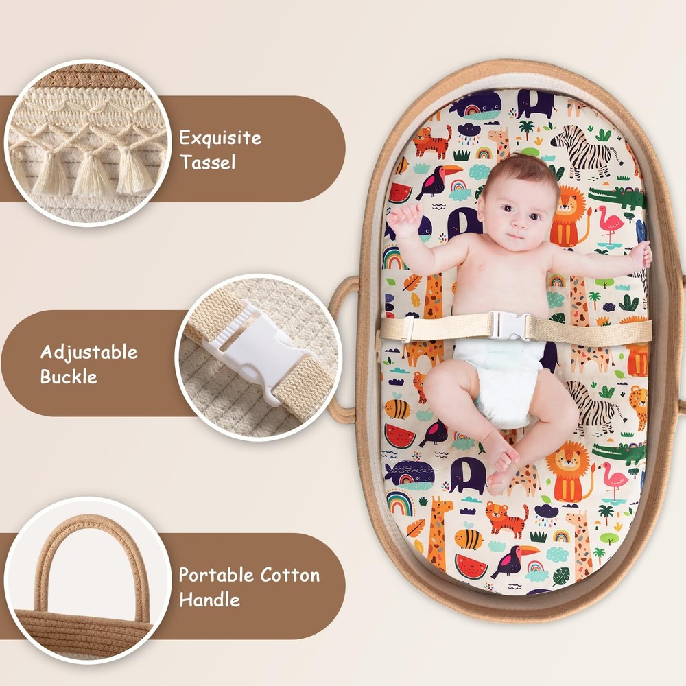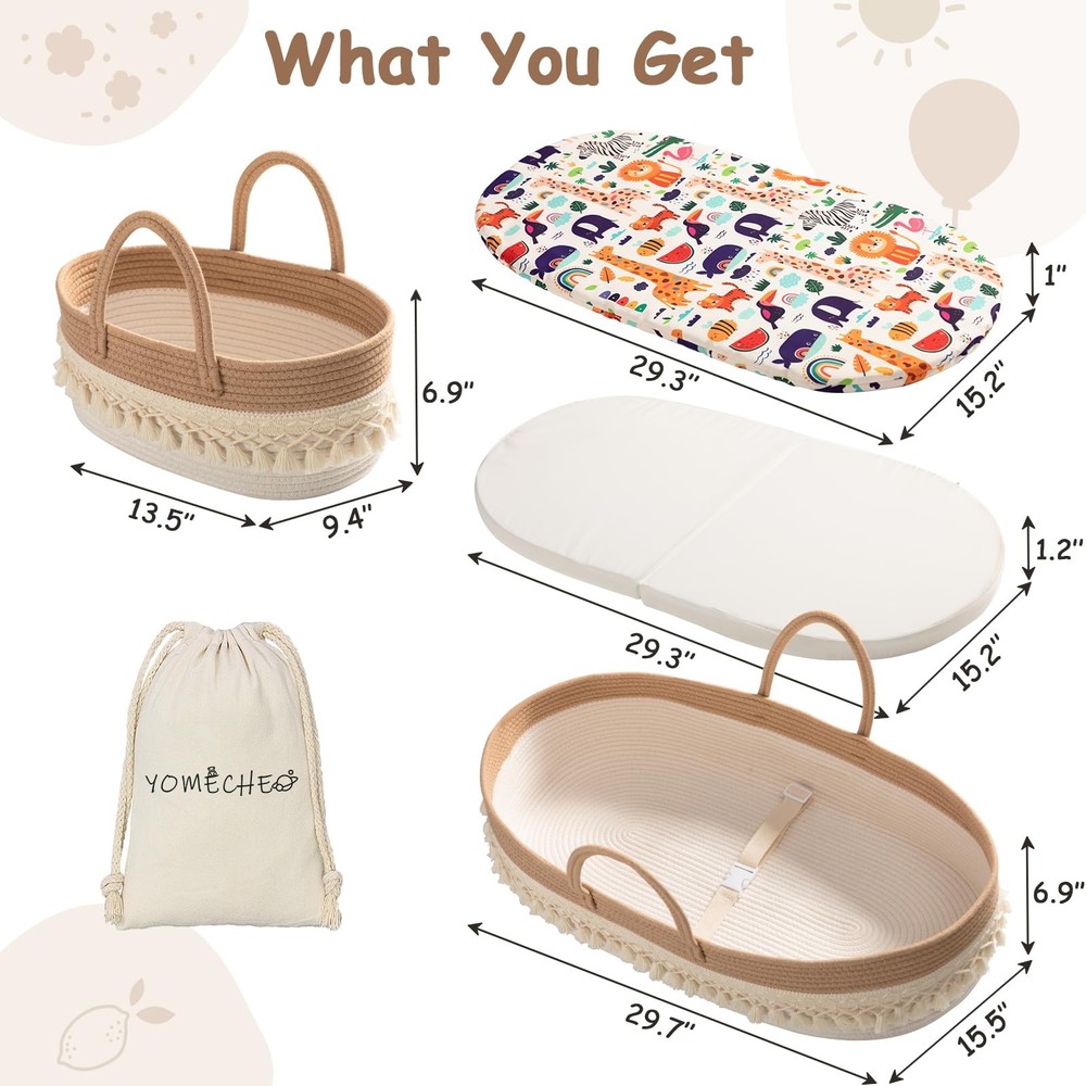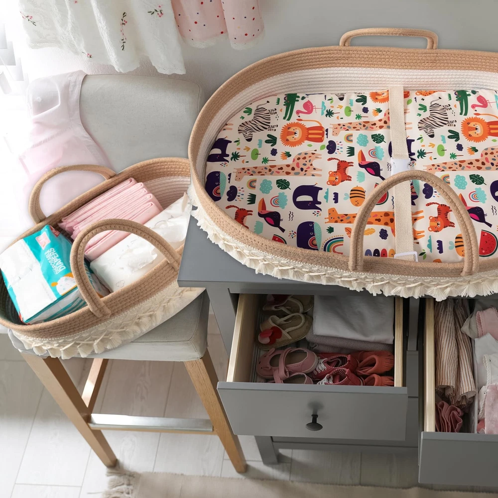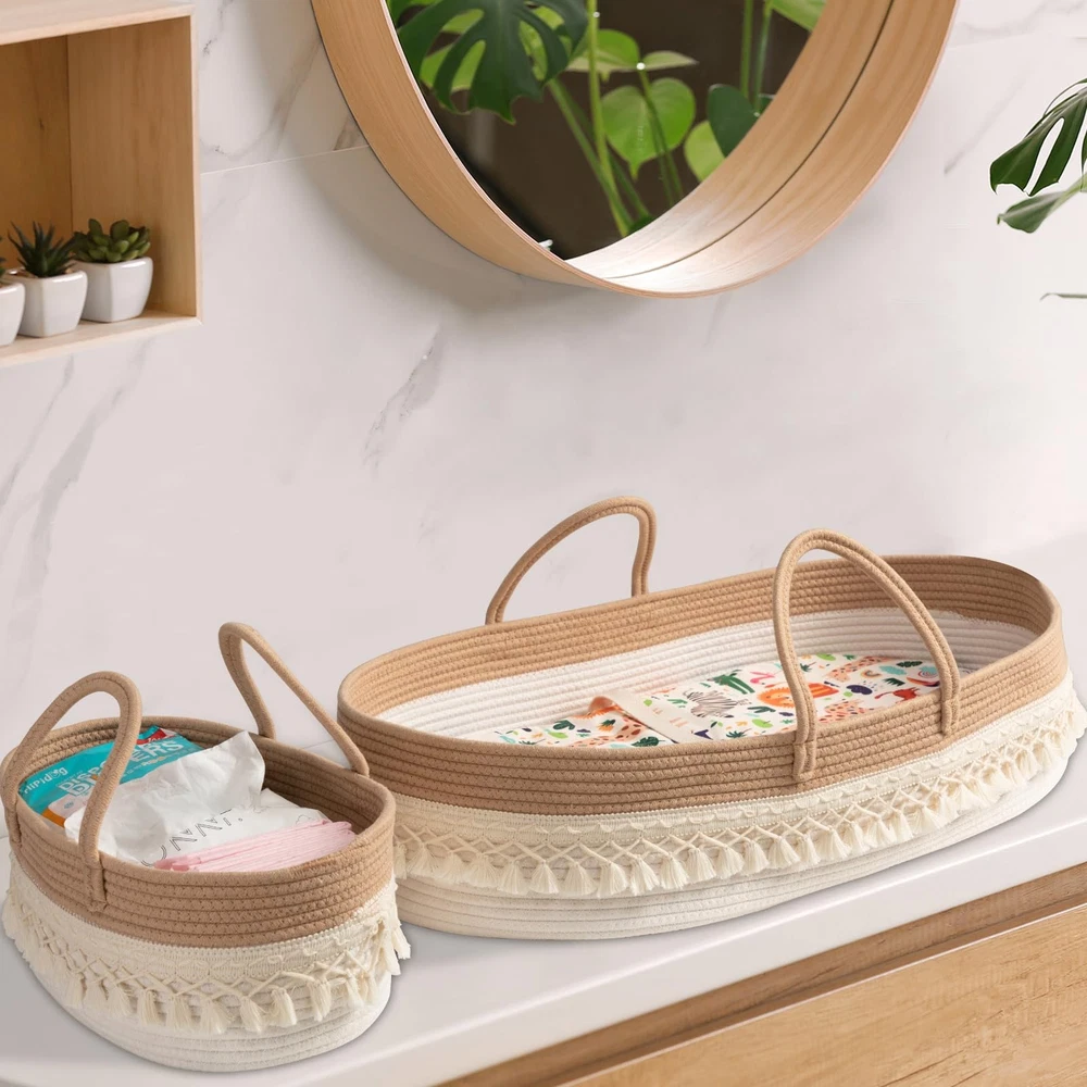 A Must-have Baby Changing Basket When you're looking for a simple, removable baby diaper changing solution, our 100% cotton moses baskets for newborn is the answer. No matter where you are, you can create a comfortable changing space for your baby and provide a sense of home-like for your baby. Multifunctional nursery addition It is more than just a changing basket. Featuring creamy, white mixed brown cotton body and silky white fringes, the changing table organizer is a perfect decoration for boho style nursery and bedroom, which adds elegance and warmth to interior space. The chic and stylish appearance will also be a great prop for baby’s shoot. As your infants grow up, you can use it as a storage and laundry basket, or a bed for kittens/puppies. Start from the Care, Love, Quality is committed to providing safe, comfortable and premium baby products with organic and soft materials. Care and love are always our tenet when we invent and design. The design of baby changing station for dresser top was born from our expectation of the precious moments when parents change diapers for their babies. Instead of a cold and solid changing table, we hope babies can lie on a soft and comfortable surface to avoid their fuss and irritation. And changing table pads is our final answer. It allows you to share eye and physical with your baby when you try to change diaper for him/her. Perfect for parent-bonding. Warning: Never leave the baby unattended under any circumstances while using this product. This baby hamper for nursery can only be used for changing diapers, not sleeping. It is already a Gift Set: 1 x baby changing basket 1 x detachable waterproof thickened pad 1 x soft waterproof cartoon peanut changing pad 1 x diaper caddy 1 x storage bag Perfect as newborn gift, shower gift and Mother’s Day gift Convenient & versatile: In comparison, our changing basket is more comprehensive in its functionality. We provide changing basket, diaper caddy, waterproof cartoon baby changing pad, thick waterproof sponge pad, adjustable buckle and a storage bag. And it’s perfect as a storage basket for toys or pet bed Chic & aesthetic: The baby changing basket showcases bohemian style with white tassels and cream mixed brown body, which add elegance to your home. Diaper baskets in the same color scheme are perfect for storing diapers, , creams and more Soft & comfortable: Our 0.8" waterproof cartoon changing pad is not only stylish, but also provide a soft and cozy area for your baby! A 1.2" thick waterproof sponge baby changing pad at the bottom to keep your baby dry and comfortable Foldable & lightweight: Measuring 29.7*15.5*6.9 inch, this lightweight changing basket for baby can be quickly unfolded or folded into the canvas tote bag. Bedroom, living room, bathroom, garden. Any place can be transformed into a changing station CPC tested: Our changing basket for baby dresser are complied with CPSC & CPC standards. If you need help, please us at any time. It's the perfect present for baby showers or new parents