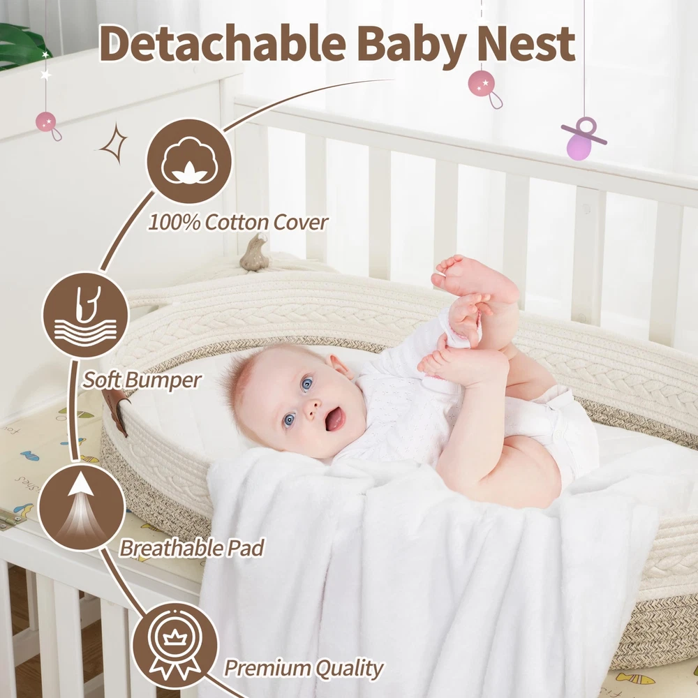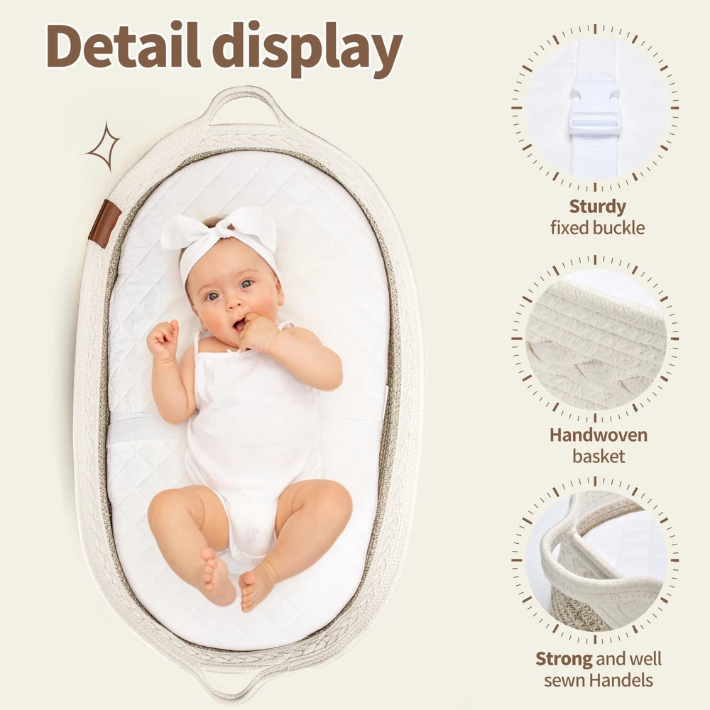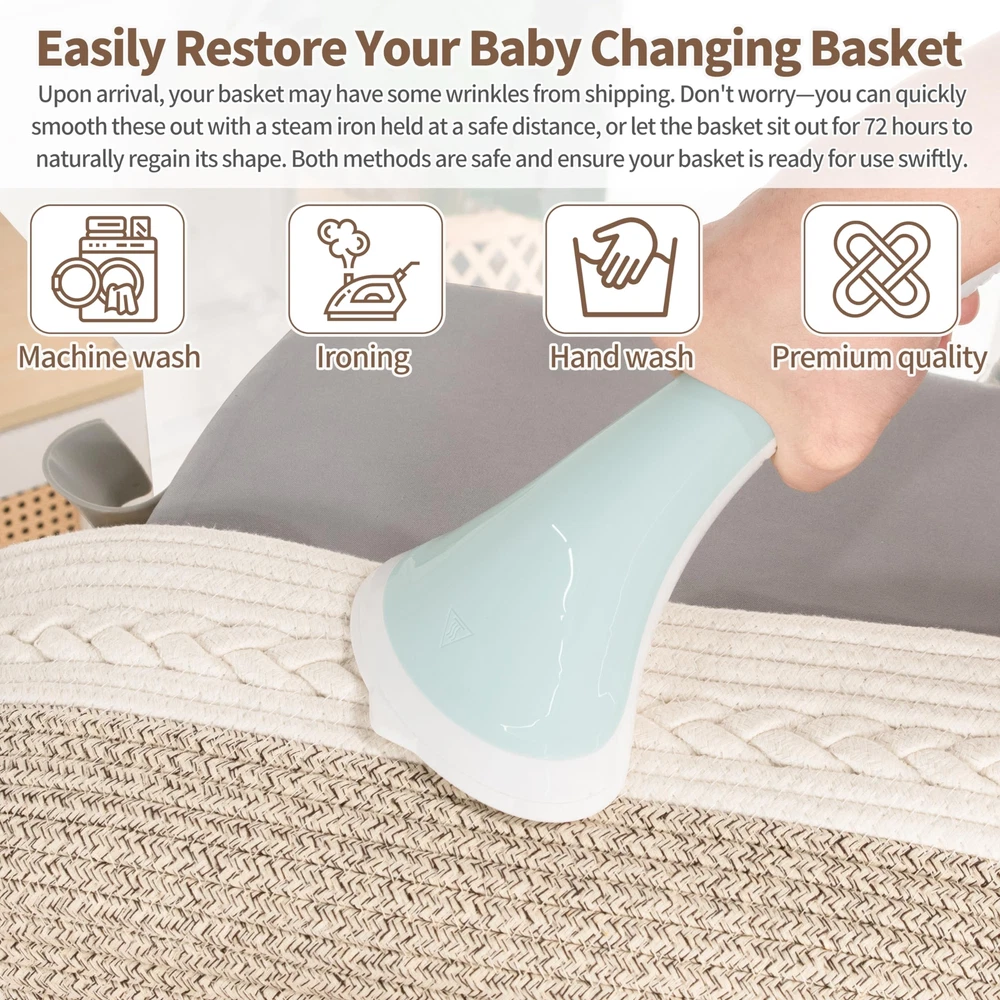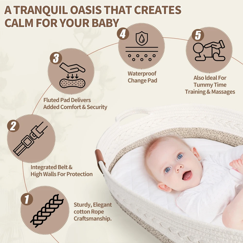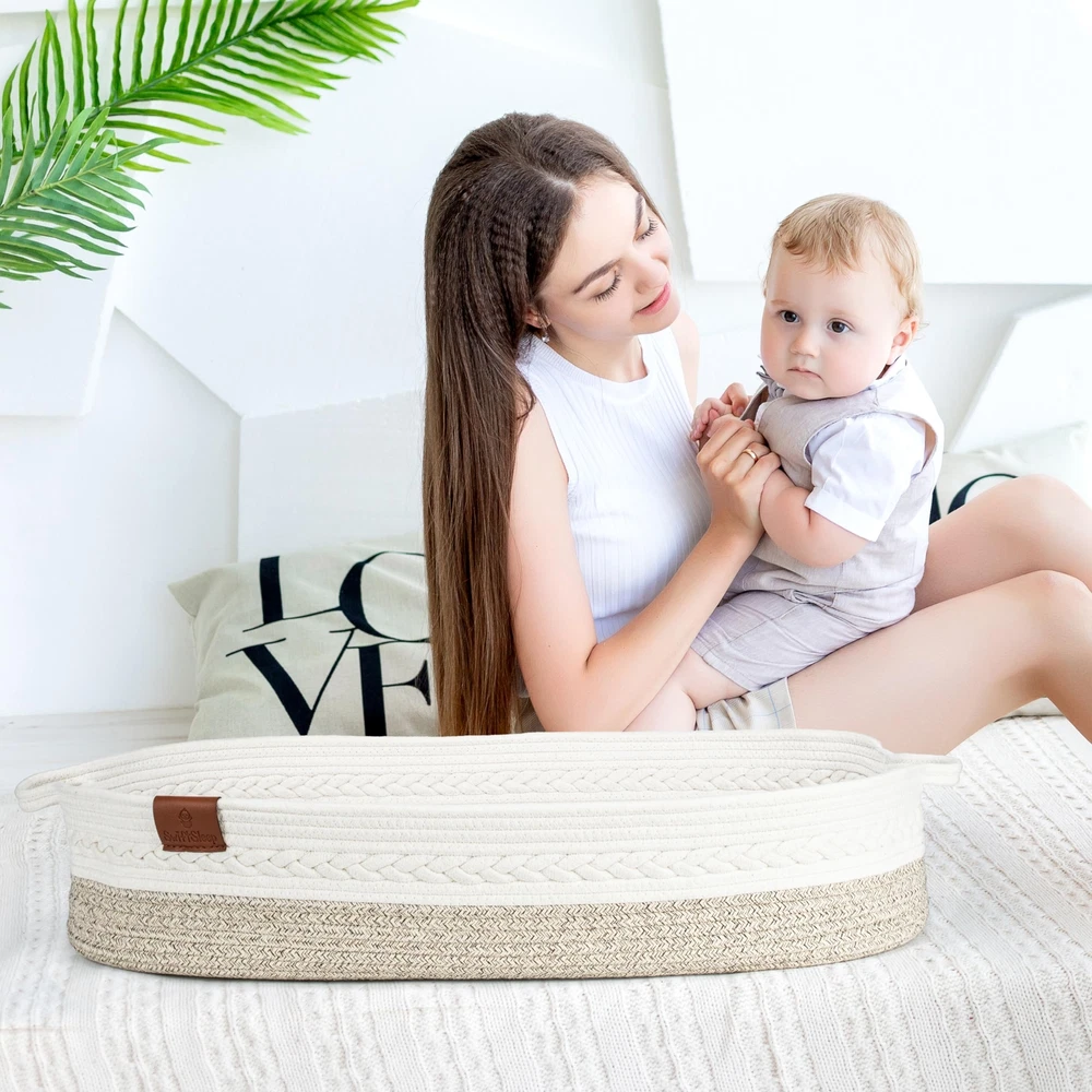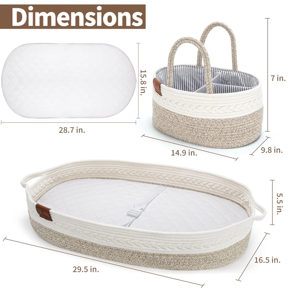 CRAFTING COMFORT FOR YOUR LITTLE ONE - Embrace the charm of our baby moses baskets woven with love from high-quality cotton rope. A timeless addition to your nursery, it echoes the of a traditional baby changing basket, offering a spacious and practical haven at 29.5" * 16.5" * 5.5". Nestle into the comforting embrace of our woven changing basket SECURITY AND SNUGGLES FIRST - Delight in the protective embrace of our 1 Security strap, ensuring tranquil and safe moments during changing. Our thoughtful baby moses changing basket radiates warmth and security for your precious one. Rest easy with our Children’s Product Certificate (CPC) certification, a testament to the safety of our diaper changing basket. GIFT FOR NEW MOM - Select a precious moses basket changing basket paired with our delicate diaper changing pad topper white. The perfect baby shower gift, it bestows practical elegance upon expectant parents, adding grace to their journey into parenthood. Light as a breeze, our baby change basket unfolds possibilities for moms on the move CHANGING PAD COMFORT - Revel in the softness of our 1.5" thick cushion, a gentle touch for your baby's comfort. Our changing pad basket for dresser is a plush sanctuary, providing a soft and supportive cocoon for every intimate diaper change. ORGANIZE WITH GENTLE ELEGANCE - Our matching diaper organizer bag, a symphony in matching cotton rope (size: 14.9" * 9.8" * 7"), becomes a gentle diaper caddy. A graceful companion to our baby changing topper, it keeps your essentials elegantly organized. Crafted with care, it forms an integral part of their earliest moments and stands as a precious addition to baby boy and baby girl newborn essentials. ALL-INCLUSIVE TENDERNESS - 's provision extends with an all-inclusive diaper changing solution. The changing pad tray for the dresser, a spacious and stylish baby changing basket for dresser top, and the matching diaper caddy create a cocoon of tenderness, ensuring every diaper-changing experience is wrapped in warmth and care. This tender changing basket for baby, becomes a cherished inclusion in the world of newborns.