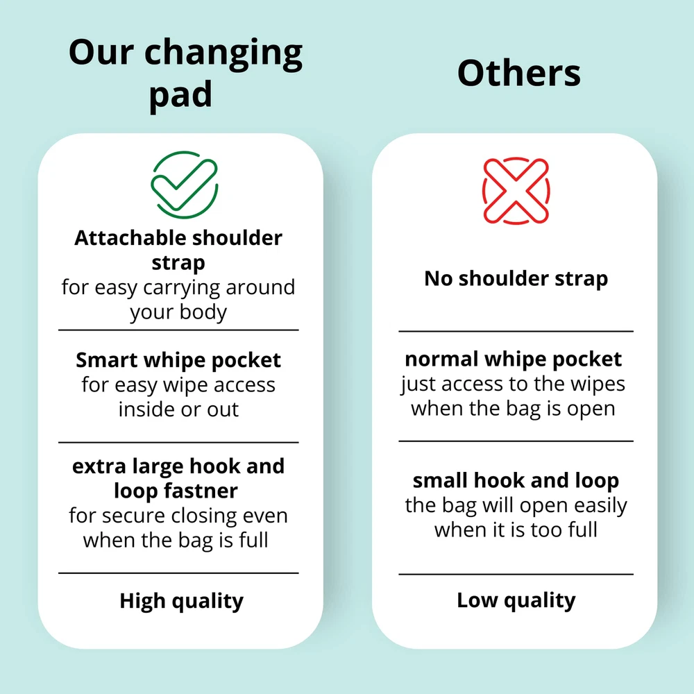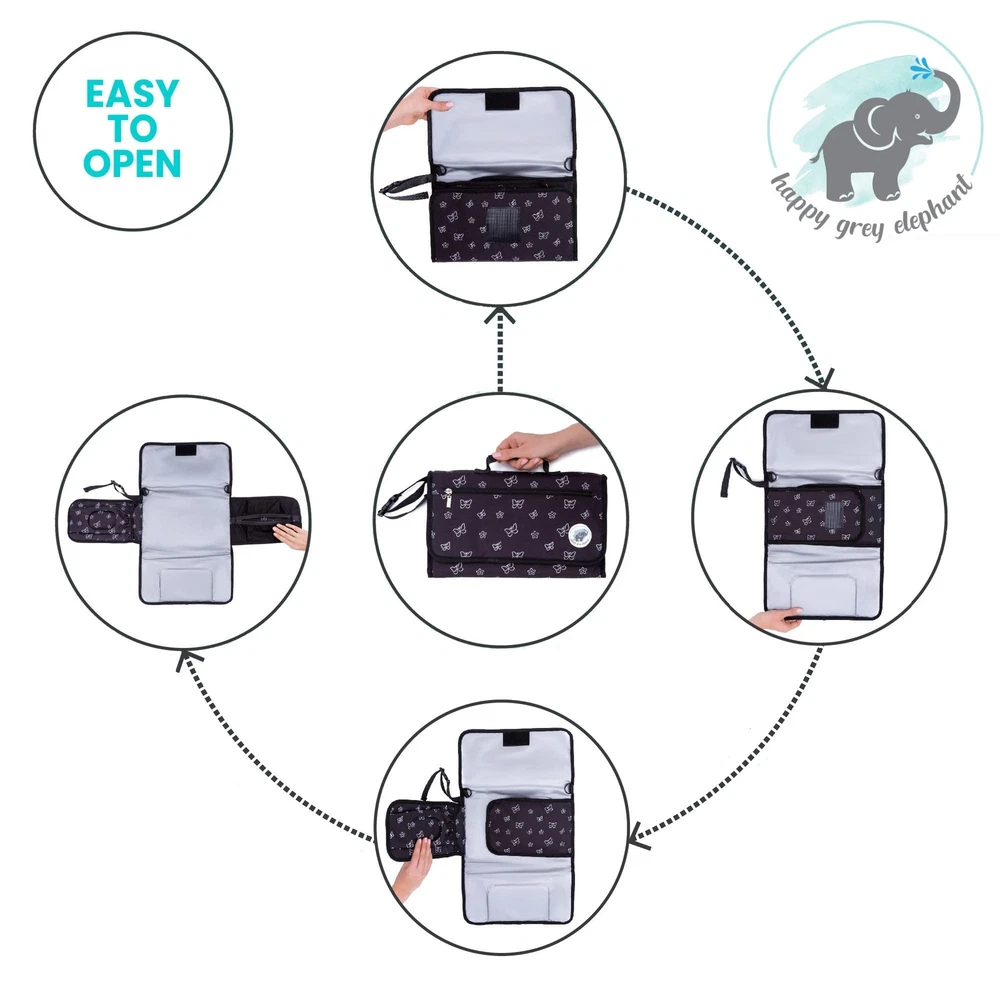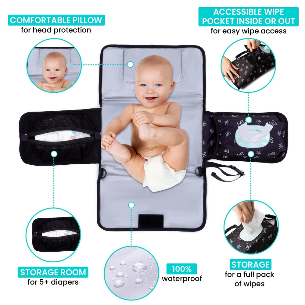 PORTABLE ALL IN CHANGING PAD It doesn’t matter if you are in the park, on a road trip or just at home – the changing pad from makes diaper changing easy, clean and convenient in any location EASY TO CARRY - Use the attachable shoulder strap to carry the bag or use the side strap to attach the clutch to your wrist or clip it to your stroller. FIND SPACE FOR EVERYTHING YOU NEED - The large wipe pocket holds up to 100 at a time and has a large opening for easy access. The Diaper pocket fits a minimum of 5 diapers and the zip pocket in the front can be used to creams, baby items, your keys or cell . SAFE CLOSING AND HAND OPENING - The extra large hook and loop in the front s a save closing, even when the bag is full. You can open the bag with hand whilst holding your baby at the same time. ACCESSABLE WIPE POCKET - Sometimes you need a wipe from the bag fast. This is no porblem with the accessable inside or out wipe pocket. PADDED PILLOW AND WATERPROOF PAD - The padded pillow ensures that your babys head is comfortable while changing. The waterproof changing pad is easily san It'sed with a wipe, insuring it is hygienic and clean for the next time. PERFECT BABY SHOWER GIFT - The gender neutral changing pad is perfect for your own baby registry must have list or as a baby shower gift. Change your baby’s diaper anytime and anywhere with the portable changing pad from . The Portable Diaper Changing pad is protected with a 30 DAY MONEY BACK so you can make sure you get the best portable changing pad around. ADD TO YOUR CART TODAY CONVENIENT PORTABLE DESIGN - The compact and lightweight design of the travel changing pad makes it easier to carry and change nappies at any time. For convenience, the mat includes a long, adjustable shoulder, wrist or stroller strap and a built-in carrying handle. COMFORT AT ITS FINEST - We made the baby changing pad liner to give your baby the topmost comfort during changing times. The portable changing station has a built-in pillow to support your baby's head and an insulated padded surface to wriggle on. MULTI-FUNCTIONAL BABY ESSENTIALS ORGANIZER - This portable diaper changing pad gives ample storage pockets to hold an entire 100 pack of , a minimum of 5 diapers, and the zipped pocket hold creams and other essentials to keep your things organized. SMART POCKET - These newly designed pockets are on point with their purpose. Whether the portable changing pad for the baby is open or folded, the pocket grants you easy access that you'll never be bothered looking for your again! PRACTICAL BABY SHOWER GIFT - This portable diaper changing pad is perfect as a gift. Ideal not only for home usage but also for short or long travels, and camping to keep your little fresh and dry no matter the place. The adorable design, extra space, and soft padding make this a must-have for parents! SLEEK AND TRENDY STYLE - Its rapid-open buckle and shoulder strap allow you to carry the travel changing pad around or wear it on your wrist like a purse. Its stylish aspect is perfect for mommas out there! It can be attached to your stroller or headrest while you keep your hands holding your little munchkin! THE IDEAL HYGIENE - Your hygiene is our priority. The outside fabric and the unique folded features of the portable diaper changing pad keep your mat dry and stain-free, protecting it from unwanted surface dirt during travel. Its waterproof attribute makes it easy to clean. SAFE CLOSING AND HAND OPENING - The extra large hook and loop in the front guarantees a save closing, even when the bag is full. You can open the bag with hand whilst holding your baby at the same time.