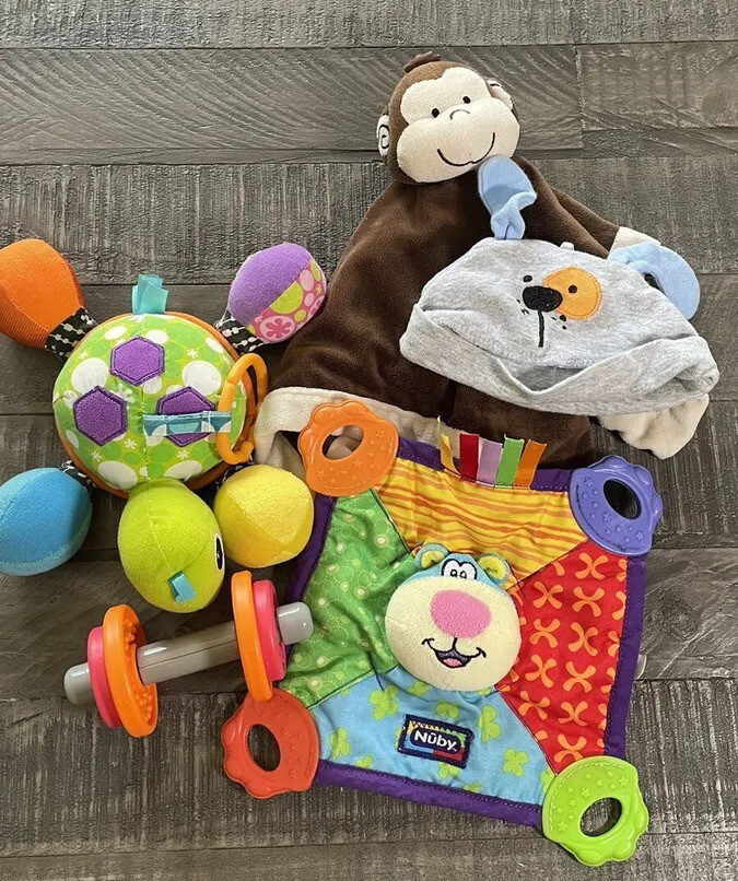 Lot of 5 includes Nubby Monkey soothing teething blanket, tidily Winks comforting monkey blanket, infantino Turtle developmental Toy with mirror belly. Includes Bear hat and fisherPrice small ring toy.