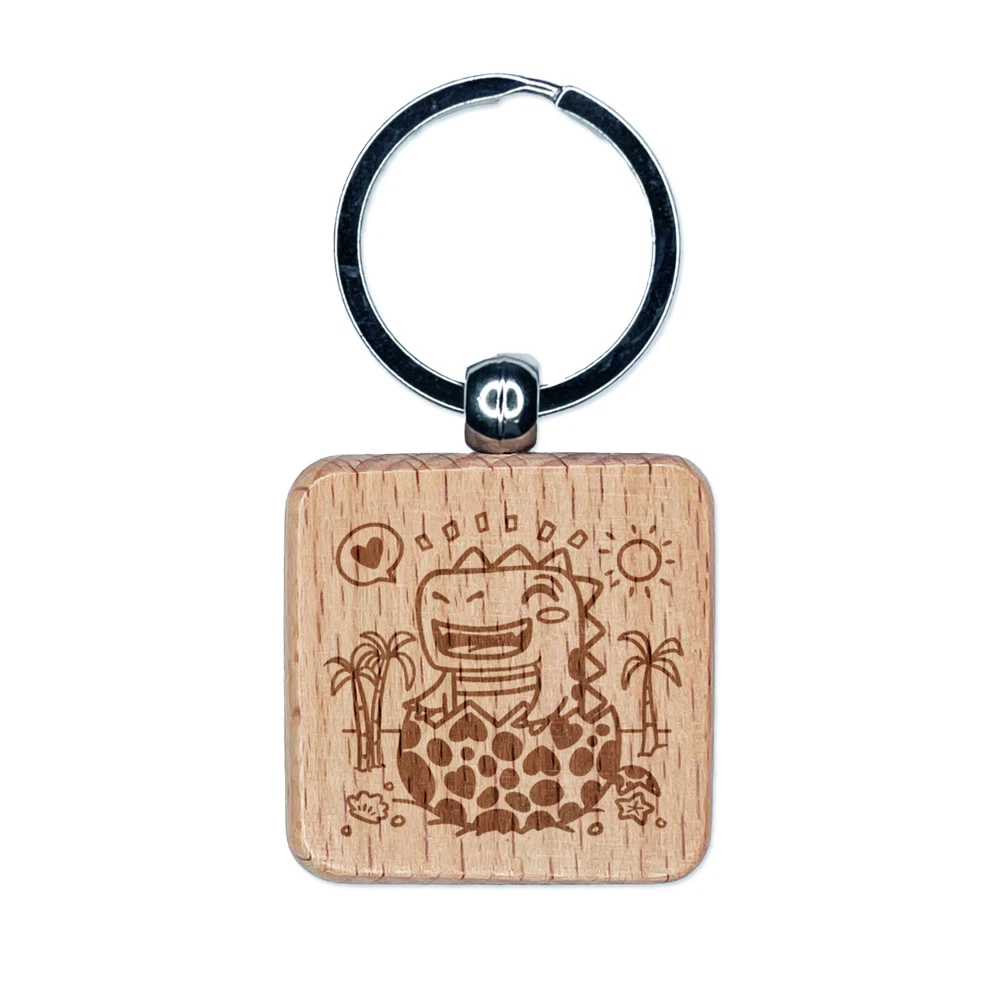 Baby Dinosaur Hatchling on Beach Engraved Wood Square Keychain Tag Charm