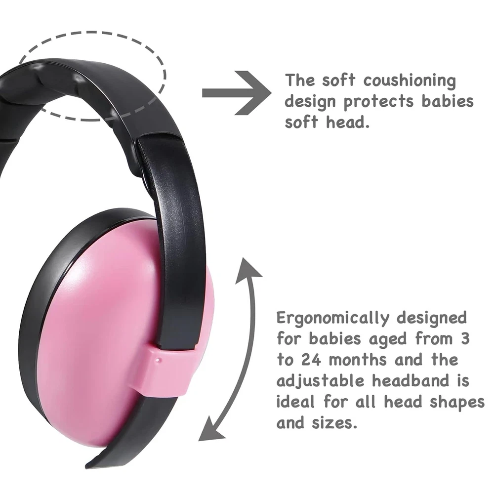 Baby Ear Protection Noise Cancelling Headphones Ages 0-3 Years | Infant Hearing Protection Earmuffs -Pink plastic and leather Imported Baby Ear Protection: PandaEar baby earmuffs significantly muffle harmful noise to prevent the potential hearing loss. Our headphone have dual-high density cushioning offers the most effective way in canceling any noise that comes your baby's way Adjustable Headband: Ergonomically designed for babies aged from 6 to 36 months and the adjustable headband is ideal for all head shapes and sizes. Our earmuffs fit snugly on the small and soft heads and provide the undisrupted sleep time Lightweight & Convenient: The lightweight baby noise cancellation headphones are perfect to be used during sporting events, flight, monster jam, fireworks, music concerts, wedding receptions and many more social gatherings, which generate loud noises. A bonus tote canvas bag provides great convenience and helps kids stay organized Ultra Soft and Comfort: The ear cushions are made of ultra-soft material with the generous amount of padding protects the most sensitive skin and offers the greatest comfort Durable & Long-Lasting: Made with high-quality materials, these earmuffs are built to withstand everyday wear and tear, ensuring they stay in excellent condition even with frequent use PandaEar baby earmuffs muffle noise to prevent hearing damage for babies and toddler. Our headphone have dual-high density cushioning offers the most effective way in canceling any noise that comes your baby's way (n/a) Color Pink