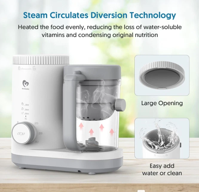 Baby Food Maker Food Processor, Puree Blender Steamer, Reversible Steam Basket Multifunctional Baby Food Maker: Our baby food processor can steam and blend fruits, vegetables and meat. Perfect for making homemade baby food without the hassle. Do not have to dirty up more than 1 dish. Upgraded 360° Reversible Steam Basket: One-second flip with the knob after steam cooking, then blend, saving time and allow one hand operation even when multitasking with a baby in hand. One-Button Process: Turn the button to adjust steam time and press to mix , eliminating tedious steps. The unique blend feature lets you control consistency from fine to chunky puree. Suited for new parents. Design for Baby: Blender cup made from Tritan material. Blades are made of 304 stainless steel. Our Baby food maker has a triple lock design, only be powered on when all parts are installed in place. Easy to Clean: The blade is removable for cleaning without dead corners. The large opening water tank for easy adding water and pour out water for cleaning. Great gift for baby showers and all festivals. Terms of Sale and Feedback: Feedback is very important to us and eBay. If you are satisfied with our transaction, please take a moment to leave positive feedback. YOUR satisfaction is our number one priority! If there are any problems, PLEASE contact us BEFORE leaving a neutral or negative rating so we can resolve any concerns. We PROMISE that we can make you happy if you give us a fair chance.