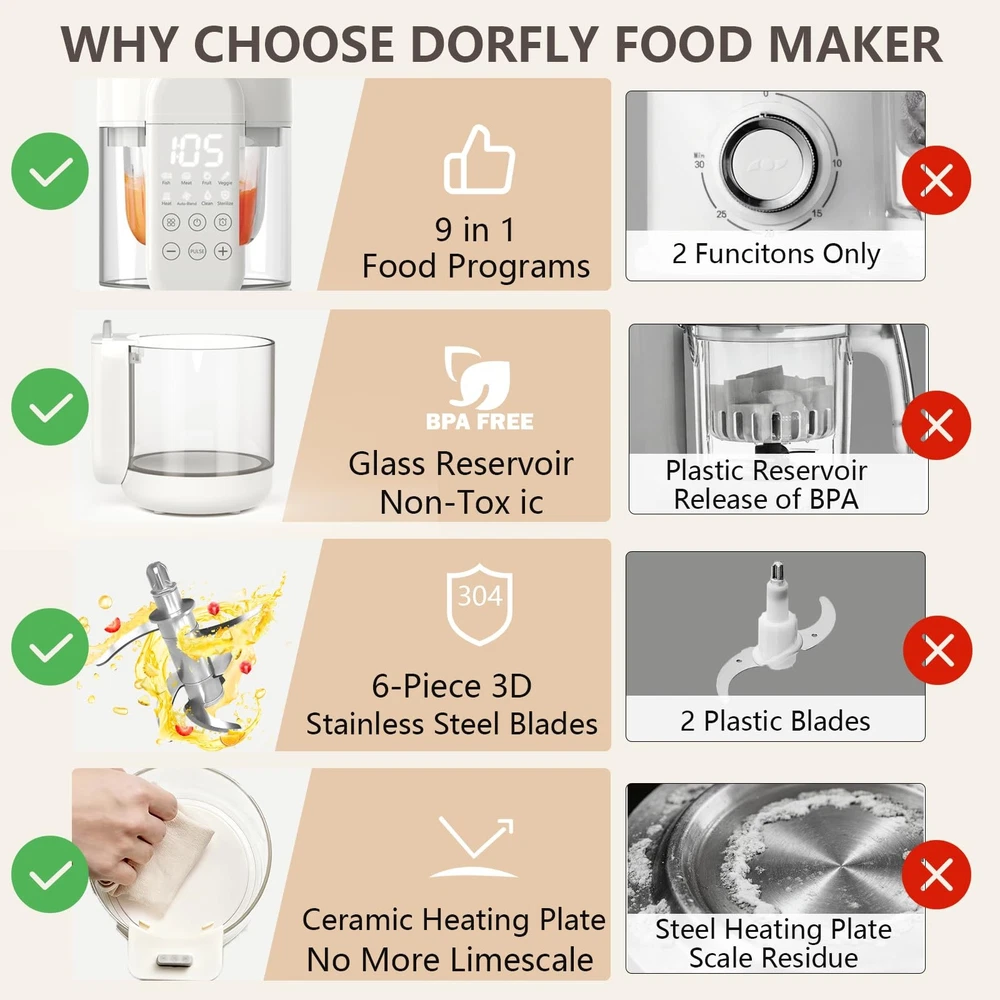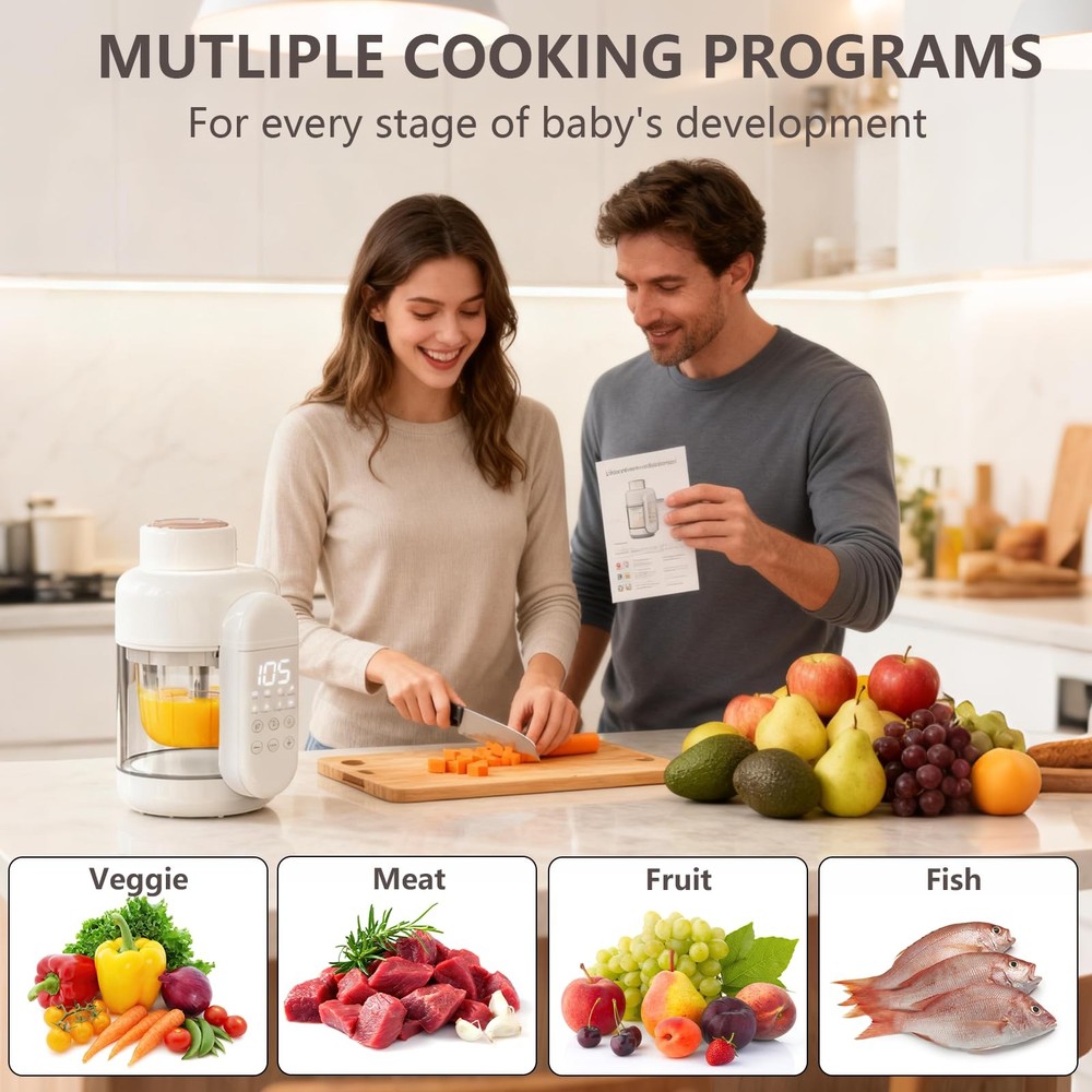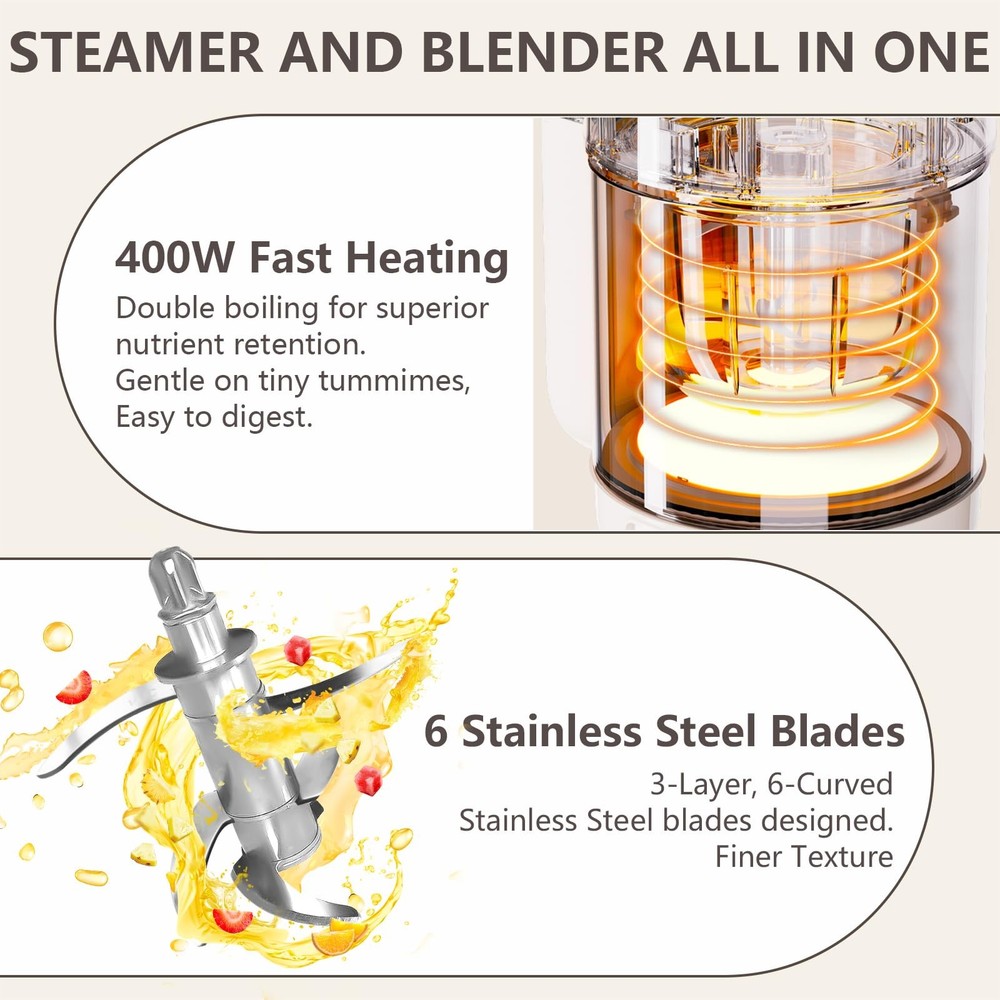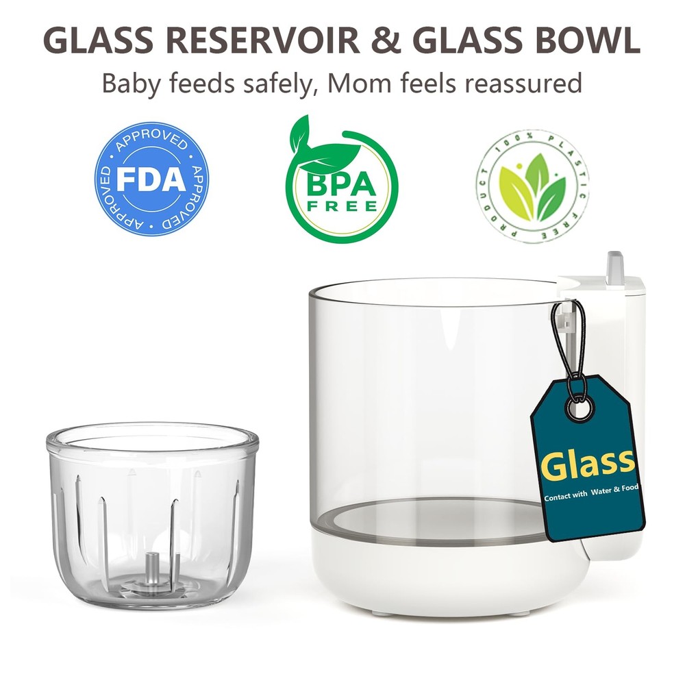 baby food maker 【Convenience and Time Saving】Baby food maker seamlessly integrates steaming, blending, and chopping capabilities, just one step to make vegetable, fruit, fish or meat for your baby. You can use it without much difficulty. 【100% Safe Baby Food Maker】 Baby food steamer comes a durable glass bowl and a glass reservior, it is much safer than Tritan and plastic, you can trust that every meal you prepare is safe and healthy for your baby. 【Durability and Reliability】 Baby food processer is equipped 6 high-quality stainless steel precision blades, and a powerful motor, effortlessly transforms an array of meat, fish, veggie, nuts and fruit into silky purees. 【Preserving Food Nutrition Tech】The all in one design of our baby puree maker, that minimizing nutrient loss furing processing, and protects water-soluble vita-mins B and C by while steaming. Ensures maximum nutrition in every meal. 【Easy to Clean】Food maker has self clean mode, make it easy to clean. Each component of baby blender is easily detachable for swift cleaning, and dishwaher safe, while the included cleaning brush ensures no crevice is left untouched. Non-stick coating ensures no more limescale. 【Saving Time and Money】With a generous 11 oz capacity, Bowl has graduation markings for easy measuring. You can prepare a day's worth of fresh and nutritious meals for your baby, saving you valuable time and effort in the kitchen. 【Gift Giving for Parent】 Ideal for baby showers, Thanksgiving, or Christmas, our baby food blender comes with a recipe book to help create nutritious meals. We provide a 1-year warr-anty, 24/7 customer service, and lifetime technical support. For any concerns, please feel fre-e to contact us. 【Timer】: The auto-timer function is especially helpful, as it lets you set it and walk away while it steams. 【Compact Size】: 10*5*6", so compact that it fits on any countertop. 【Recipe Inspiration】: The included recipe guide provides drink and dish making inspiration.