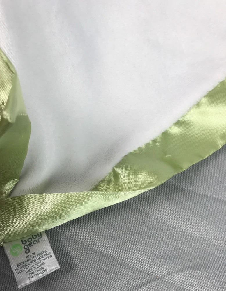 Country/Region of Manufacture: China Features: n/a Size: 15" Type: Security Blanket Material: Polyester & Satin Model: I Paw Print Hugs gtin13: Does not apply Brand: Baby Gear To Fit: n/a Color: White, Green & Brown Theme: Bear Hugs Character Family: unknown Gender: Unisex UPC: Does not apply MPN: unknown