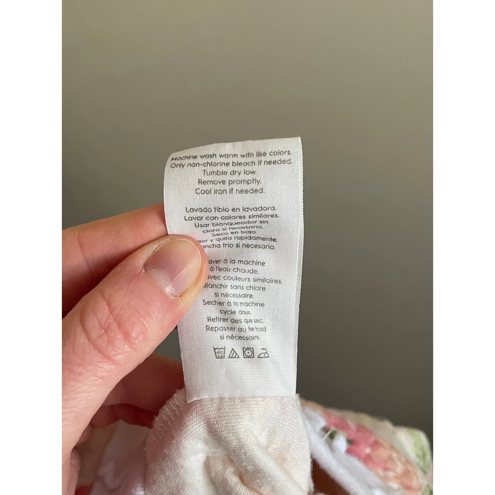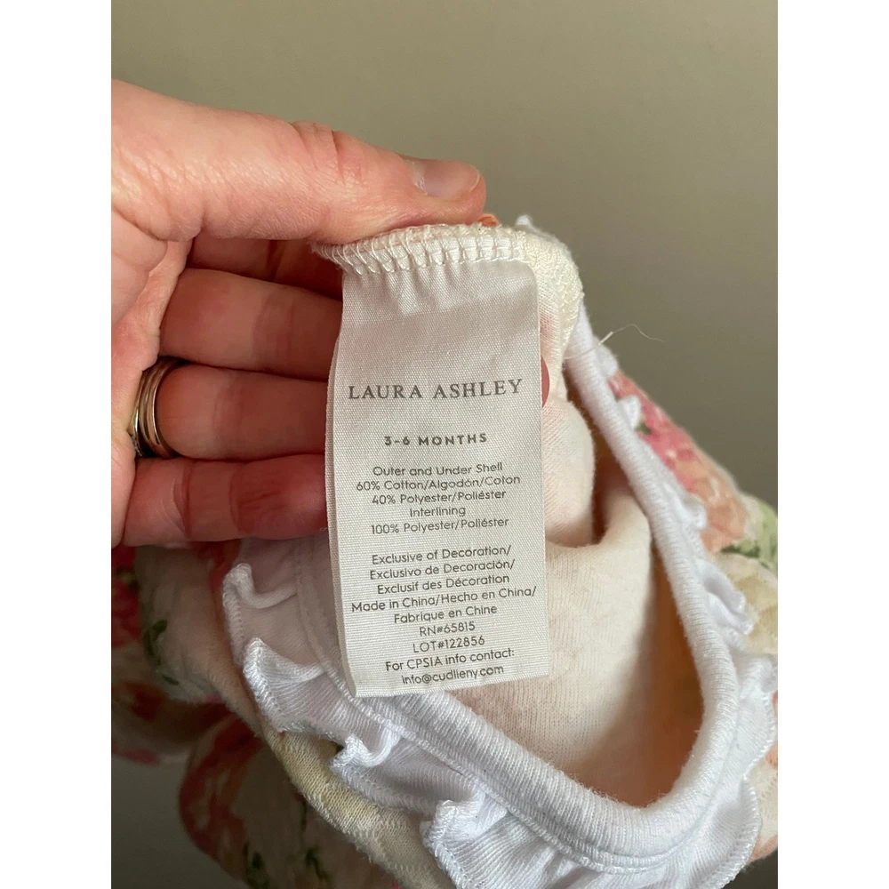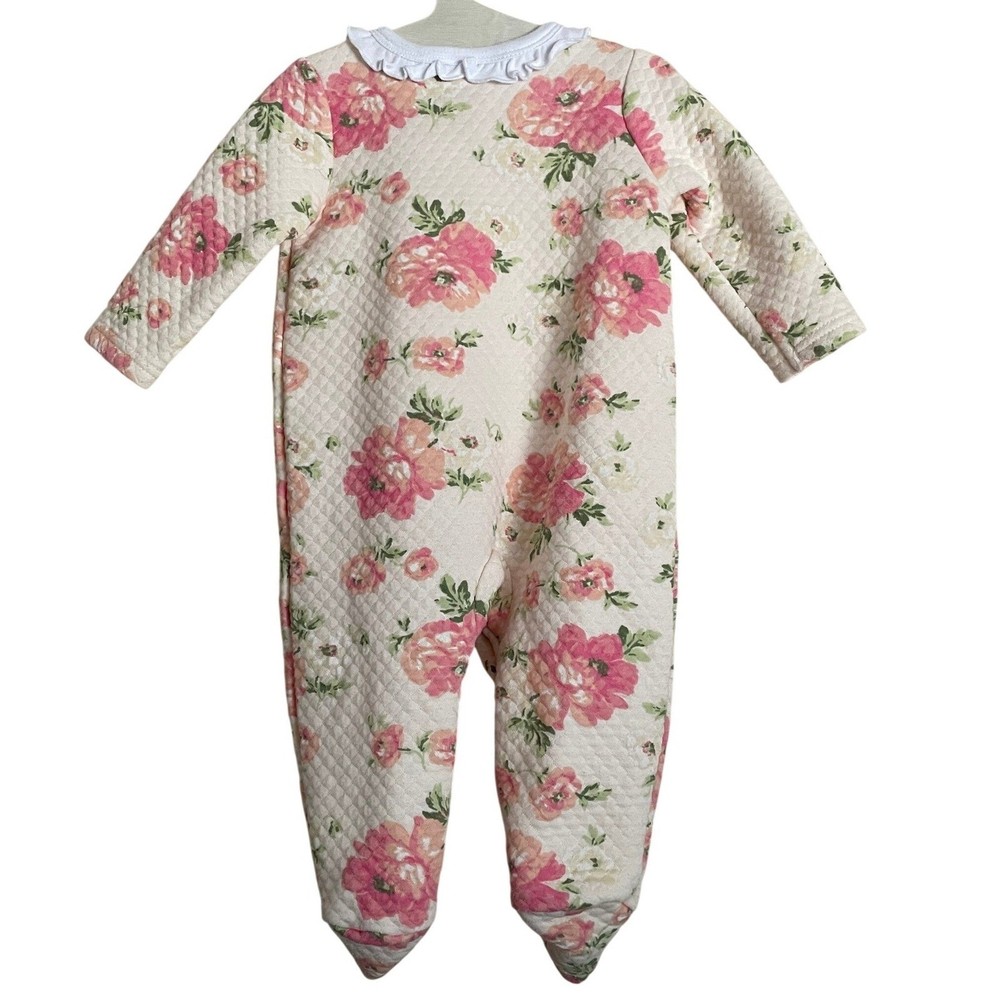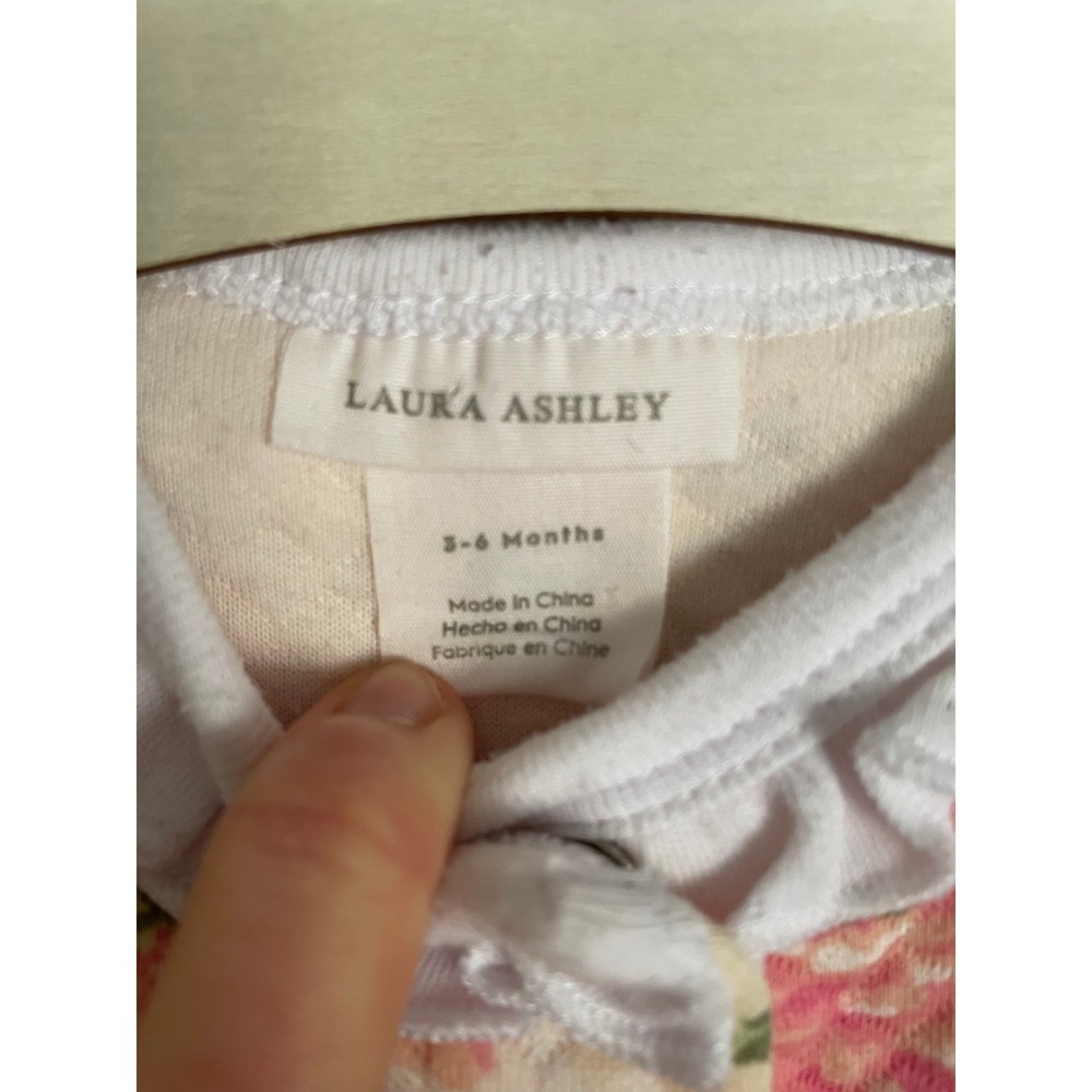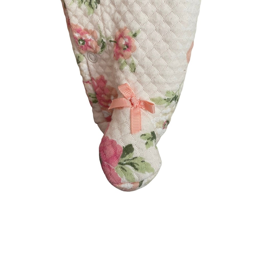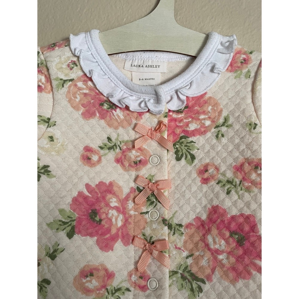 Laura Ashley, Pastel, Ballet, Feminine, Spring, Warm, Girly, Cute, Snap Up, Rose, Valentine's Day, Easter, Prairie, Preppy, Old Money Department: Girls Type: One Piece Material: 40% Polyester, 60% Cotton Fabric Type: Knit Closure: Snap Pattern: Floral Season: Spring, Fall, Winter Accents: Bow, Quilted Sleeve Length: Long Sleeve Features: All Seasons Country of Origin: China Garment Care: Machine Washable Keywords: baby girl, footed pajamas, sleepsuit, floral print, quilted, baby shower, hospital outfit, cozy, soft, pink flowers, ruffle collar, bow detail Measurements: Armpit to Armpit: 9.5" Length: 20.5" Sleeve Length: 8" Flaws: Minor Pilling From Pet Friendly Smoker Free Home