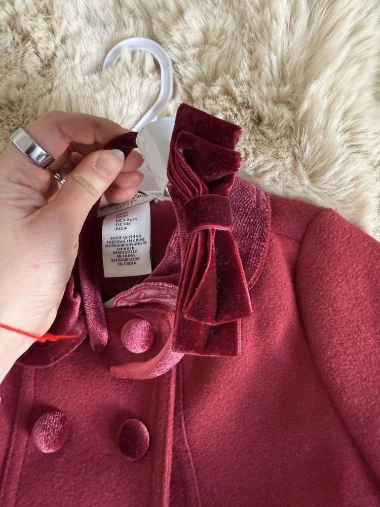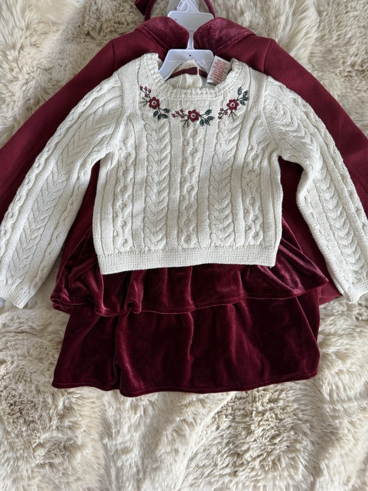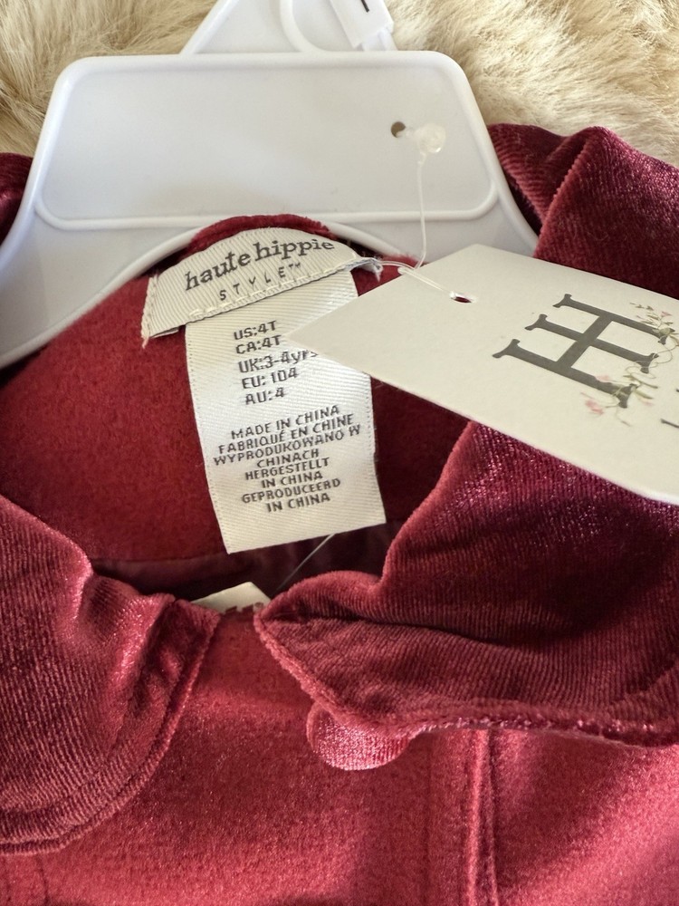 Elegant girls’ set by Haute Hippie Style. Includes: • Burgundy wool-blend coat with velvet collar, velvet buttons, and decorative bow • Burgundy velvet dress • Ivory cable-knit sweater with embroidered floral detail • Matching velvet headband Size / Age: 3–4 years Condition: New with tags Perfect for holidays, family events, photos, or special occasions.