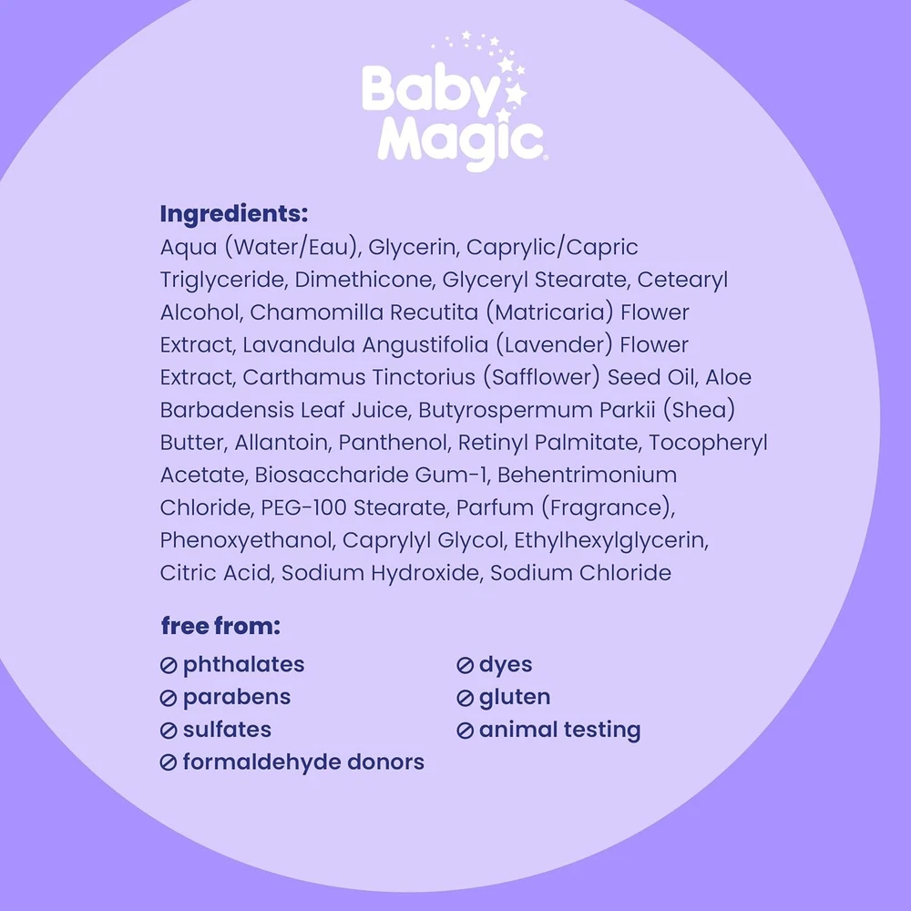 Baby Magic Calming Lotion | Helps Comfort and Relax 16.5 Fl Oz (Pack of 6) Product Details Product Dimensions : 8 x 6 x 8.5 inches; 7.5 Pounds Item model number : 705553 Manufacturer : Naterra International Inc. Country of Origin : USA Brand: Baby Magic Item Volume: 16.5 Fluid Ounces Item dimensions L x W x H: 8 x 6 x 8.5 inches Age Range (Description): Newborn,Infant,Toddler, child Special Feature: Hypoallergenic, Calming Use Baby Magic Lavender And Chamomile Lotion as part of your bedtime routine to help whisk baby away into a sweet slumber and stay asleep longer. Nighty-night! Each Baby Magic product is specially formulated for baby’s sensitive and delicate skin. Featuring nourishing formulas, comforting scents, and wholesome ingredients. To use: Gently massage Baby Magic Lavender Baby Lotion all over baby's body to soothe and relax. Apply lotion after using Baby Magic Lavender and Chamomile nighttime baby bath to complete your bedtime routine. Baby Magic Calming Lotion contains no parabens, phthalates, dyes and or sulfates. Dermatologist recommended and hypoallergenic for the sensitive skin of infants, from newborns to toddlers. Made in the USA, Baby Magic is a family-owned and operated business that has been delivering quality products at an affordable price to loving parents for more than 70 years. The perfect companion to a nighttime bath is calming baby Lotion to help baby wind-down into a sweet slumber. Specially formulated with soothing Lavender and Chamomile, the hydrating lotion helps keep skin kissably soft for a magical morning. Sleep tight!