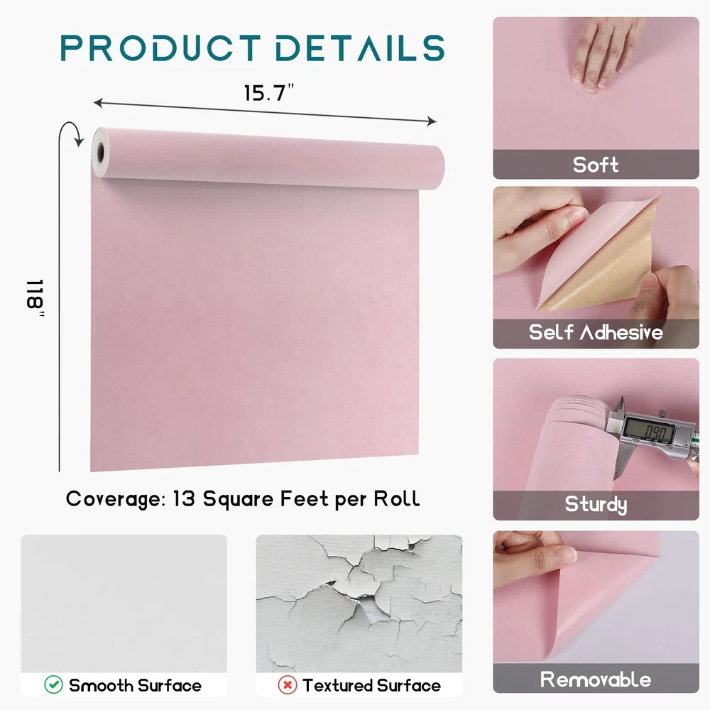Theme: Velvet Flocking Liner Brand: Does not apply Package Dimensions LxWxH: 16.06x2.48x2.44 Inches gtin13: Does not apply Weight: 1.87 Pounds Material: Self Adhesive Velvet Fabric Drawer Liner Pattern: Solid Type: Does not apply MPN: Does not apply Number Of Pieces: 1 Color: Baby Pink Item Shape: Roll Style: Luxurious Model: Does not apply Unit Count: 1852.6 UPC: Does not apply Size: 15.7"W X 118"L