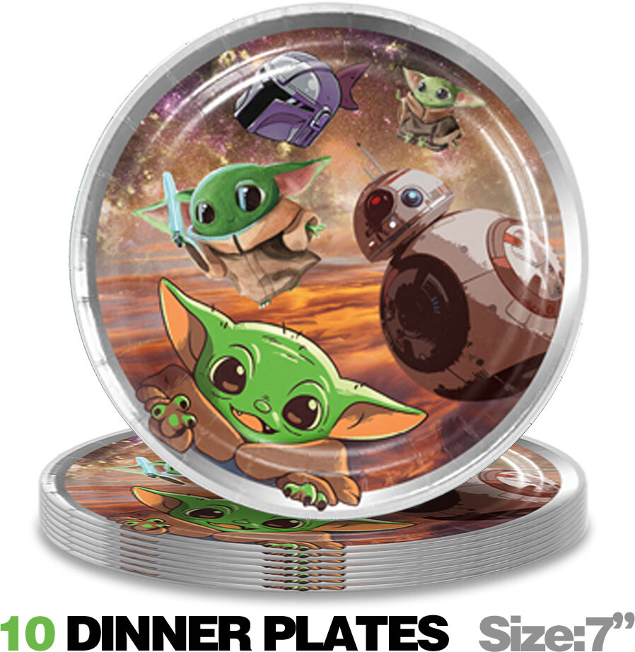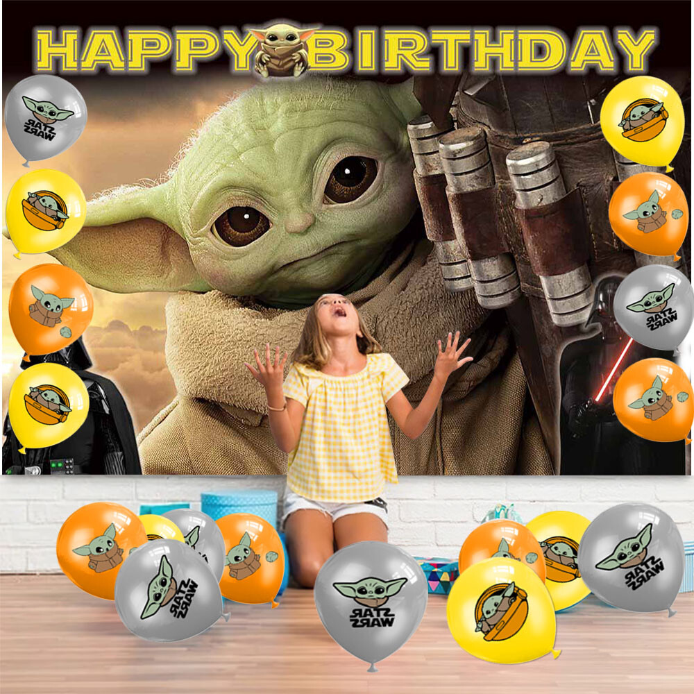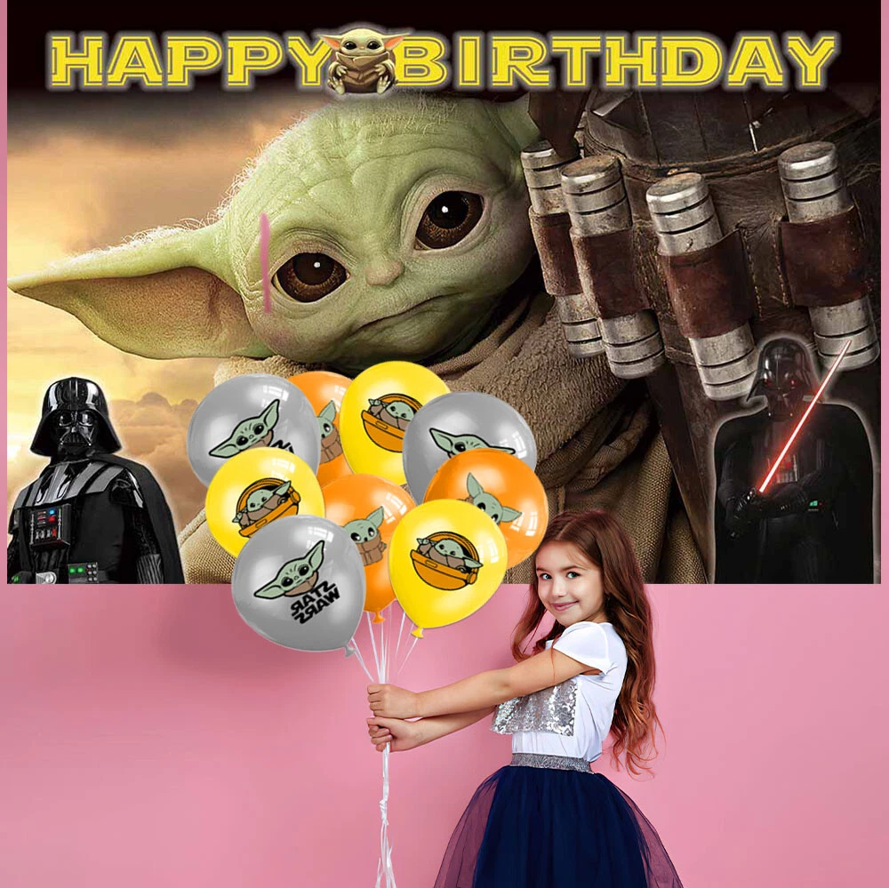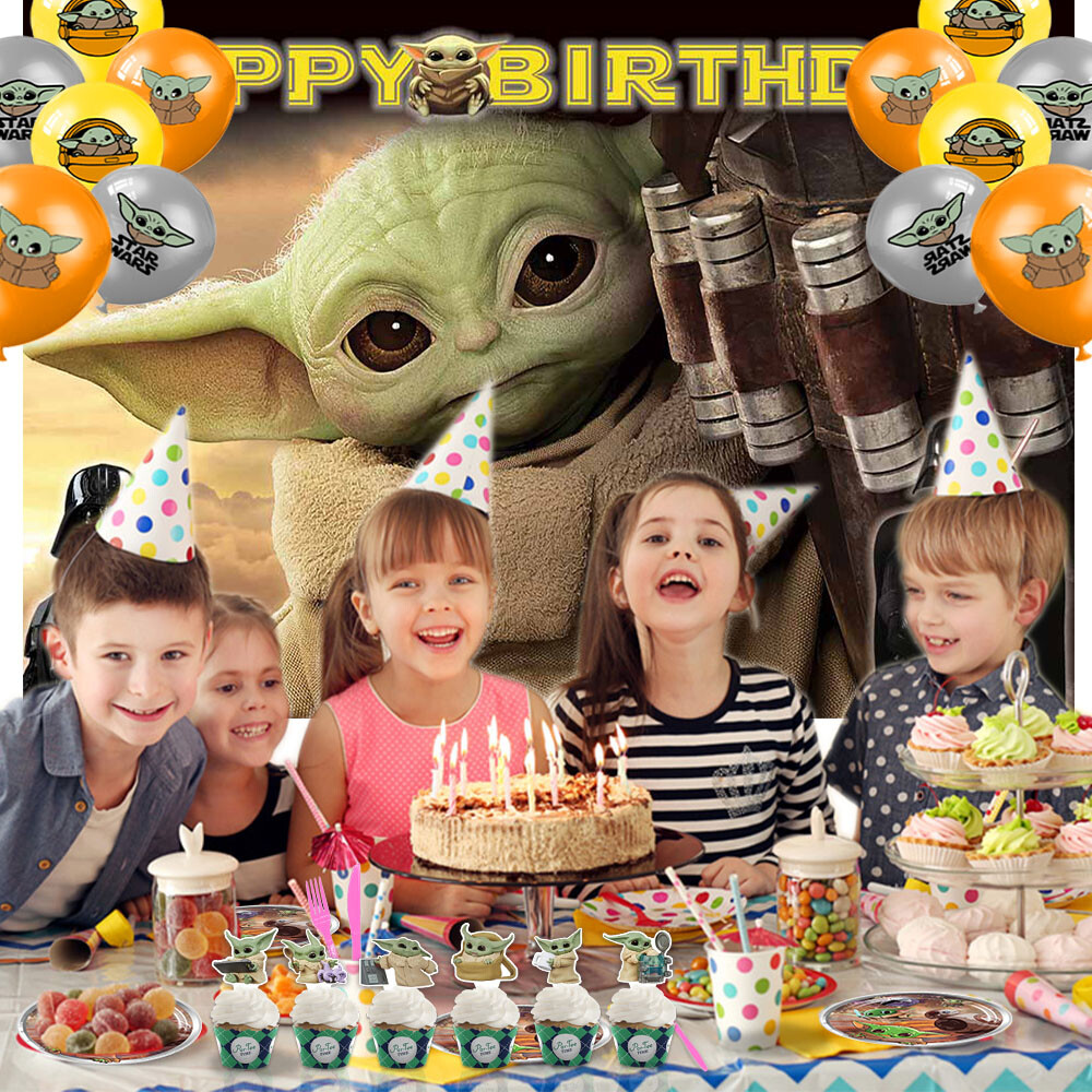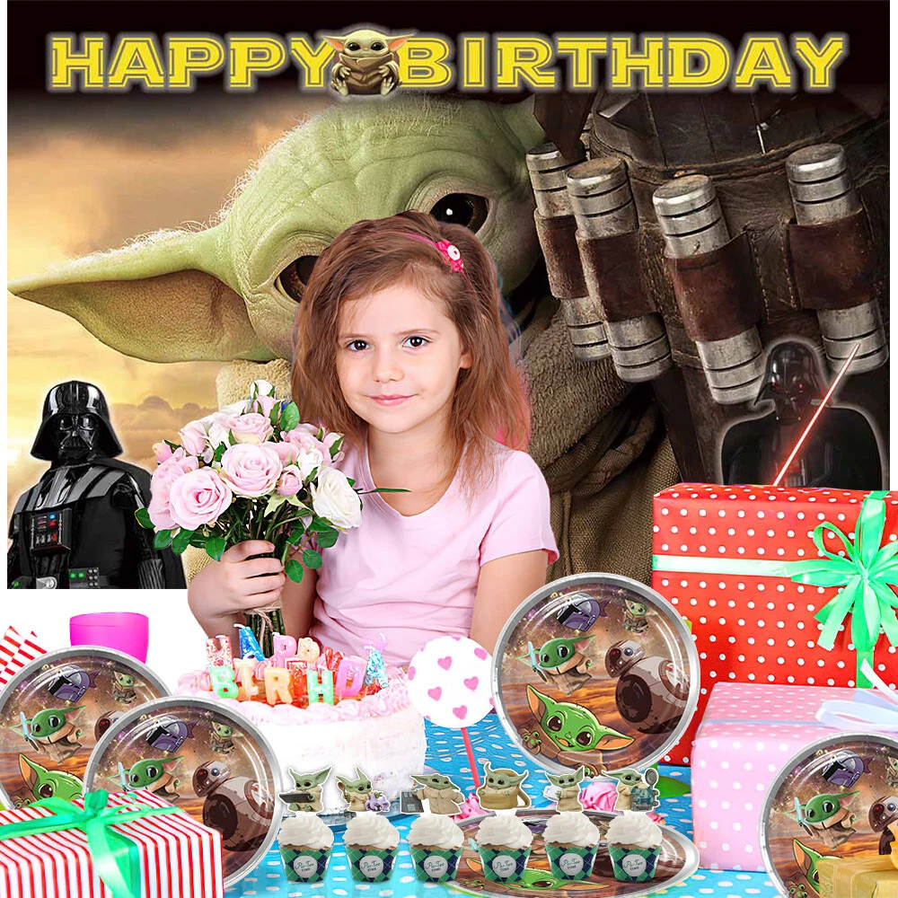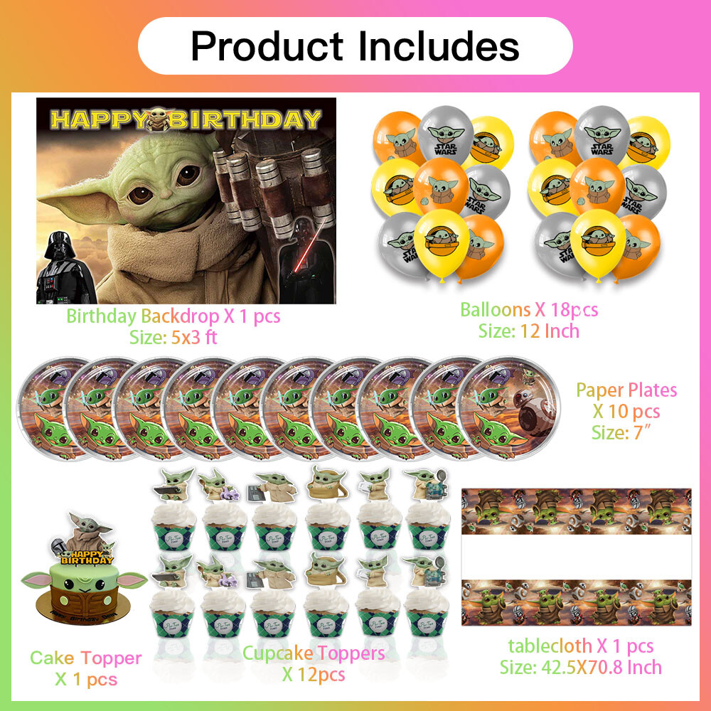 About this item 【Themed Sets of Matching Units】: ☰ Take this good favor for themed party to impress your kids and their friends. ☰ Enrich your kids’childhood dream well,giving them a fantastic surprise. 【Party Decor Is So Easy】: ☰ It contains all of your Baby Yoda birthday party tableware needs and is completely disposable. ☰ You can save more time to enjoy this party with your guests. 【Real Savings For You】 ☰ The shiny large backdrop decor will attract you eyes and make everyone laugh.The banner cloth is printed in high definition, making it the perfect party background wall. It is made of thick cloth, not paper. ☰ You will save over 70% compared to buying 2 Baby Yoda party supplies separately. 【Super Value Baby Yoda Package】: ✪ 1PCS X Large Happy Birthday Banner 5x3ft(150x100cm) ✪ 10PCS X 7 Inch Thick Paper Plates. ✪ 18PCS Balloons. ✪ 1PCS X Cake Topper. ✪ 12PCS X Cupcake Toppers. ✪ 1PCS X Tablecloth. 【After Sale Service】: ☰ We try our best to bring the best use experience to our customers. ☰ If you are not satisfied with the purchase of this set or have any questions about the product,please contact us at any time.We will definitely solve the problem for you in the first time. ☰ We can also custom backdrop other size or pictures you want. Any questions please contact us.
