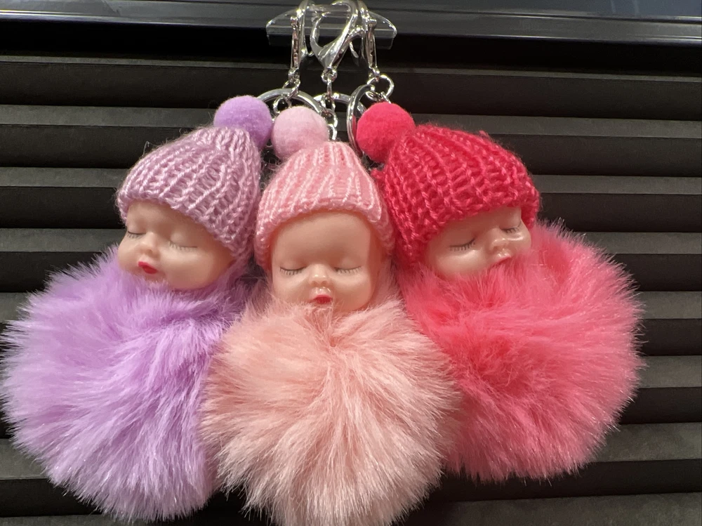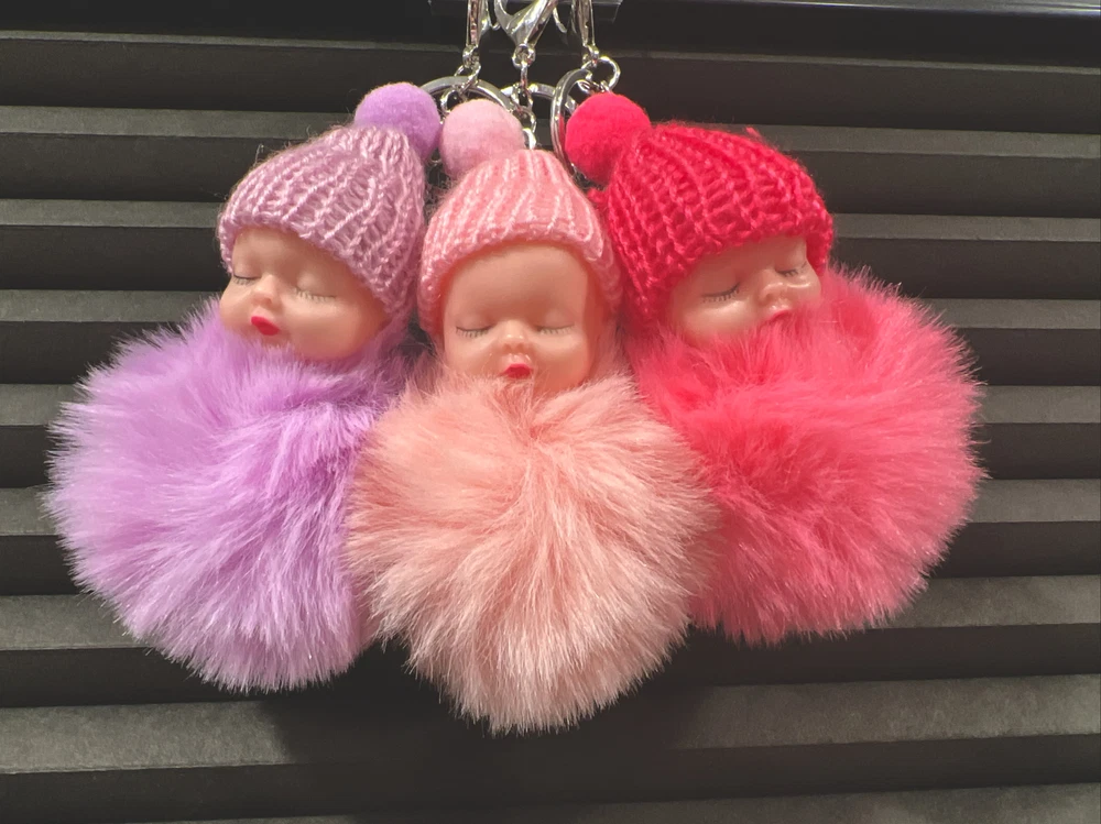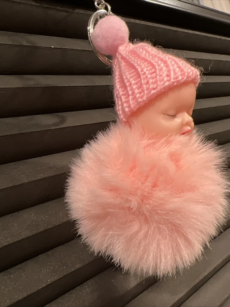 This keychain is a lovely way to honor a new mother or an expectant mother. It is a cute accessory that can be fastened to a baby bag, a mother's hospital bag, or used as decoration for a diaper bag or diaper cake. The keychain features an enchanting sleeping baby wrapped in a cozy blanket (pom pom) and wearing an adorable knitted hat.