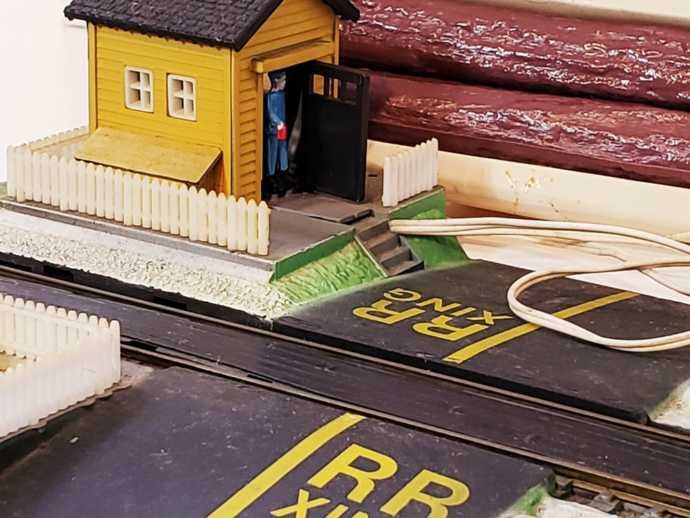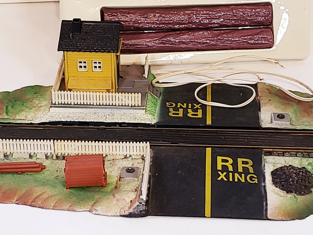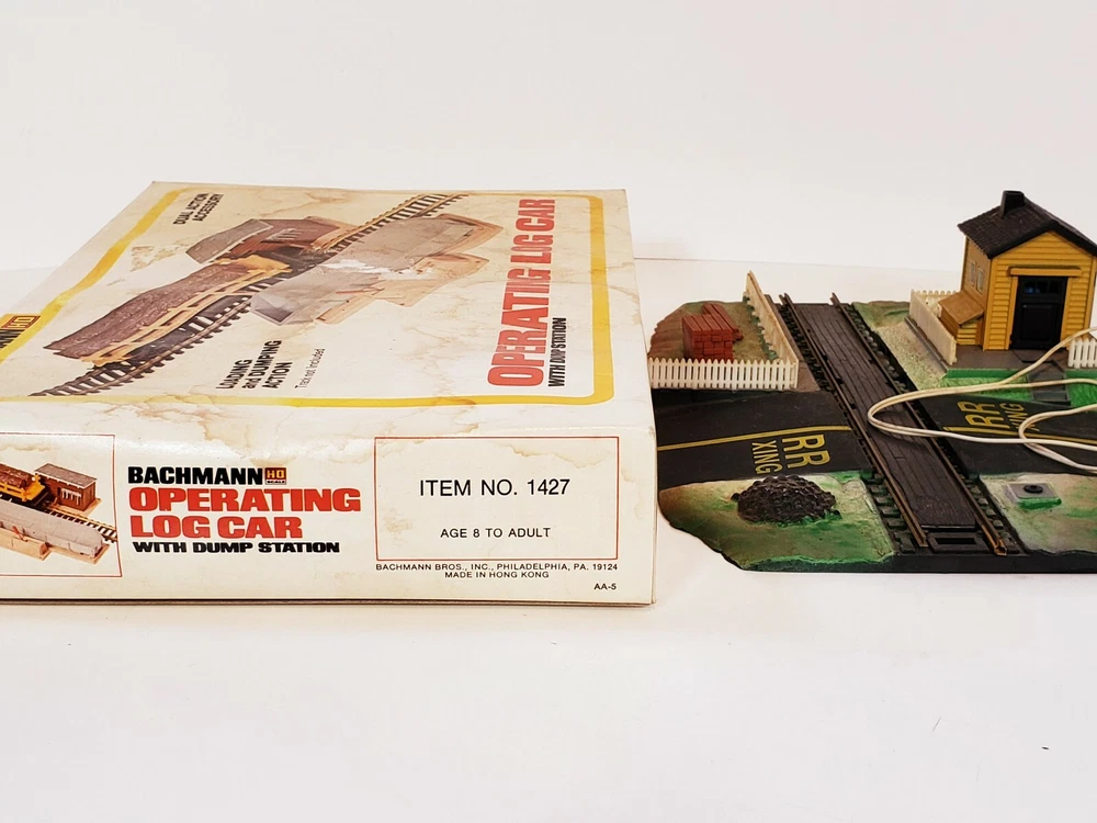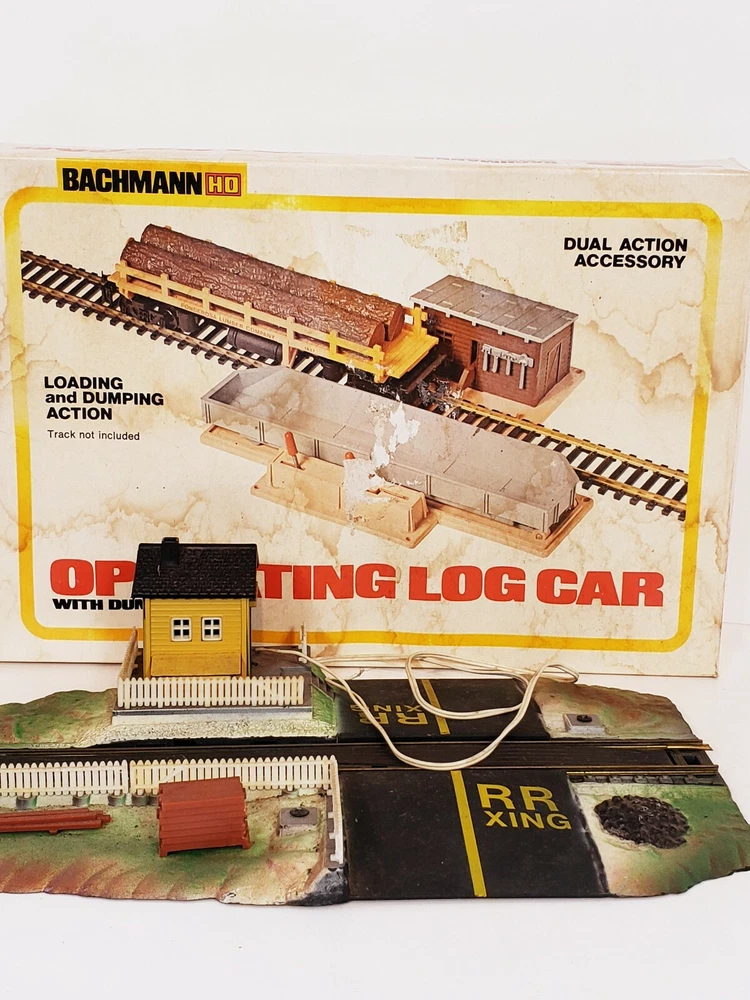 Life Line R.R. Crossing Bachmann Operating Log Car With Dump Station . HO scale both included on the Railroad crossing when the train comes rolling in the door opens at the little house and a person figure comes out pretty neat the two R.R . Signs at the road are broken off so be carefull when approaching make sure you look both ways . The operating log car with dump station hardly used with loading and dumping action is complete . The front of the box has some staining.