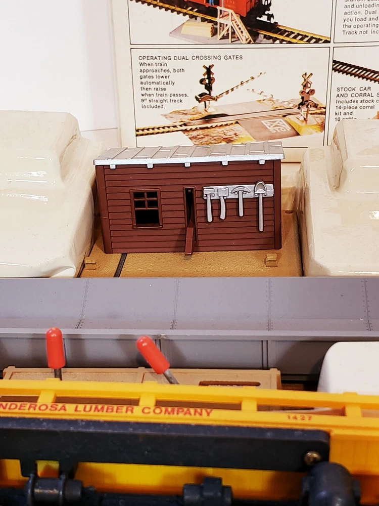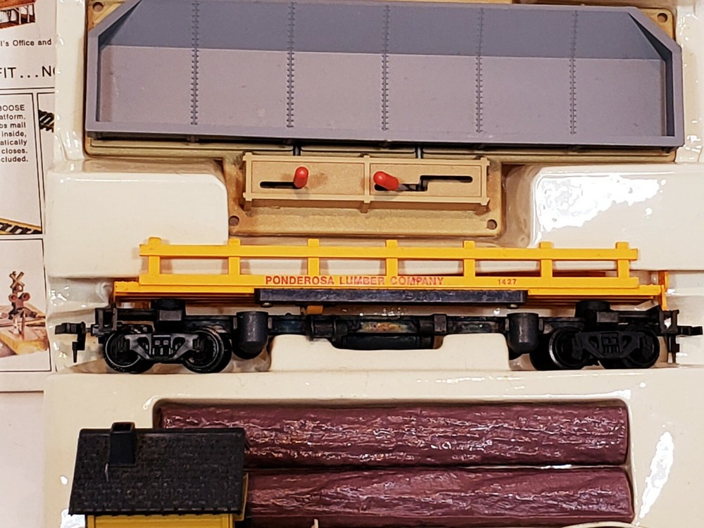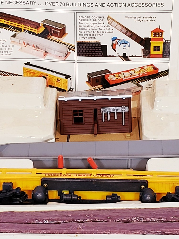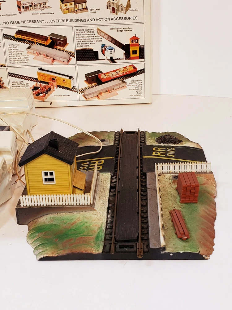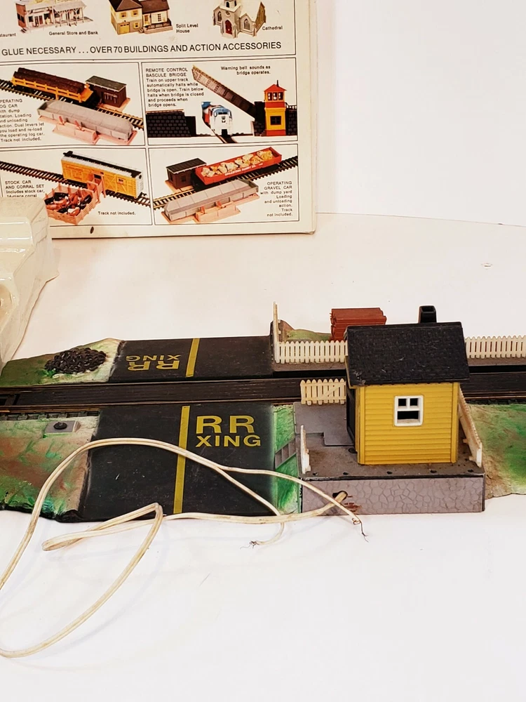This HO scale set is a fun and detailed addition to any model railroad! The operating log car dumps smoothly, and the tiny figure popping out of the house when the train arrives is a charming touch. Just a heads-up—the crossing signs arrived broken, but everything else works perfectly. The box has some stains, but the pieces inside are barely used and in great condition. A unique, interactive feature for enthusiasts!