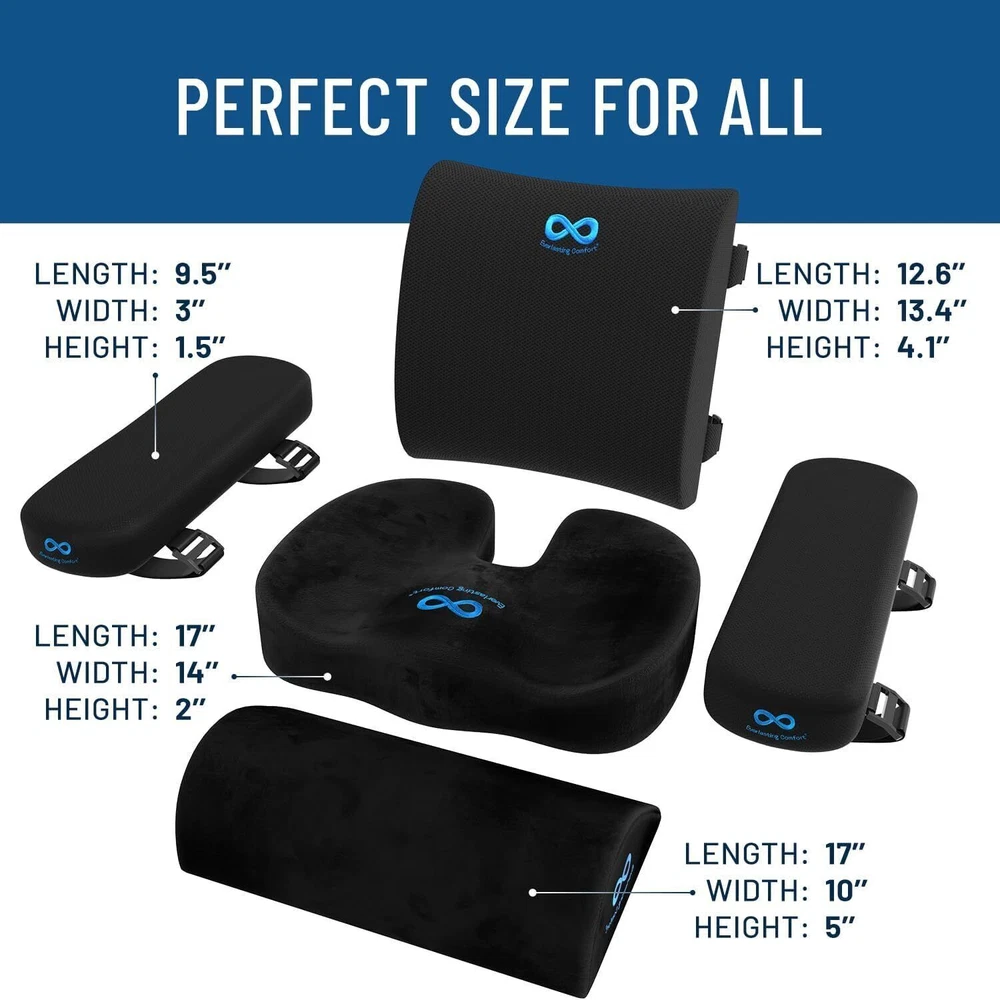 Special Feature Contoured Shape, Breathable Material, Lumbar Support, Ergonomic Design, High-Density Memory Foam Color E. Black (Seat/Back/Footrest/Armrest) Size Standard Cushion Sets Fill Material Memory Foam About this item All Day Support: Enjoy lasting comfort during 8+ hr workdays with our seat cushion for desk chair. Made with premium memory foam, the computer chair cushion contours to your bottom using body heat while never flattening Provides Supportive, Cooling Comfort: Ergonomically designed, our armrest pad uses premium memory foam with a cooling gel insert top layer, creating a comfortable base for your arms to rest easy while driving or working Instant Back Pain Relief Chair Pillow: The lumbar support cushion offers ergonomic design to promote proper posture, relieve pressure and provide necessary chair back support for a comfortable workday Complete Office Setup: Upgrade your office space with our premium bundle featuring our ergonomically designed back cushion, seat cushion, foot rest, and arm rest pads, perfect for providing superior support throughout your day Unique Teardrop Shape: Our foot stool has a teardrop shape that is specifically tailored to mimic the curves of your feet arches, providing maximum comfort and support while sitting at your computer Special Feature Contoured Shape, Breathable Material, Lumbar Support, Ergonomic Design, High-Density Memory Foam Color E. Black (Seat/Back/Footrest/Armrest) Size Standard Cushion Sets Fill Material Memory Foam Shape Rectangular Age Range (Description) All Life Stages Recommended Uses For Product Sitting, Traveling, Recovery, Resting Use for Shoulder, Back, Neck, Body, Leg Material Memory Foam Item Firmness Description Medium Product Care Instructions Remove cover from memory foam. Cover is machine washable on a gentle cycle with cold water. Dryer safe (low heat) or air-dry setting. DO NOT PUT MEMORY FOAM IN WASHER OR DRYER. Number of Pieces 4 Pattern Solid Material Feature Breathable Variety Lumbar Pillow,Lumbar Support,Seat Cushion,Foot Rest,Arm Rest Material Type Free Latex Free Fabric Type Polyester Model Name Cushion Set Black (Seat/Back/Footrest/Armrest) Specific Uses For Product Posture Support, Lumbar Support, Added Comfort, Office Chair Support, Car Seat Support UPC 810062782192 Unit Count 1.0 Count Item Weight 5.44 pounds Package Dimensions 17.25 x 13.25 x 11.5 inches