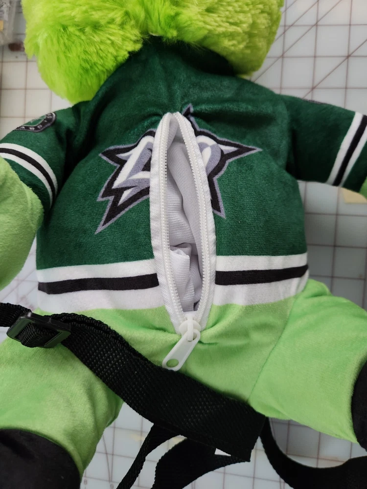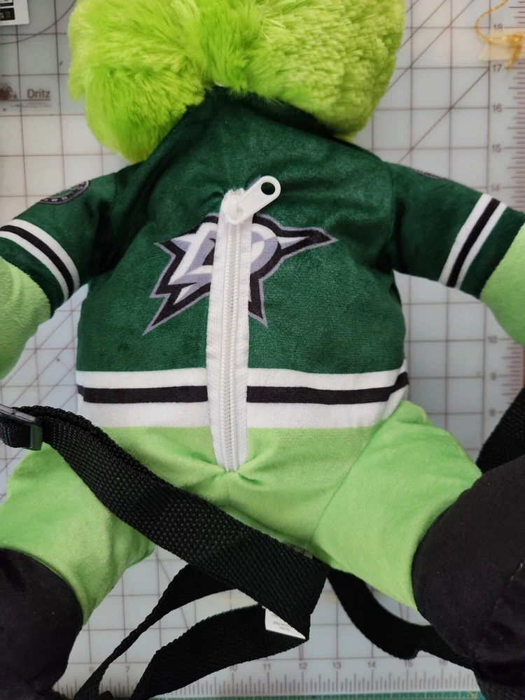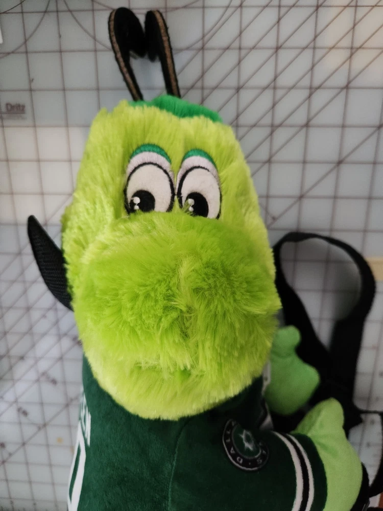 This is a 17" green backpack featuring the Dallas Stars' mascot, Victor E. Green, as a plush toy. The backpack is an officially licensed product of the National Hockey League (NHL) and is made by FOCO. It is designed for regular season use and is perfect for hockey fans who want to show their support for the team.