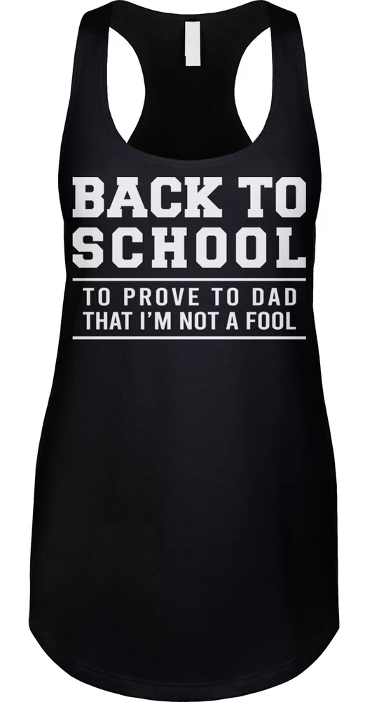 Back To School To Prove To Dad That I'm Not A Fool ITEM DESCRIPTION Please check the sizing chart to make sure the size of the garment you select will be a comfortable fit. Womens Racerback Tanks are a 60% Combed Ringspun Cotton/40% Polyester blend for a light and comfortable fit. Design is printed on the front of the tank as pictured. The back of the tank will be blank. Garment is fully machine washable. Best washing instructions are to wash the garment inside out, in cold water with like colors, and lay flat to air dry or on low heat to preserve the life of the garment. **** PLEASE CHECK THE SIZING CHART TO ENSURE THE RIGHT FIT. **** Womens Racerback Tank Sizing Chart Tank Width Tank Length Small 15 Inches 27.5 Inches Medium 16 Inches 28 Inches Large 17 Inches 28.5 Inches Extra Large/XL 18 Inches 29 Inches 2XL/XXL 19 Inches 29.5 Inches **** Please note: Size specifications are approximate because of variations in the manufacturing process. ****