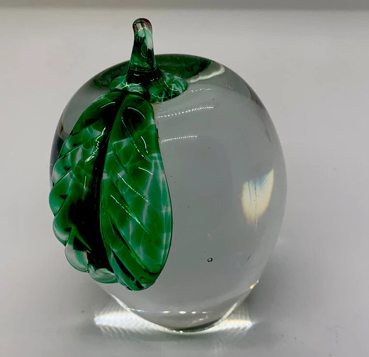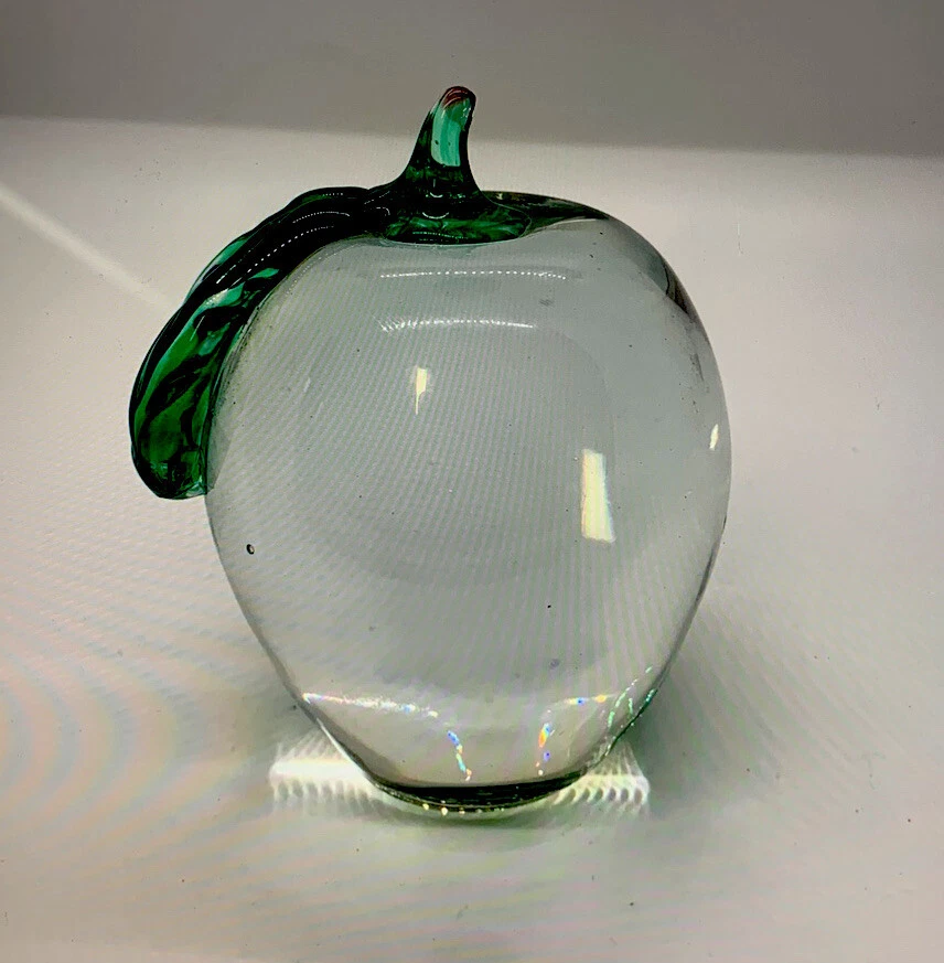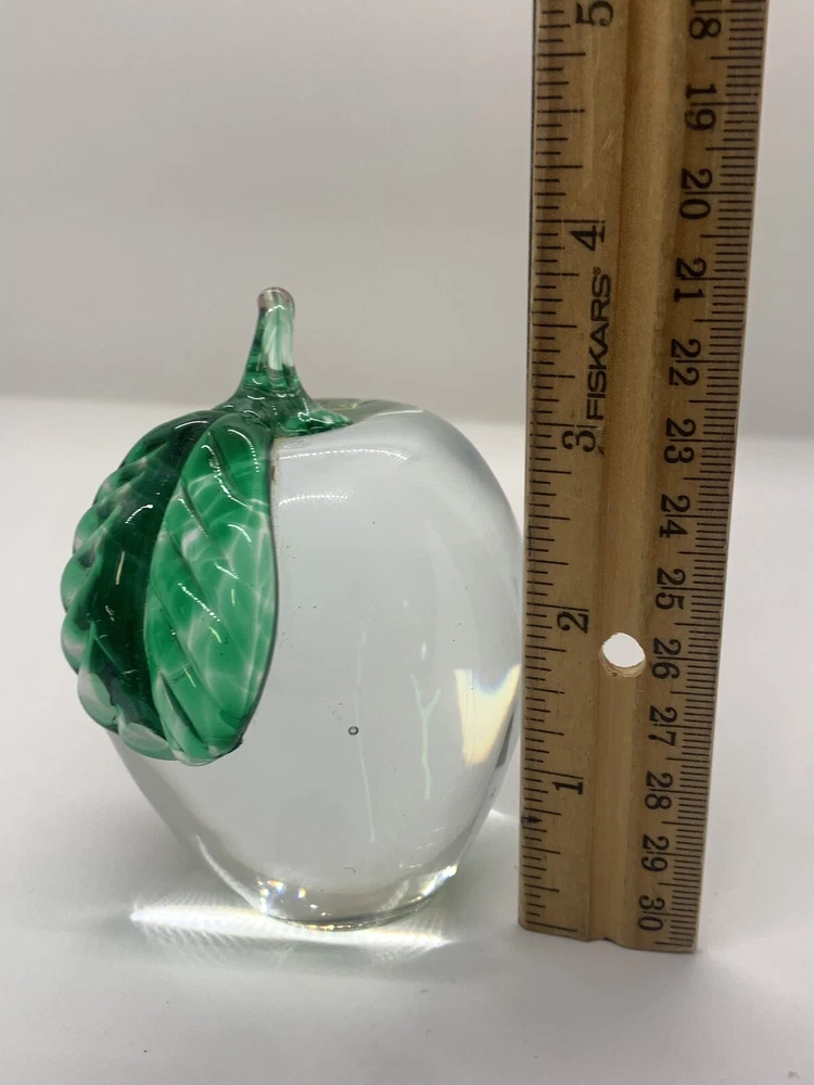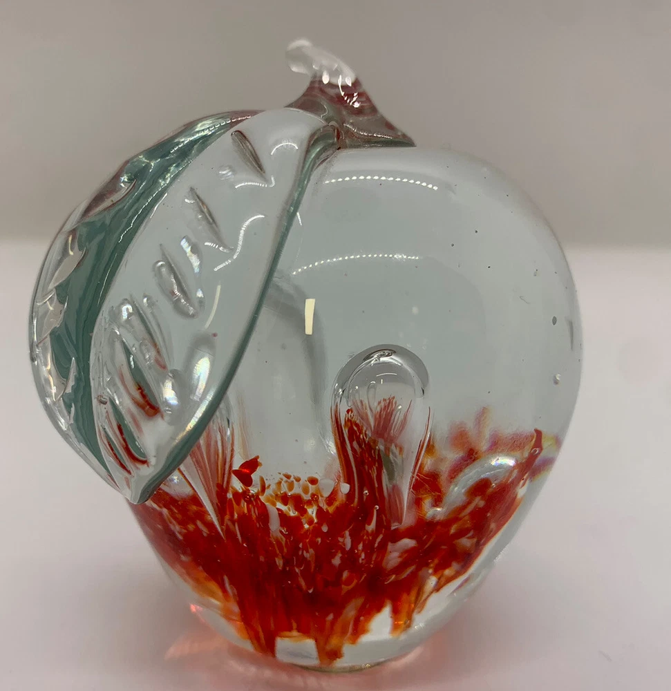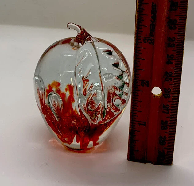 This set of apple paperweights is perfect for any back to school season. The paperweights come in two different sizes, one measuring 4 inches in height and the other measuring 3 inches in height. The clear apple paperweight features green leaf while the red apple paperweight has red bubbles. Both paperweights are made of hand blown glass and have an apple theme. These vintage paperweights are a great addition to any collection or desk decor. Very good condition no cracks or scratches