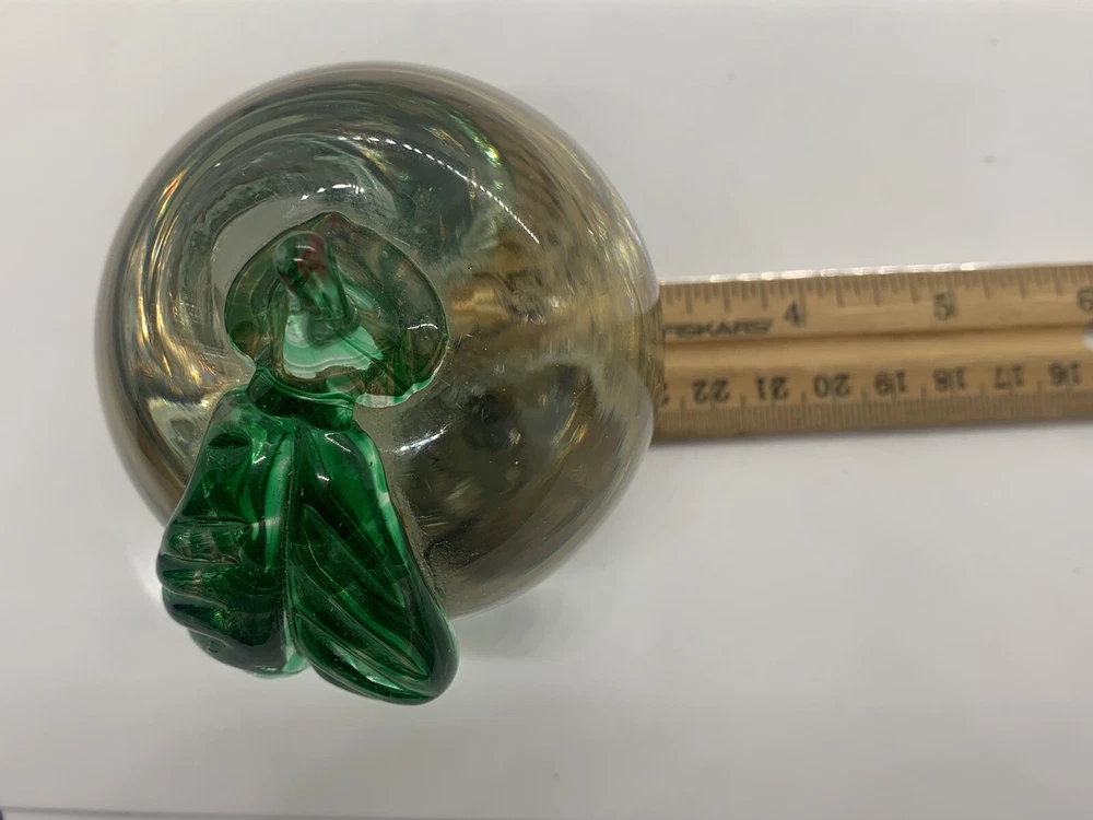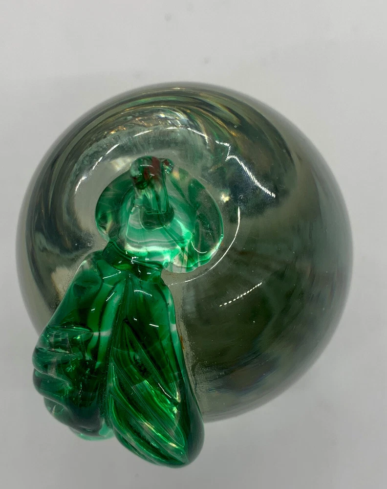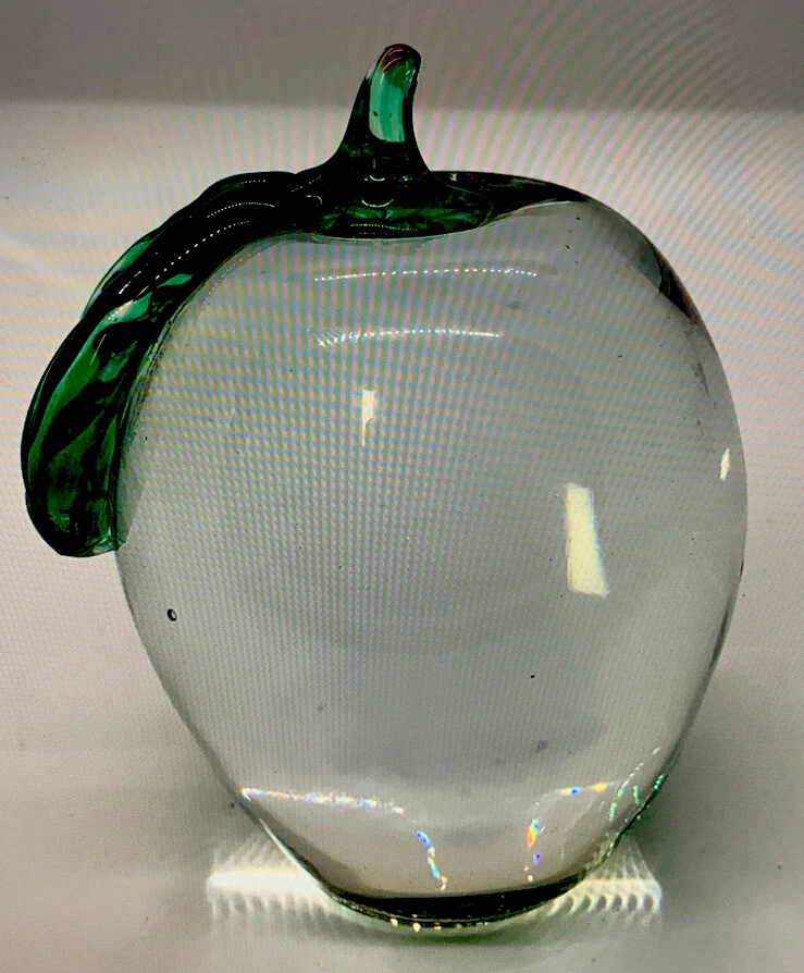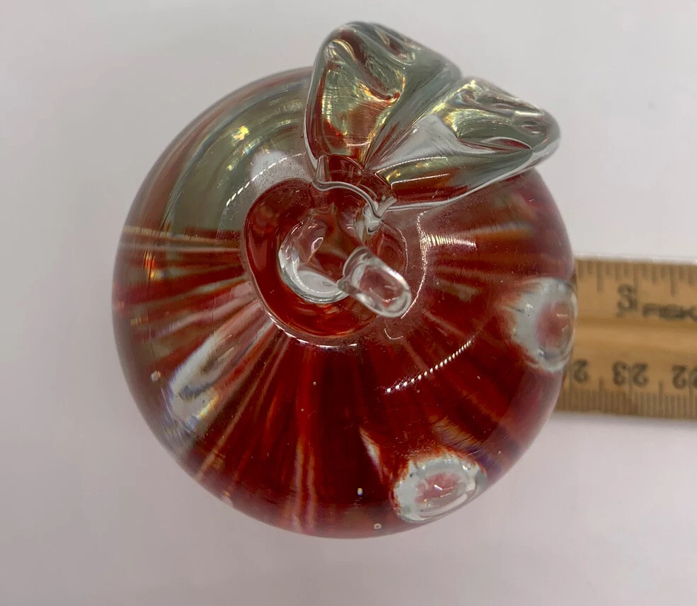 This set of apple paperweights is perfect for any back to school season. The paperweights come in two different sizes, one measuring 4 inches in height and the other measuring 3 inches in height. The clear apple paperweight features green leaf while the red apple paperweight has red bubbles. Both paperweights are made of hand blown glass and have an apple theme. These vintage paperweights are a great addition to any collection or desk decor. Very good condition no cracks or scratches