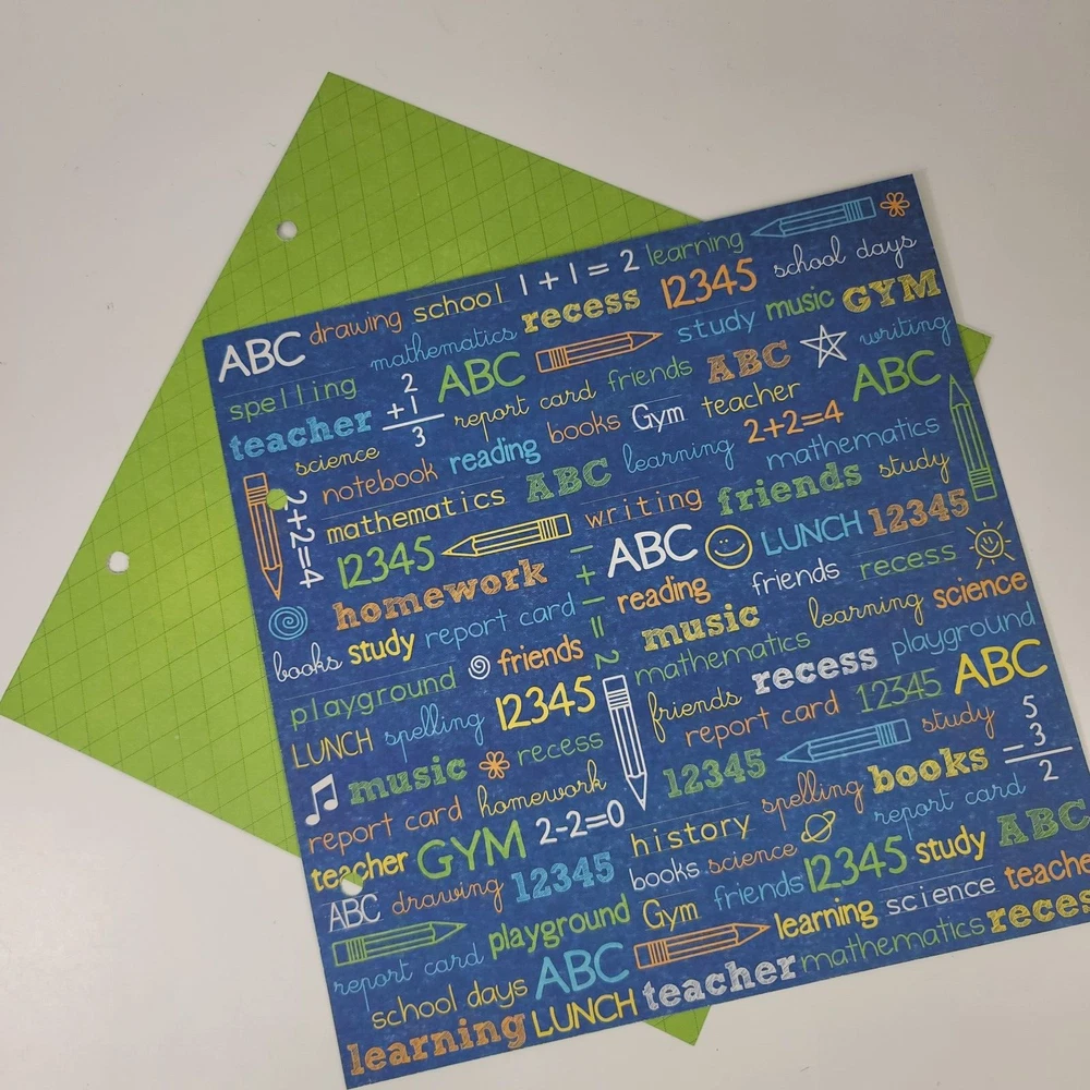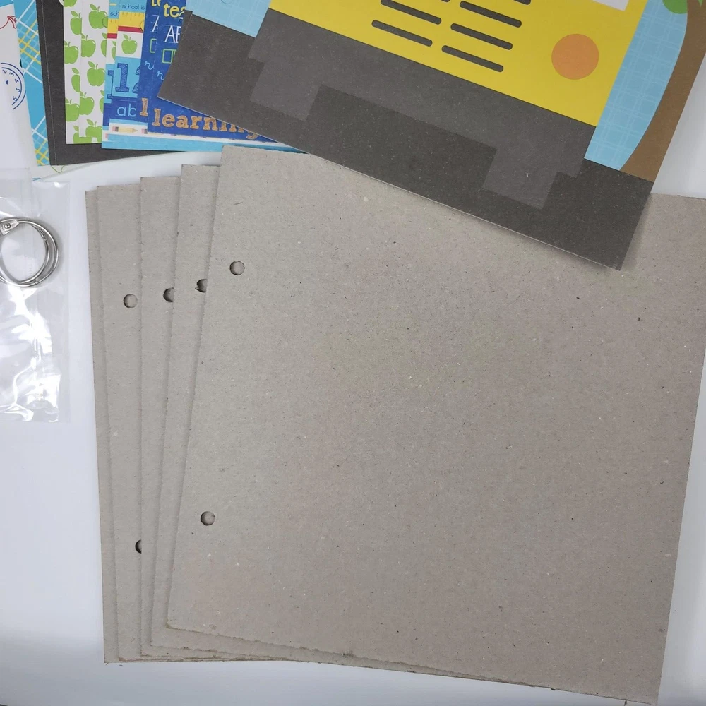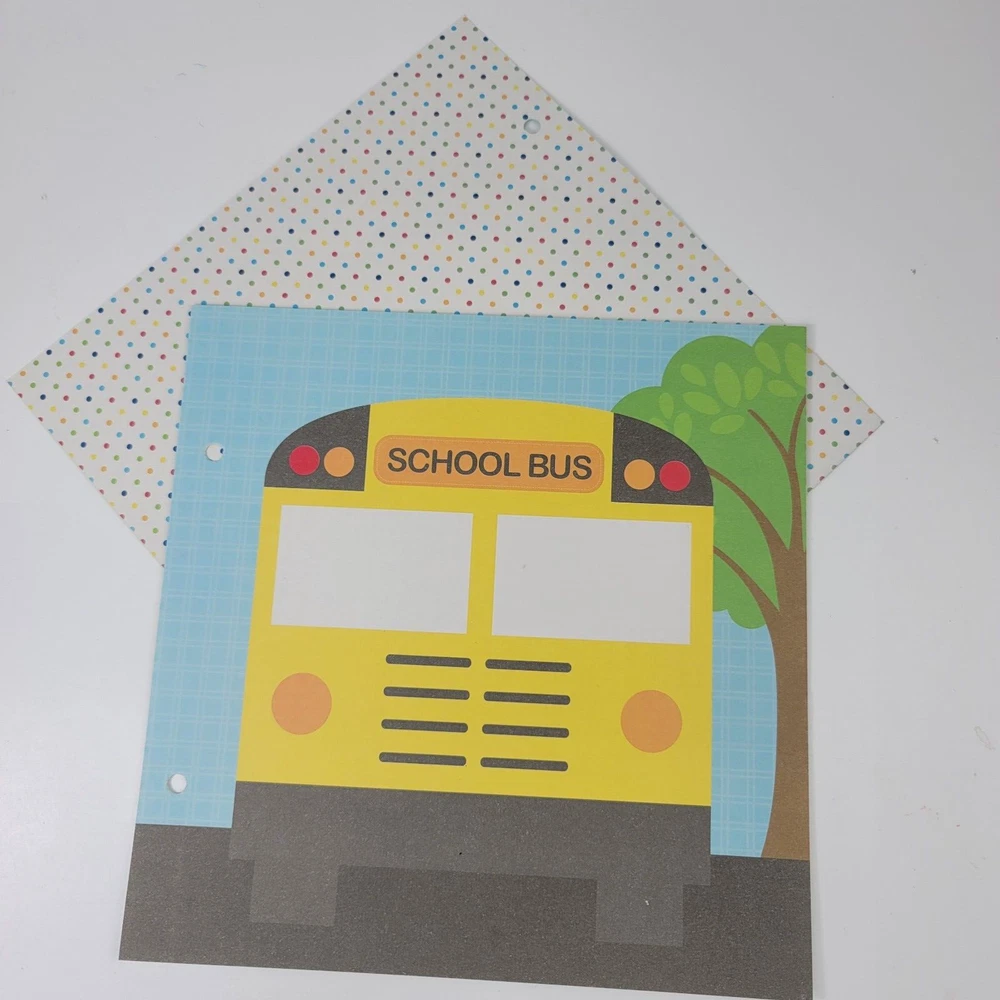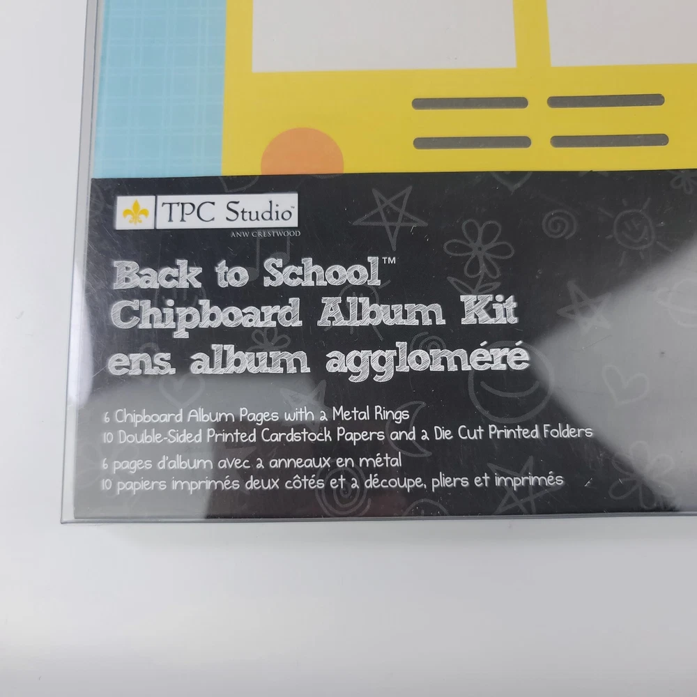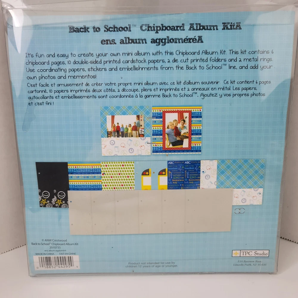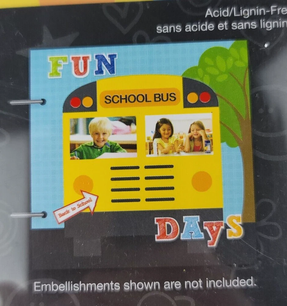 'Back To School' Bus Chipboard Album Kit: 6 Chipboard album pages, 2 Metal rings, 10 Double sided printed cardstock papers and 2 Die cut printed folders. Album measures 8" x 8". The kit is new, packaging has wear from storage. This kit is stored in a smoke/pet free home. Please buy with confidence that we will strive to make this an excellent transaction and you will enjoy your item. Please notice no returns. Thank you.