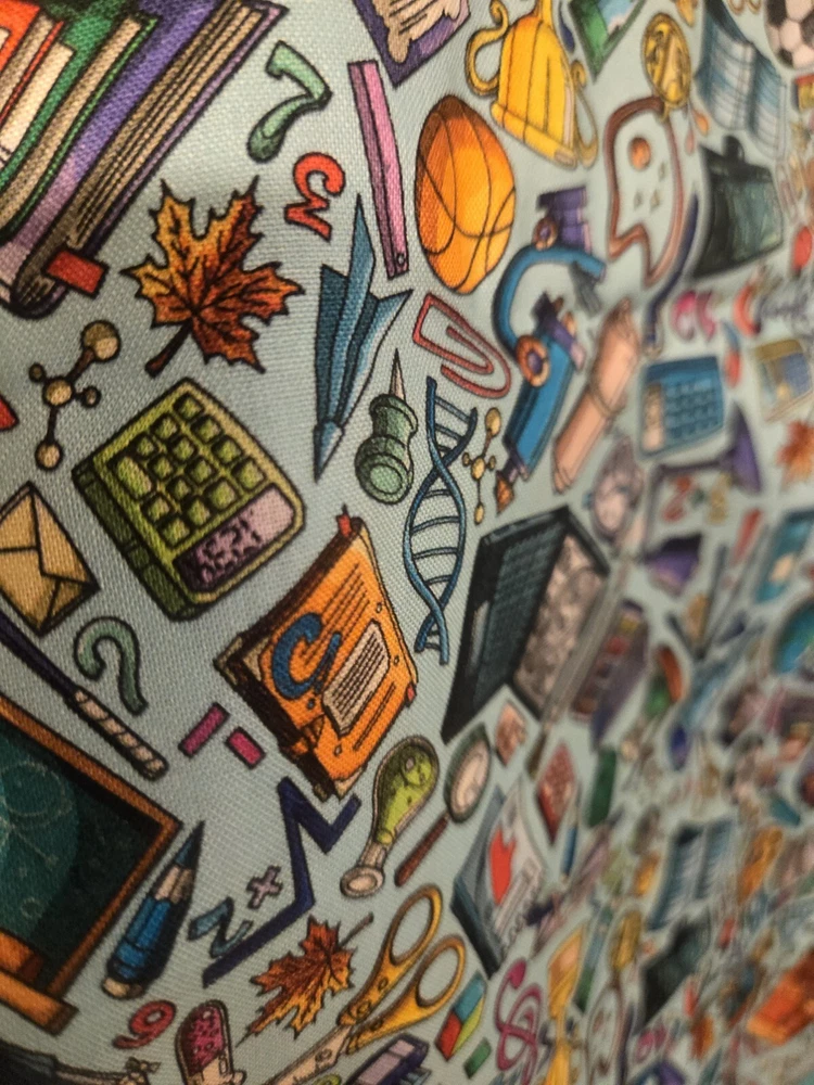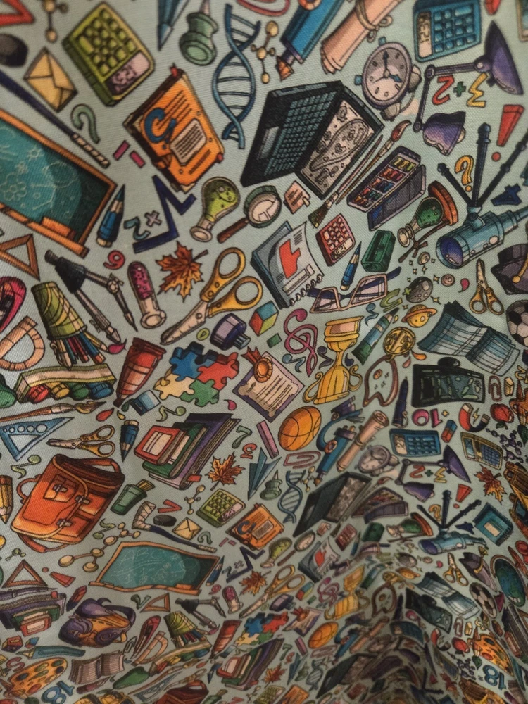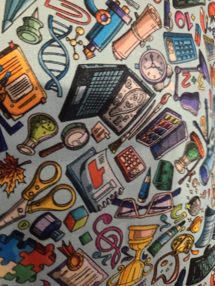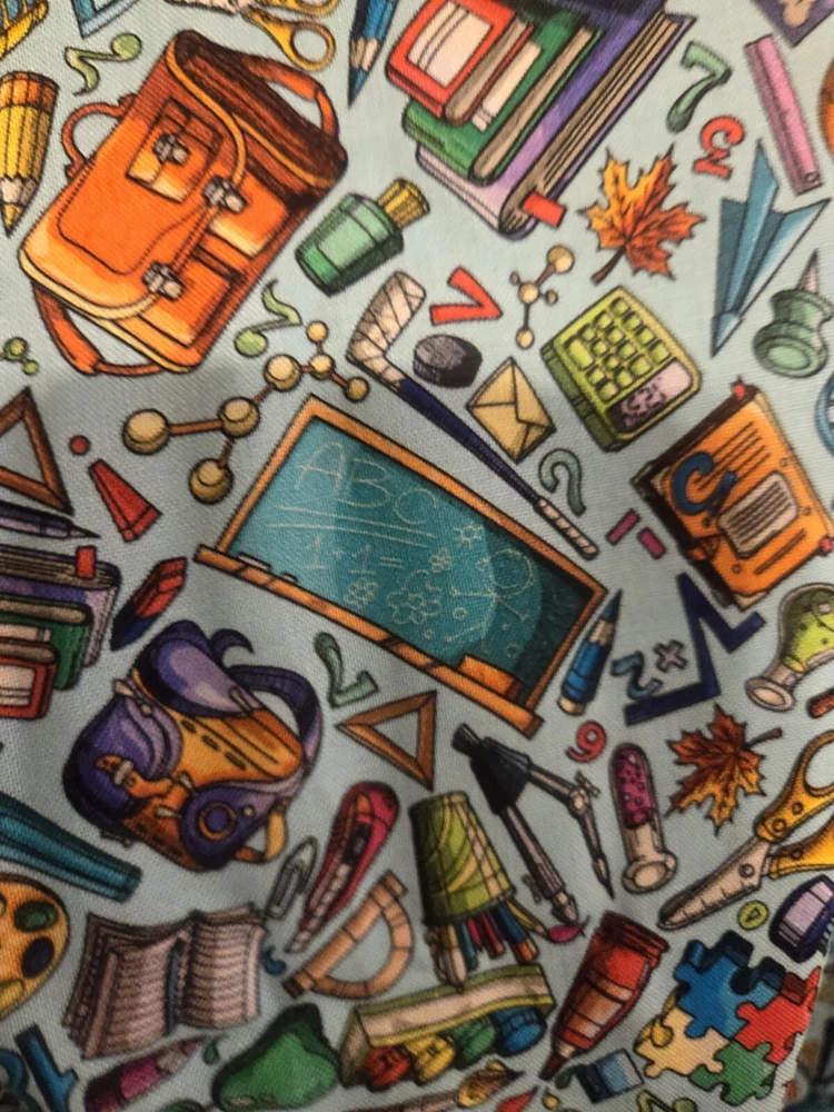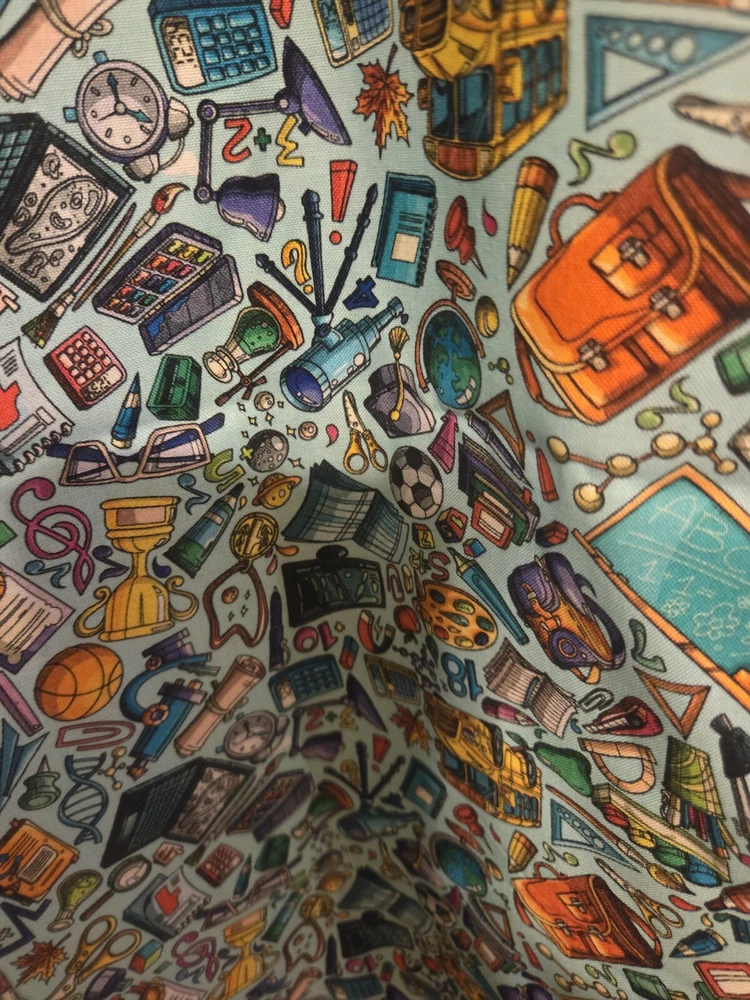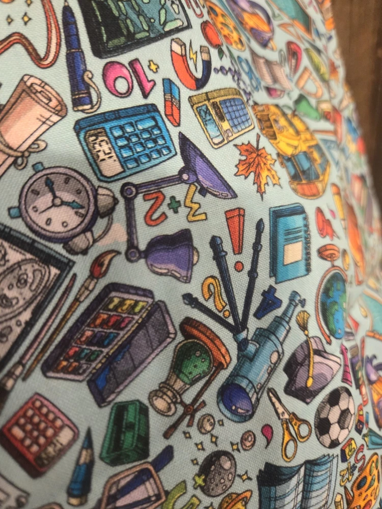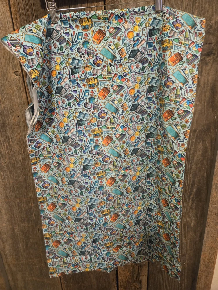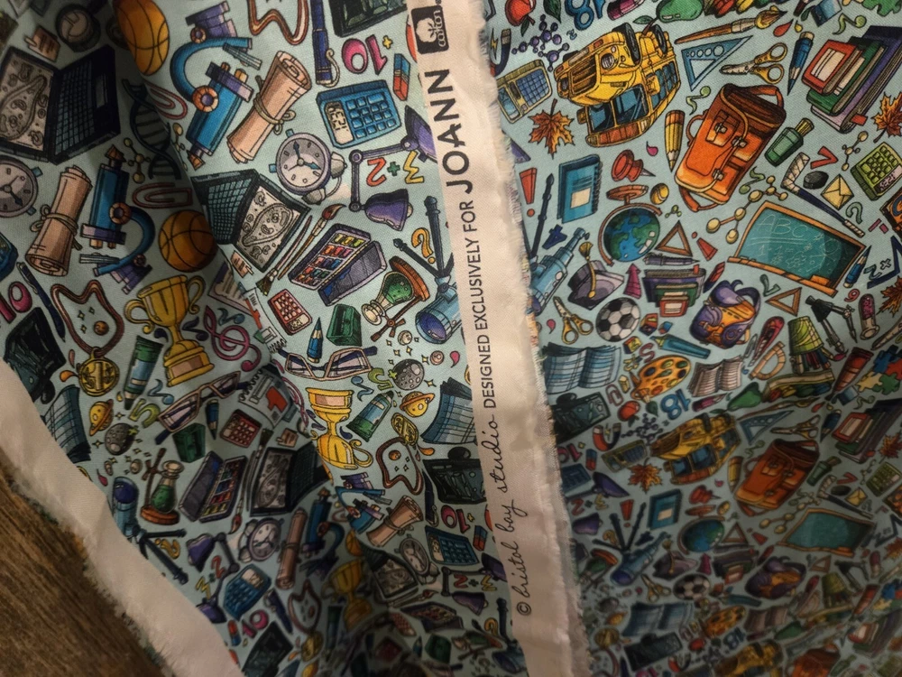 Length/Amount: 2 yards 44-45"? Fabric Weight: Medium Material: Cotton Unit of Sale: 2 yards Handmade: No Brand: Jo-Ann Suitable For: Crafts, Children, Quilting Features: fun Color: Multicolor Pattern: school stuff Width: 45" Theme: School