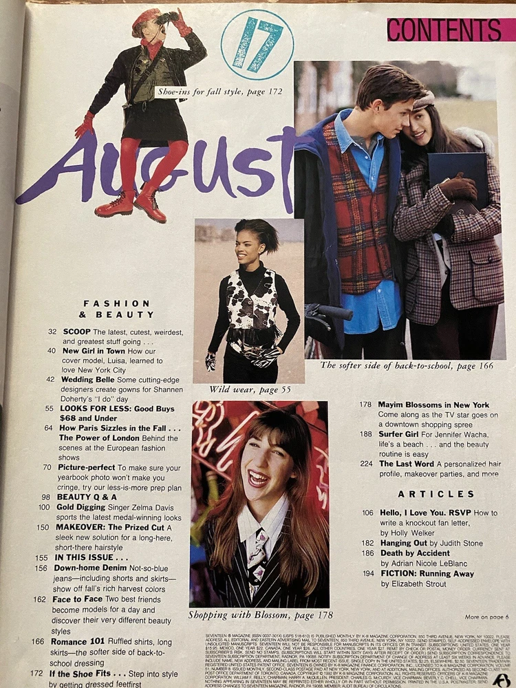 Back To School Issue Vintage Seventeen August 1992 Mayim Surfer Girls 90s Styles This issue has some wear to the cover and spine, and there’s a torn out subscription card and a torn out card for what looks like Columbia House records. I’ve shown it in the photos above, but I’m happy to take more and to answer any questions or provide more details. I really enjoy the Seventeens of the early 90s; I think there was a strong influence from Sassy magazine and zines in general, and parts of the magazine are really fun. The cartoon at the end is just great. I don’t have many 90s Seventeens, but I do have other magazines from the 90s and plenty of Seventeen magazines from other years for sale. I also still have some Sassy magazines for sale, and I can combine orders to save on shipping.