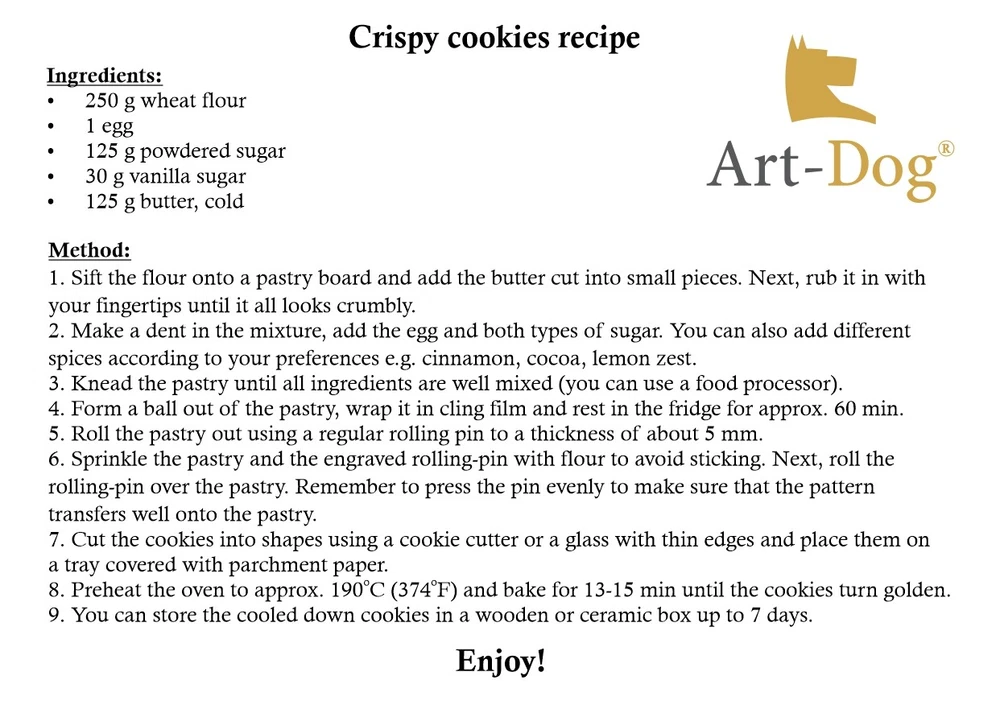 Back To School Rolling Pin Art-Dog The description of this item has been automatically translated. If you have any questions, please feel free to contact us. Back to School - engraved rolling wood for back lovers, Art -Dog brand The production of decorative cookies has never been as easy as with this engraved dough roll! Prepare the best cookies in a matter of seconds! We present a collection of engraved wooden dough rollers with original patterns. The high -quality dough rollers are made of beech wood. The engraving takes place perfectly with a professional cutting and engraving laser from Trotec. The dough roll is ideal for decorating baked goods such as cookies for every occasion. To achieve the best results, choose a dough that doesn't work when baking. Great fun for the whole family - create unique treats for your loved ones! This article is a great gift for birthdays, inauguration parties, Christmas and much more. Do you have your own idea for a dough roll? No problem for us! We can create everything you want - just contact us to clarify the details. Total width of the dough roller: 40 cm (15.74 inches) The production of decorative cookies has never been as easy as with this engraved dough roll! Prepare the best cookies in a matter of seconds! We present a collection of engraved wooden dough rollers with original patterns. The high -quality dough rollers are made of beech wood. The engraving takes place perfectly with a professional cutting and engraving laser from Trotec. The dough roll is ideal for decorating baked goods such as cookies for every occasion. To achieve the best results, choose a dough that doesn't work when baking. Great fun for the whole family - create unique treats for your loved ones! This article is a great gift for birthdays, inauguration parties, Christmas and much more. Do you have your own idea for a dough roll? No problem for us! We can create everything you wa Recommended products Provided by Dog Rolling Pin Art-Dog View item Dog Badge Rolling Pin Art-Dog View item Feathers Rolling Pin Art-Dog View item Zebra Rolling Pin Art-Dog View item Indian Rolling Pin Art-Dog View item Vacations Rolling Pin Art-Dog View item Hearts Rolling Pin Art-Dog View item Deers Rolling Pin Art-Dog View item Material Holz Marke Markenlos Produktart Halskette EAN 5906111249015