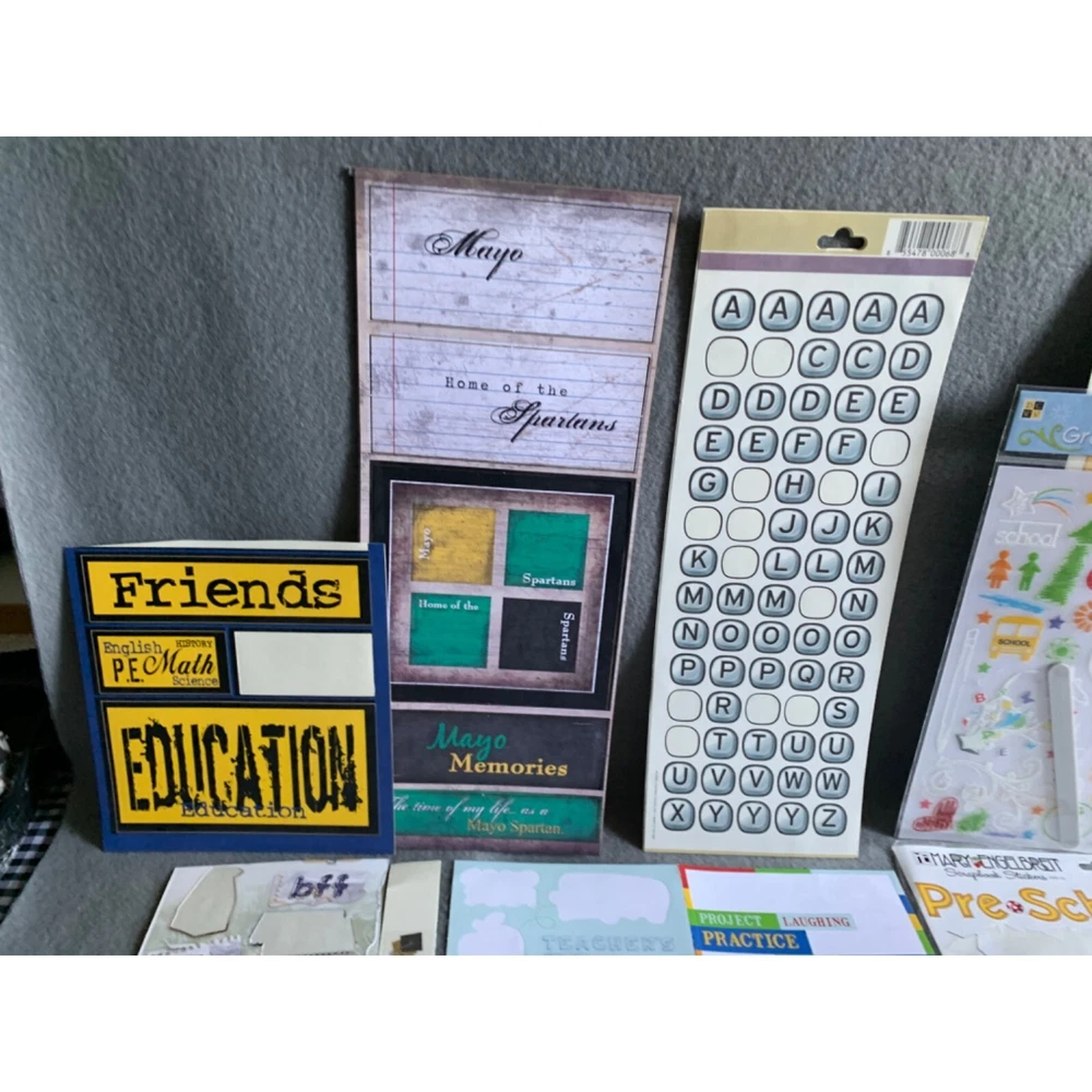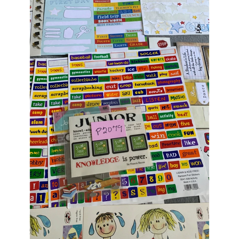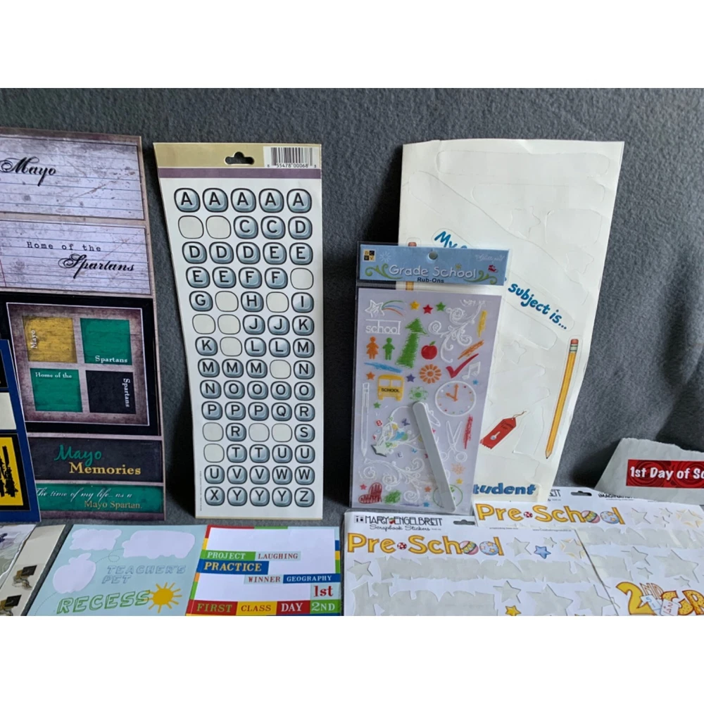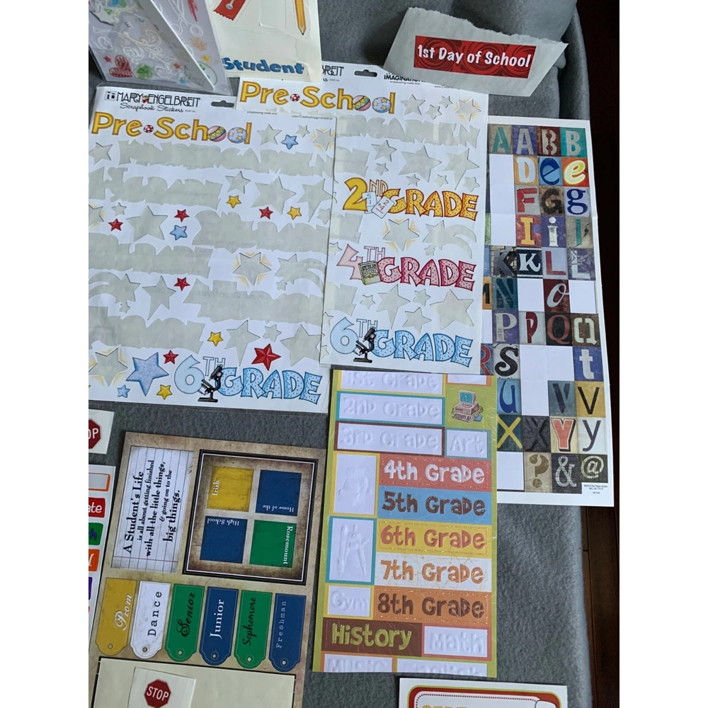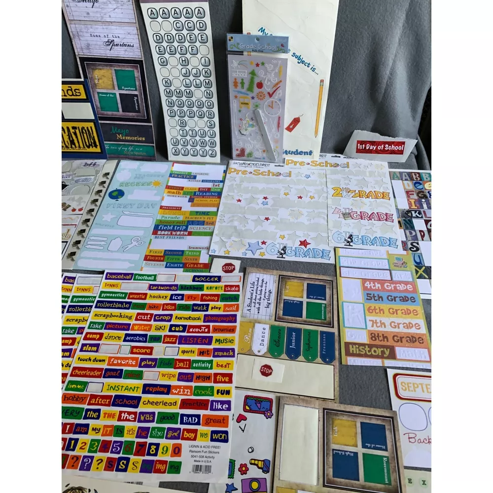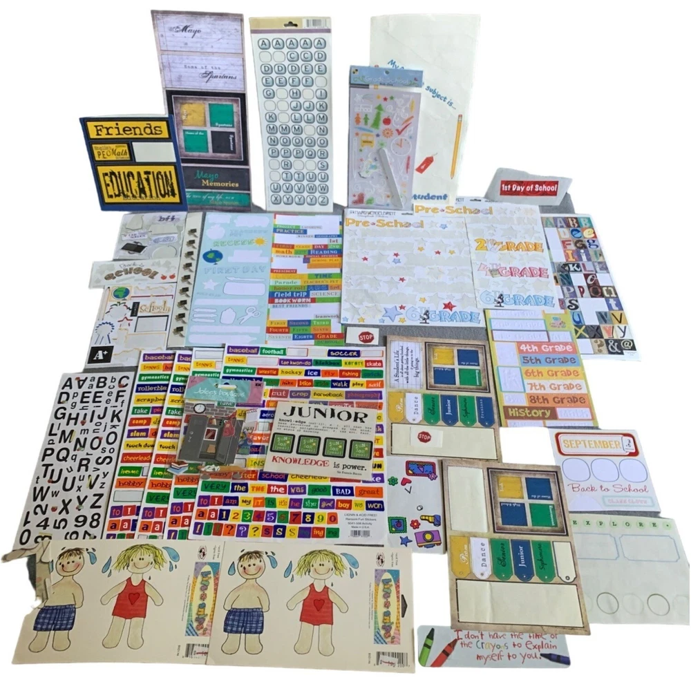 Comprehensive scrapbooking kit with various themed stickers, labels, and papers. Ideal for creating personalized back-to-school projects and memory books. • Assorted stickers • Grade-specific labels • Alphabet sheets • Scrapbook papers • Ideal for school projects Condition: Pre-Owned Like New Please review all photos as they are part of description.