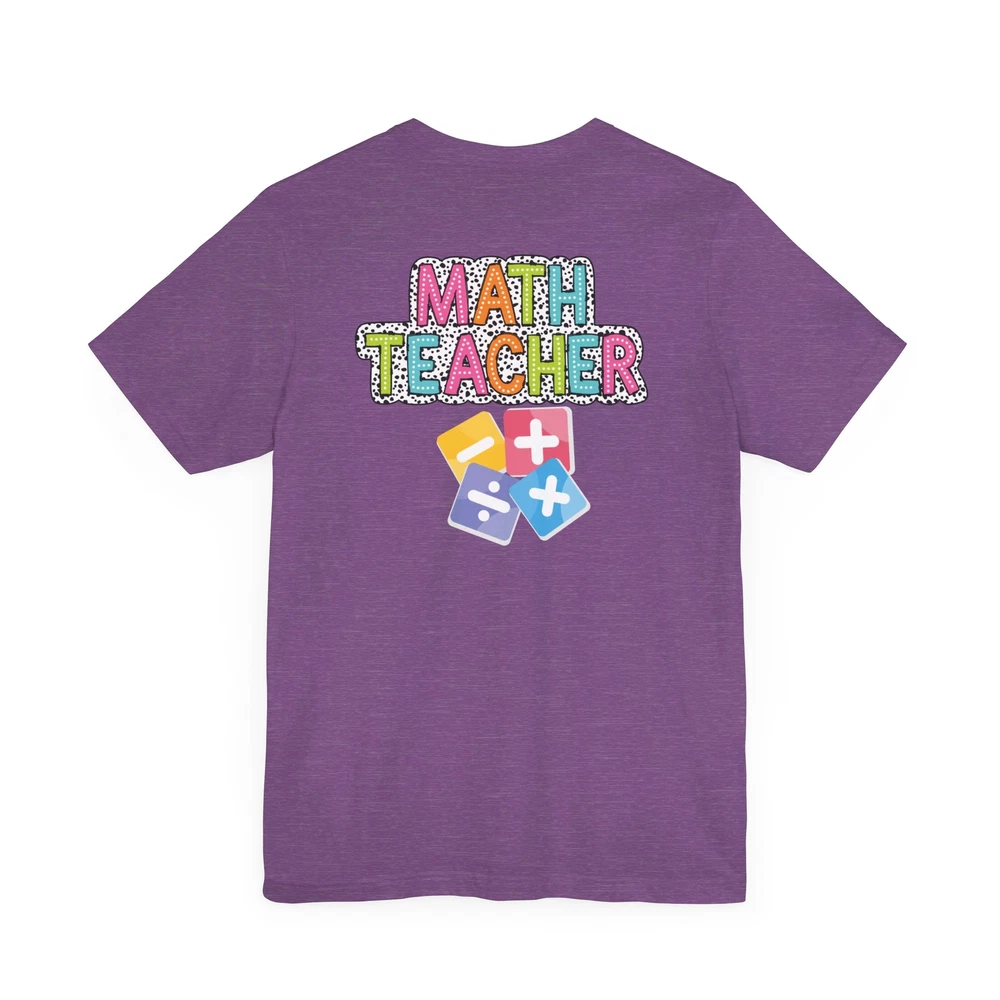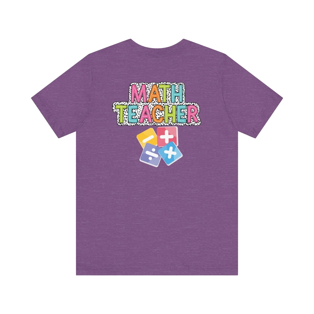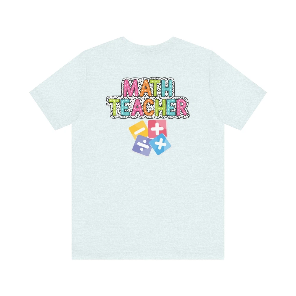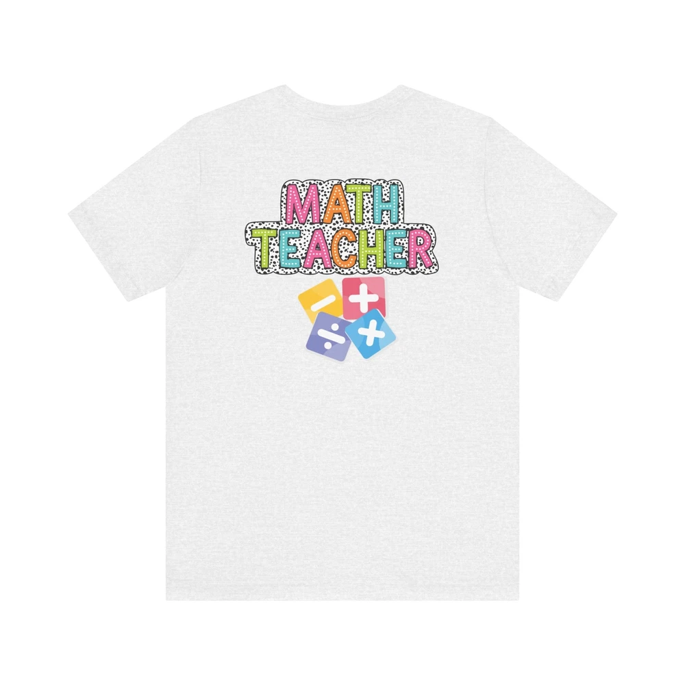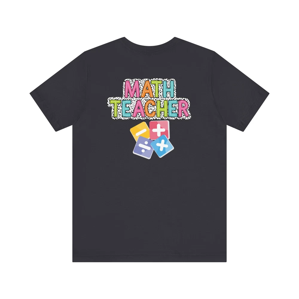 Show appreciation for your favorite math teacher with this stylish Math Teacher Shirt. Perfect as a back-to-school gift or a teacher appreciation present, this tee is a must-have for math lovers and funny teachers alike. Made from high-quality materials, this Mathematics Shirt is both comfortable and durable, making it ideal for everyday wear. Whether you're a math teacher yourself or want to surprise a teacher in your life, this Funny Teacher Shirt is sure to bring a smile to their face. Upgrade your teacher wardrobe with this custom Math Teacher T-shirt and show off your teacher life pride in style. This classic unisex jersey short sleeve tee fits like a well-loved favorite. Soft cotton and quality print make users fall in love with it over and over again. These t-shirts have-ribbed knit collars to bolster shaping. The shoulders are tapered for a better fit over time. Dual side seams hold the garment's shape for longer. .: Made with 100% Airlume combed and ring-spun cotton, a lightweight fabric (4.2 oz/yd² (142 g/m²)) that is easy to layer, breathable. Perfect for active and leisure wear. .: The retail fit that is perfect for casual and semi-formal settings. The crew neckline adds a classic, neat style that's perfect for accessorizing. .: Bella+Canvas manufactures all its products in the US and internationally in humane, no-sweat-shop, sustainable way and is part of the Fair Labor Association as well as Platinum WRAP certified. .: The tear-away label minimizes skin irritations. .: Fabric blends: Ash and Heather Prism colors - 99% Airlume combed and ring-spun cotton, 1% polyester; Heather and Solid Blend colors - 52% cotton, 48% polyester; Athletic Heather and Black Heather - 90% cotton, 10% polyester.