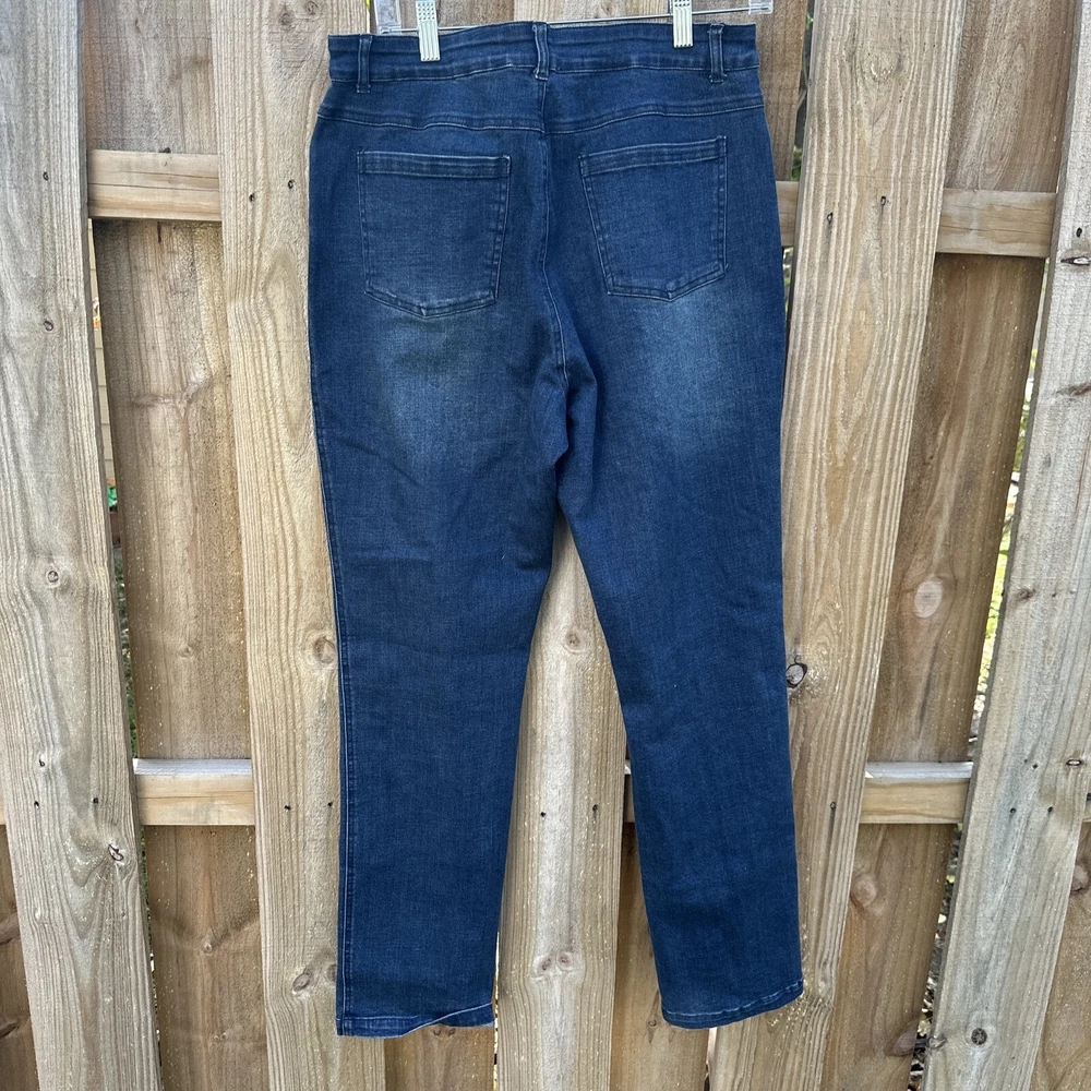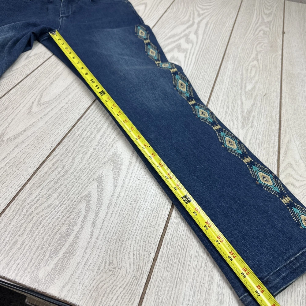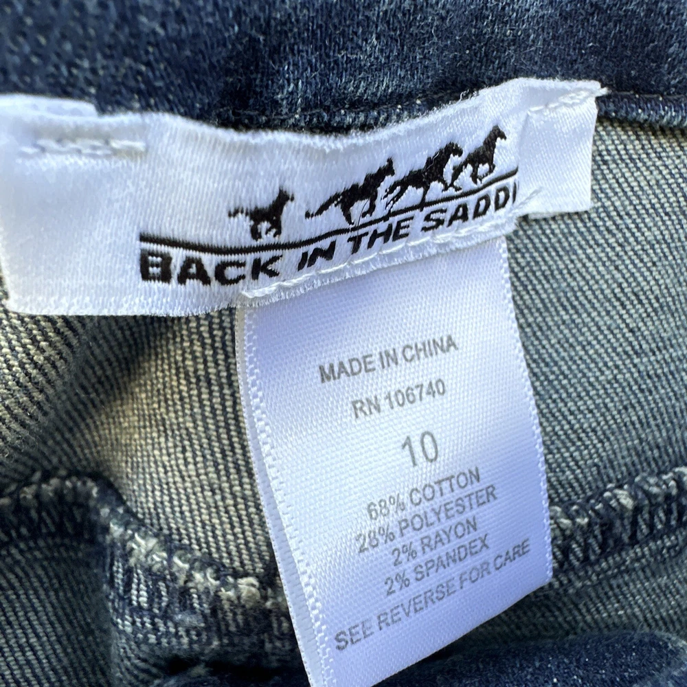 Get ready to ride the range in style with these Back In The Saddle women's jeans. The dark wash denim fabric is accented with a beautiful argyle/diamond pattern, embroidered details, and a high-rise fit. The jeans feature a 5-pocket design, with a button and zipper closure, and an elastic waistband for added comfort. The relaxed fit and stretchy material make these jeans perfect for any season, whether you're out for a casual ride or hitting the town. The inseam and waist size are pictured, and the jeans are available in a size 10. With their western theme and Back In The Saddle product line, these jeans are a must-have for any fashion-forward cowgirl.