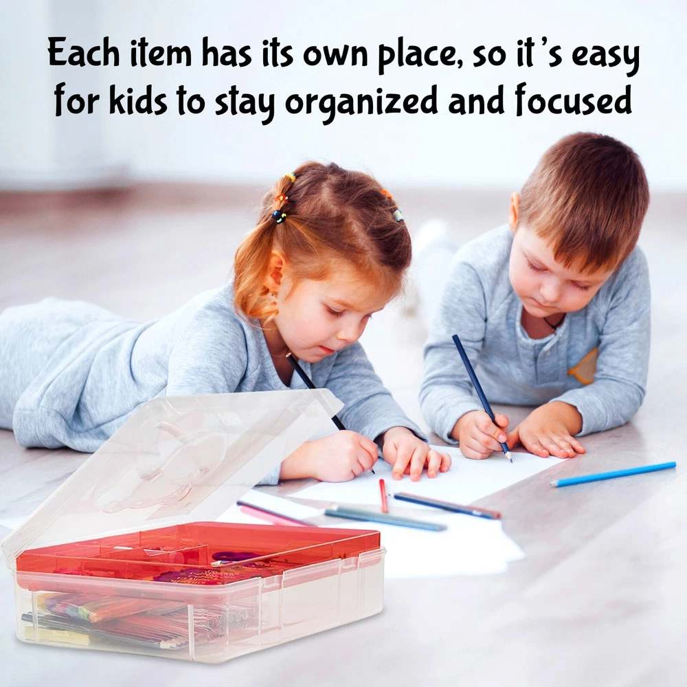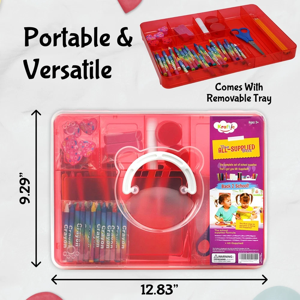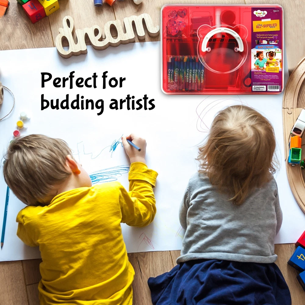 KRAFTIC SCHOOL SUPPLIES: This school supplies kit and art set equips kids with all the materials they need for a successful and fun time in the classroom. It's a drawing kit for both home and school projects BACK-TO-SCHOOL ART BOX CONTAINS: Crayons, colored pencils, washable markers, highlighters, pencils, erasers, sharpeners, sticky notes, a ruler, scissors, a glue stick, and tape. The case measures 12” x 9” x 3.5” VERSATILE AND PORTABLE: This sturdy travel art kit has compartments for every item of a kid’s school essentials, This art case includes a removable section, and folds, making it even more portable QUALITY AND SAFETY-TESTED: The back-to-school kids art kit pack has been safety-tested, and meets or exceeds all US safety standards A GREAT GIFT: A coloring set makes a lovely gift at any time of the year. This art box comes with a range of drawing, art, and crafting supplies. Girls and boys can get creative and organized with this awesome art kit
