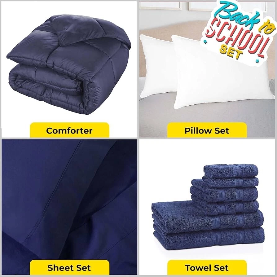 SUPERIOR Back to School Kit, Bedroom Sets, Stress Free Bedroom Bundle, Includes: Navy Blue Twin/Twin XL Comforter, Crown Blue Sheet Set, 2 Standard Pillows,
