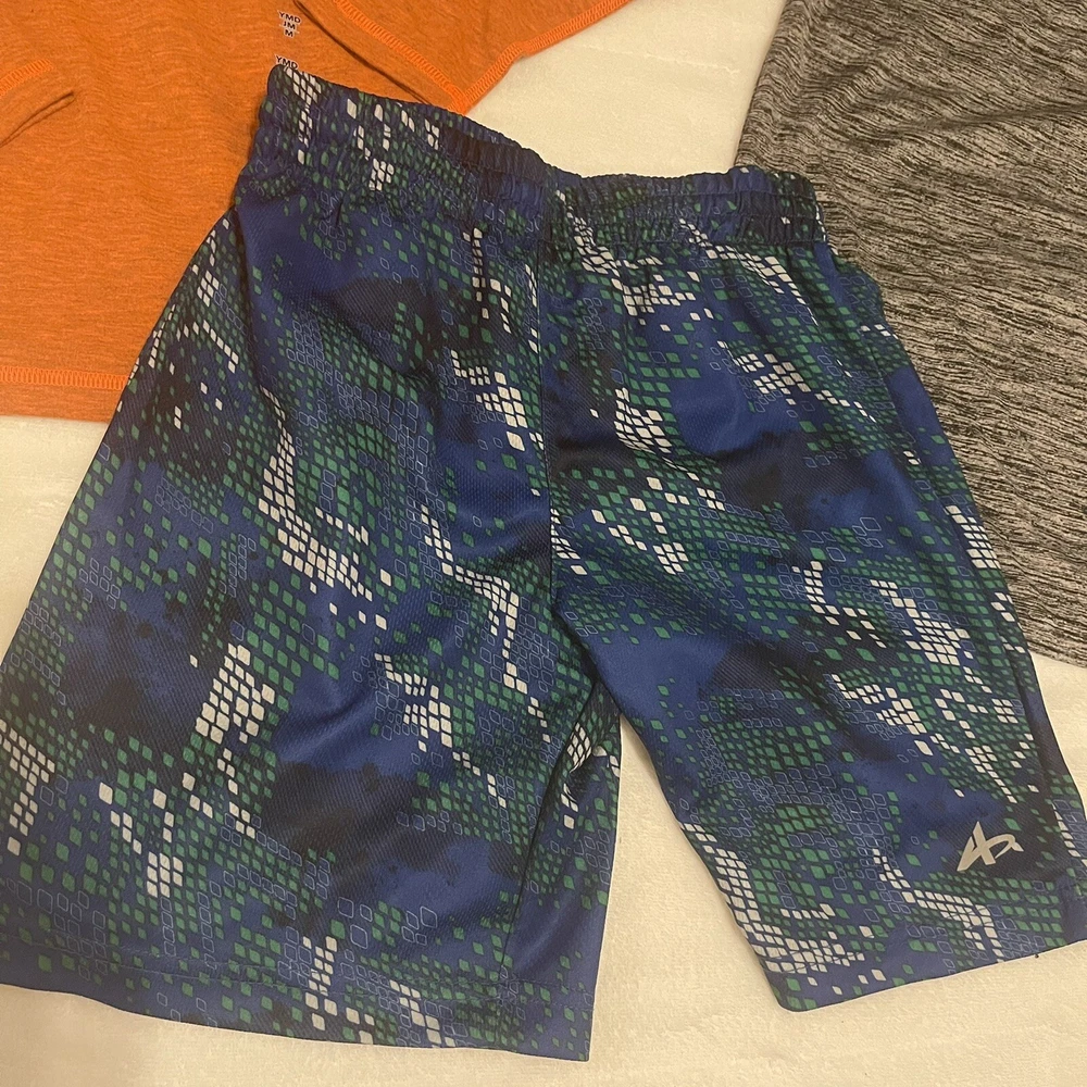 Back to School Boys Clothes bundle! two tops and one short. Get this bundle of 3 pieces, one brand new Under Armor Orange color , athletic top, one Champions grey top and one Athletech pit of short. All size medium. Both shorts pit to pit are 15.5”. Shoulder to hem 21” and 20”. Shorts waist is elastic, as is in the picture with out stretching it is 11”, stretches about two inches more. Waist to hem length 16”.