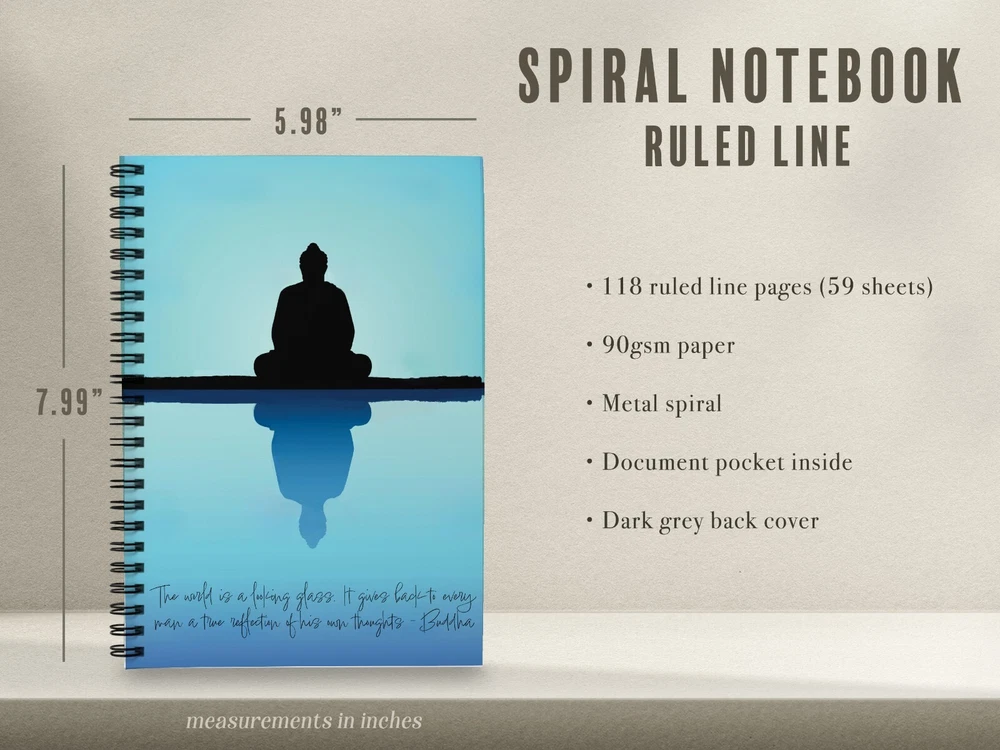 Discover Tranquility and Inspiration with our Meditating Buddha Spiral Notebook – Your Perfect Companion for Work, School, and Beyond! Elevate your note-taking experience with our exquisite Spiral Notebook, thoughtfully designed to bring a sense of calm and focus to your everyday life. Whether you're conquering tasks at your work desk or diving into studies as a dedicated student, this notebook is more than just paper and binding – it's a source of serenity and motivation. Featuring a silhouette image of a meditating Buddha on the cover, this notebook is a gentle reminder to find moments of stillness in the midst of your busy day. The carefully chosen Buddha quote infuses your thoughts with wisdom and tranquility, turning your notebook into a personal sanctuary where you can explore ideas, meditate on insights, and conquer any anxieties that come your way. Looking for the perfect gift? Look no further! This Buddha Quote Notebook is a heartwarming and thoughtful present for a dear friend, a dedicated student, or anyone in need of a touch of mindfulness in their life. It's a tangible way to show you care about their well-being and personal growth. Embrace the journey of self-discovery and serenity. Whether you're writing down goals, taking lecture notes, or simply jotting down your thoughts, let this notebook be your guide to a more centered and focused you. Calm your anxieties, unlock your potential, and let the wisdom of the Buddha lead your way. Elevate your everyday – order now! Free shipping to the United States and returns accepted.