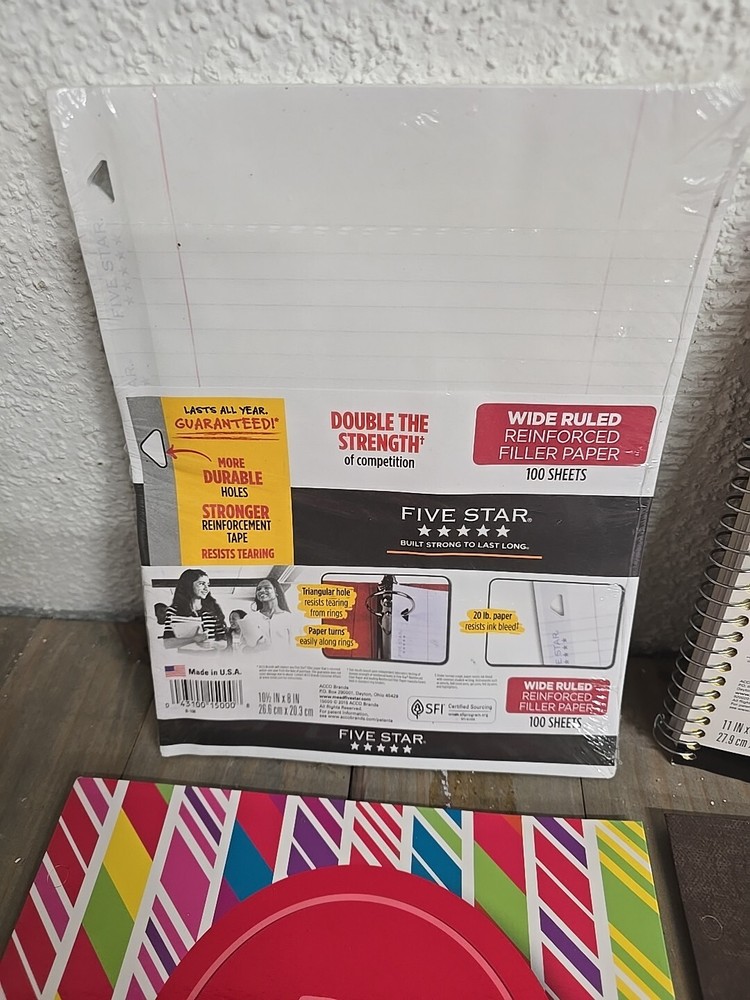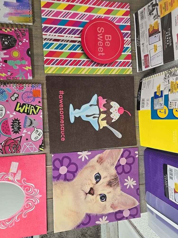 Need a large lot of supplies? Send us a message with the items you would like us to send you a bundle offer on and we will send an offer you won't want to refuse!! Including each items item number would be helpful. Check our store category 'Back To School' to see everything we have available.... now for the description of this item........ Great Back to School Bundle. All are new with original tags or labels. See pics of tags/labels for dimensions and features. Includes everything you see in the photo. Five Star 2 in 1 Binder + Expanding File; 1" Binder Ring + 5 Pocket expanding file (Purple) Five Star 1 Subject Wide Ruled Spiral Notebook with Interactive Note Taking Feature (Yellow) Five Star Pad of Paper with reinforced triangular hole punches to resist tearing Top Flight 1 subject spiral notebook Whimsical 'rebel' theme Carolina Pad 'be sweet' 2 pocket file folder Mary Beth 'awesomesauce' 2 pocket file folder Carolina Pad 'kitten' 2 pocket file folder Mary Beth 'loveyourselfie' 2 pocket file folder Top Flight A5 spiral notebook 'girl gang' theme Top Flight Spiral List Pad 'be kind to yourself' theme Easily over $50 Retail. Offering it here as a bundle to help offset the high cost of back to school supplies. Thank You for looking and be sure to check our other auctions and store listings for great deals. We gladly combine shipping to save you money. Thank You again for looking and for supporting our Florida based small business. (internal) box3