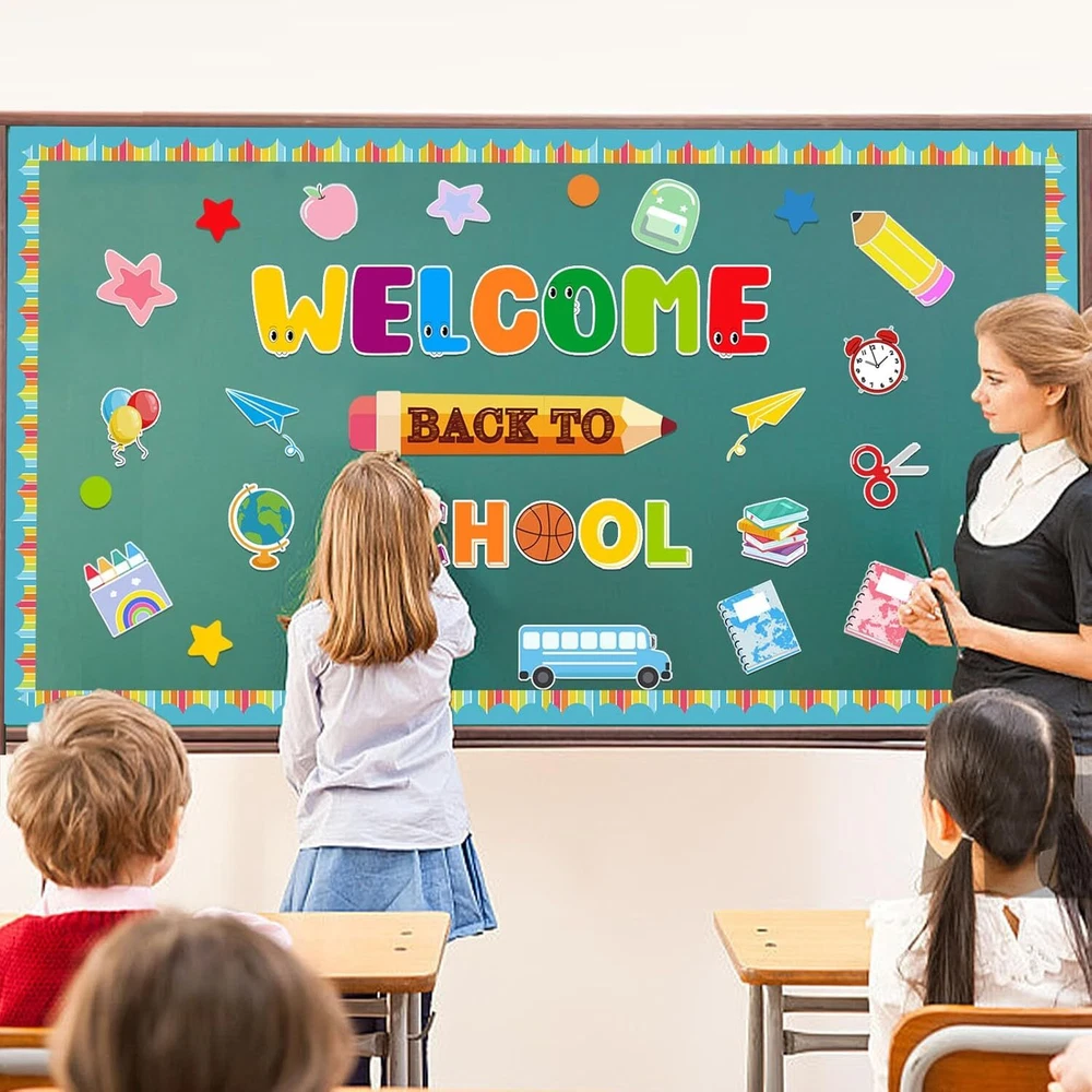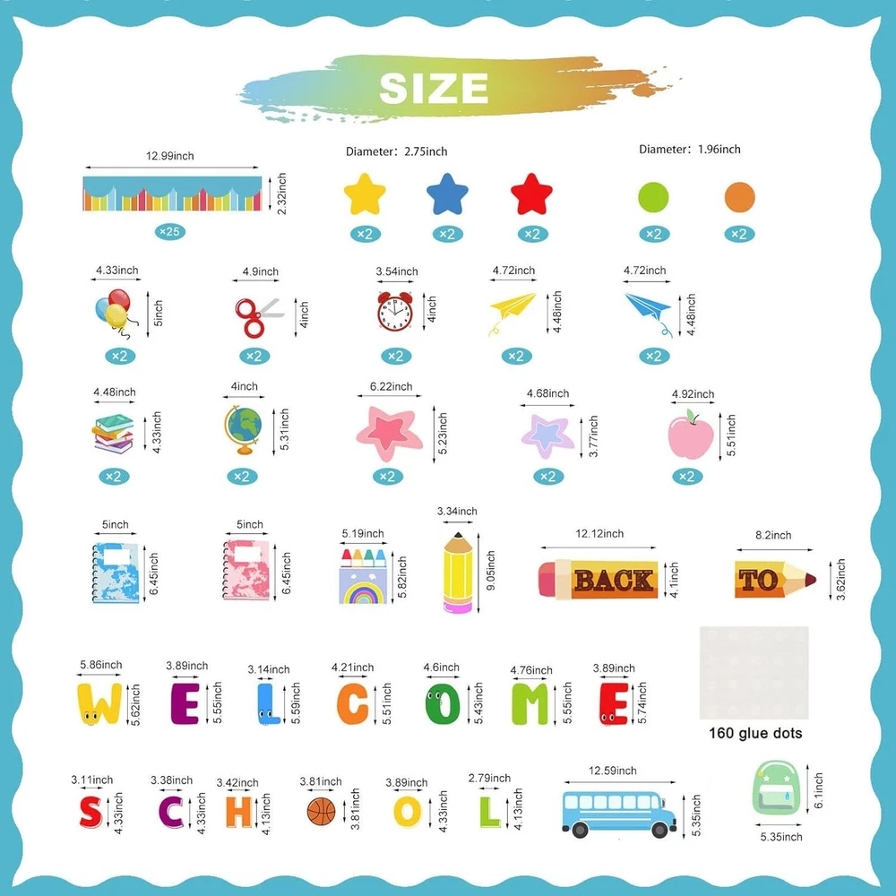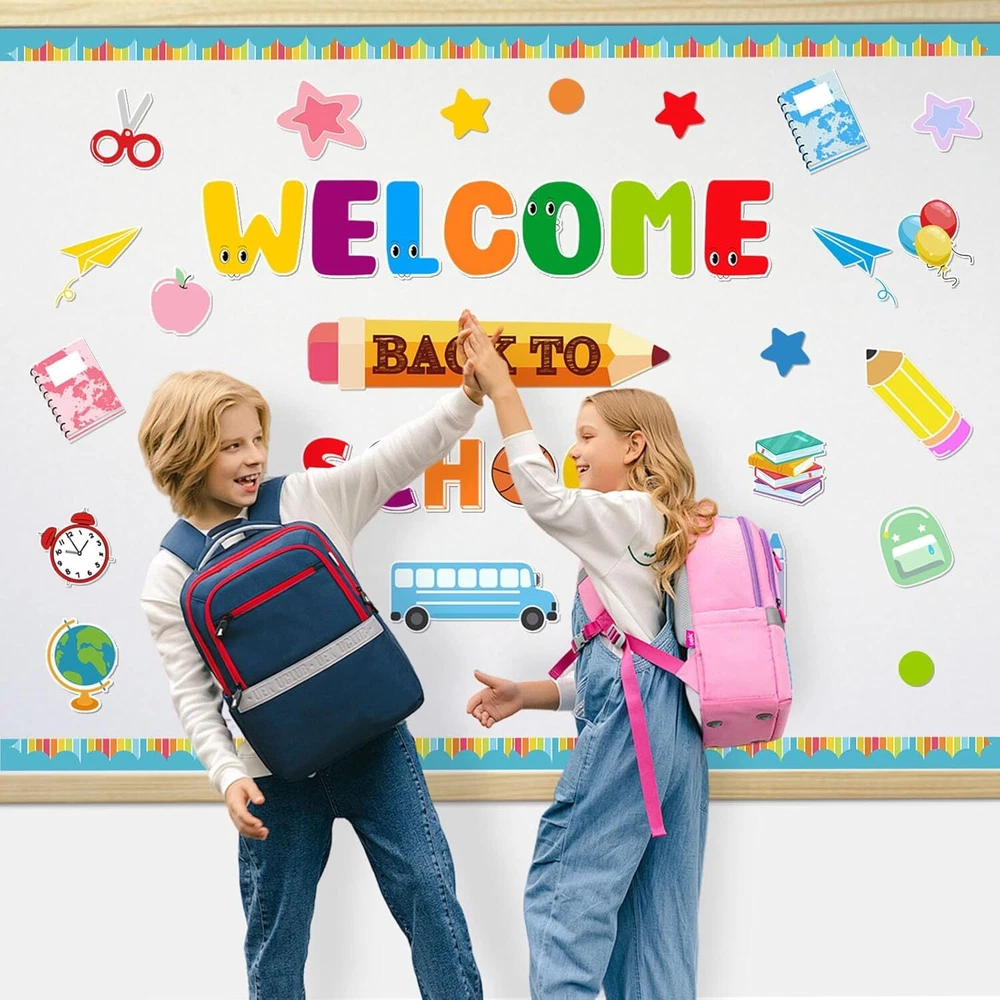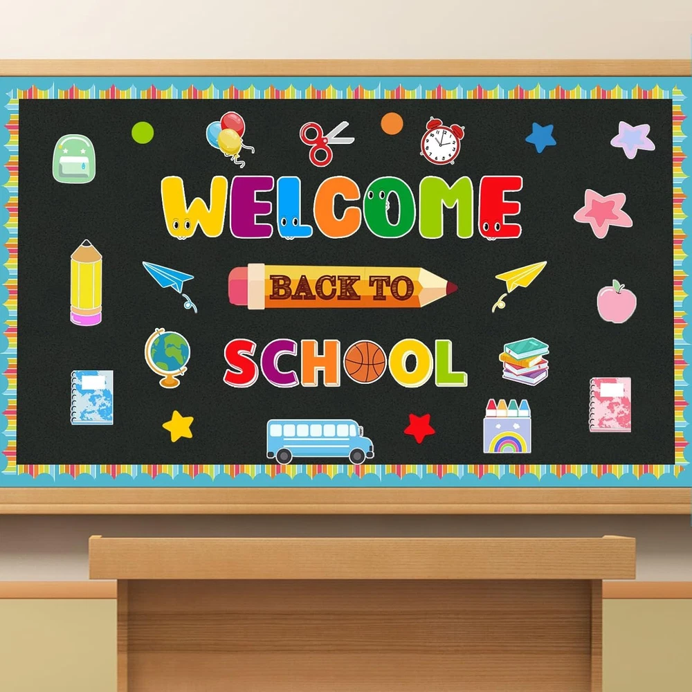 Back to School Classroom Bulletin Board Decoration Set Welcome Back to School Cutouts for First Day of School Classroom Wall Door Decorations for Preschool Elementary Middle School Product Details Material: Paper Occasion: Back to School Theme: colorful Brand: MORENKISS Pattern: Geometric or Letter Print Product Dimensions: 13"L x 8"W Manufacturer: MORENKISS Item Weight: 0.634 ounces Country of Origin: China Item model number: BTS0701 ✏️【Bulletin Board Decoration Kit】This bulletin board decoration set includes cutouts for the phrase “Welcome Back to School”, a variety of back-to-school themed cutouts and 25 x colorful classroom borders to ring in a new academic year with enthusiasm. 【Vibrant Design】Brighten the first day of school with our vibrant welcome back to school bulletin board set. The back-to-school bulletin board set, features brilliant colors and many school-related elements, ensuring a delightful welcome for students. 【DIY Craft】Effortlessly dress up your classroom with the welcome back to school bulletin board set. Use the included glue dots to stick cutouts on the wall, bulletin board or anywhere you want, offering an enjoyable DIY process and a welcoming atmosphere for students returning to school. 【Reliable Quality】These back to school classroom decorations are made of high-quality cardstock that is durable, long-lasting and resistant to fading and tearing. It can also be preserved to contribute to the school's ambiance next semester. ✂️【Wide Application】Our classroom bulletin board set is perfect for a variety of educational settings, including nursery schools, kindergartens, classrooms ranging from elementary to middle school and libraries.