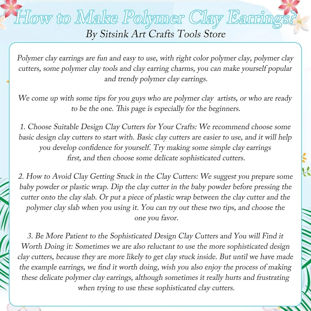 Back to School Clay Cutters - 6 Pcs for Polymer White Product Details Brand: Sitsink Material: resin Shape: Books Item dimensions L x W x H: 1.1 x 1.2 x 0.4 inches Number of Items: 6 Special Feature: Portable Color: White Product Care Instructions: Hand Wash Only Manufacturer: Sitsink Product Dimensions: 1.1 x 1.2 x 0.4 inches Item Weight: 1.8 ounces Country of Origin: China Item model number: TY3D041_5 Back to School Clay Cutters: It's a 3D books clay cutters set. You will receive 6 pieces of polymer clay cutters, 4 four 3D books and 2 for flat bookstack dangle. These clay cutters will help you make some bookworm clay earrings. Design for Polymer Clay Earrings: These back to school bookstack polymer clay cutters are designed for 3D books dangle polymer clay earrings making. You can use these clay cutters make some bookworm dangle polymer clay earrings. Sturdy Polymer Clay Cutters: Our back to school polymer clay cutters are made of reliable resin material, you will find our clay cutters sturdy and in good workmanship. They cut clear and smooth polymer clay pieces, saving time for polishing. Portable Clay Cutters Packaging: These back to school bookstack dangle earring polymer clay cutters are packed in a plastic box, very convenient for storage and organize. These clay cutters will be great companion for your journey of making polymer clay jewelry. Tips for Making Polymer Clay Jewelry: We suggest you add some baby powder or corn starch for help, it will help release the clay from the cutters. Just dip the cutter on the baby powder before you press the cutter on the polymer clay slab.