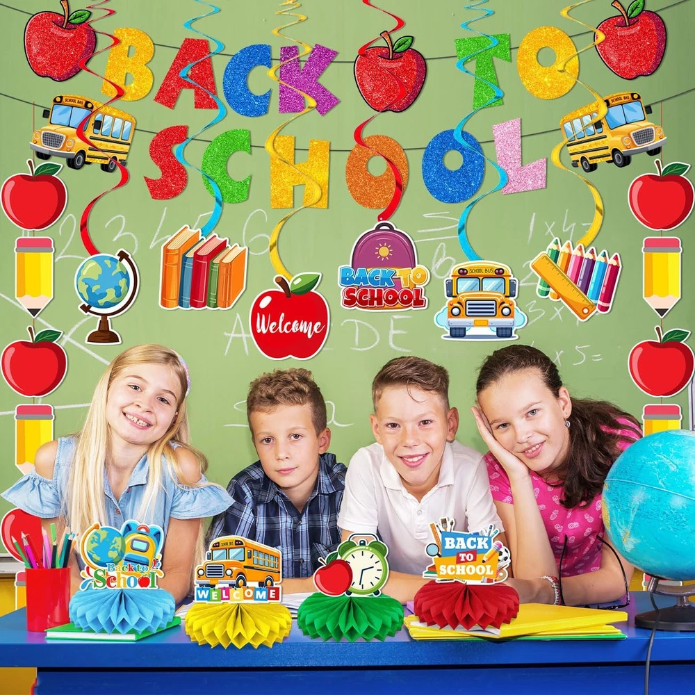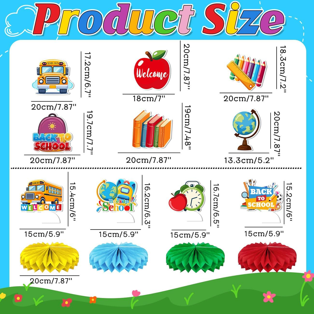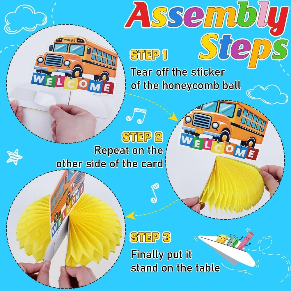 BACK TO SCHOOL DECORATIONS: Back to school decorations include 2 x welcome back to school banners, 12 x back to school hanging swirls, 2 x back to school hanging banners, and 4 x school bus party decorations honeycomb centerpieces. Our back to school decorations are colorful and attractive to add fun to the celebration. QUALITY MATERIAL: Back to school decorations are made of high tech digitally printed cardboard, durable, lightweight, colorfast, easy to decorate, enliven every corner of the celebration space, easily create a festive atmosphere, and create a happy and unforgettable back to school memories for students. APPLICATION: Each back to school decorations has a different style, it is an invisible eye-catching item for the party, with eye-catching words such as “back to school”, including school bus, apple, crayons, book bags and other cute school elements, creating a strong fun atmosphere. It is perfect for back to school party decorations, first day of school party, office back to school decorations, back to school themed party, back to school classroom decorations, first day of school decorations and more. EASY TO USE: Back to school decorations honeycomb centerpiece is easy to assemble, just peel off the back sticker, unfold the honeycomb ball, stick on the card pattern, and you will get a cute back to school honeycomb centerpiece. The back to school hanging swirl is also easy to make, just carefully tear it into a spiral along the perforated line and hang the card from the ceiling, wall or door. SERVICE: we provide high quality products and services. If you have any questions about this back to school decorations, please contact us, we will provide you with thoughtful solutions. Product Description