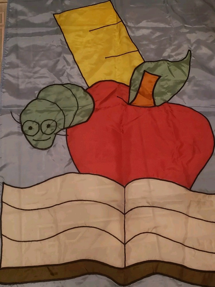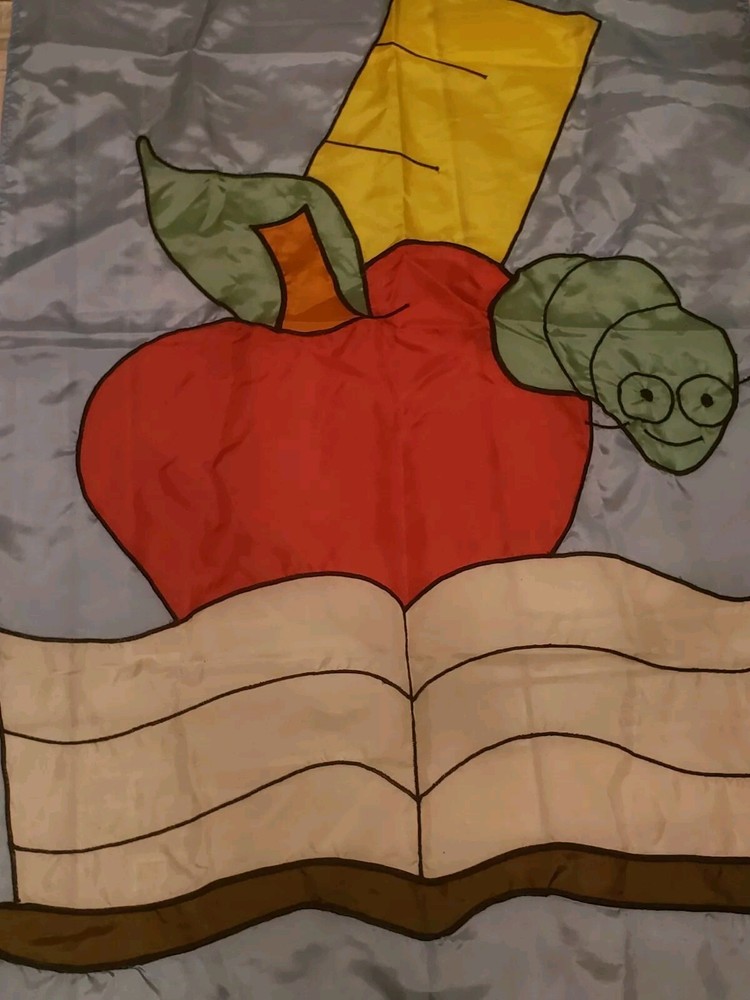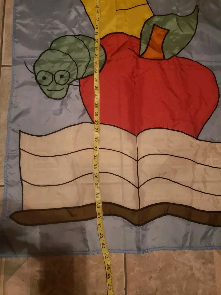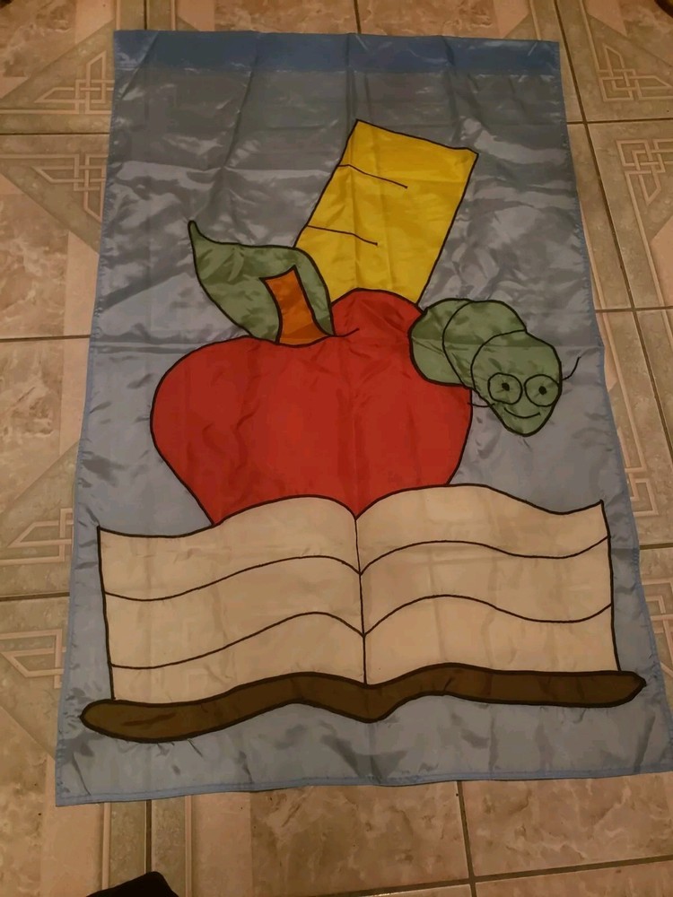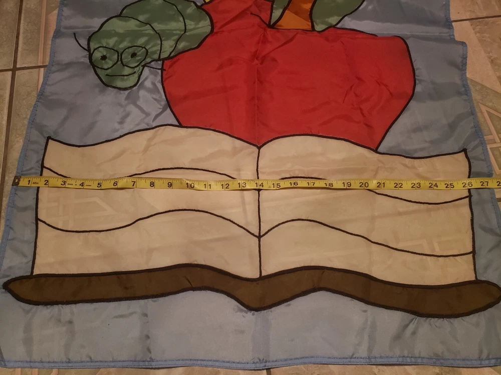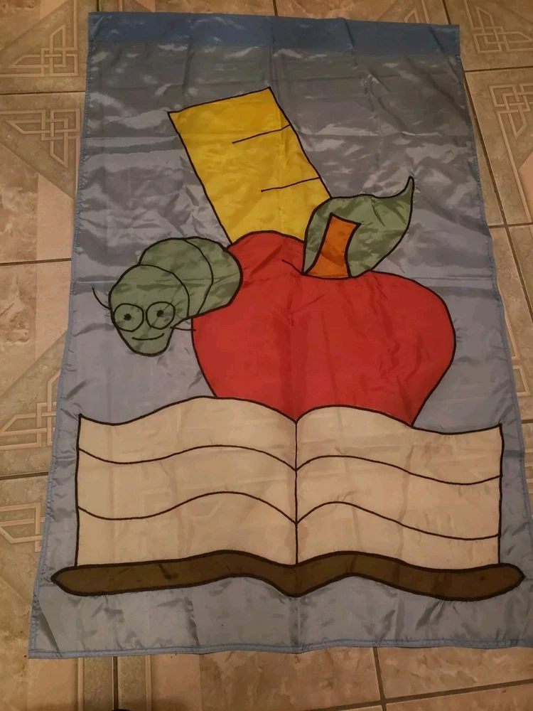 This adorable fall-themed yard flag is perfect for back-to-school season! The playful apple and worm design with a book and ruler adds a fun, academic touch to any garden or yard. Even though it's used, it's in great condition—no noticeable flaws. A cheerful way to welcome students and celebrate autumn vibes!
