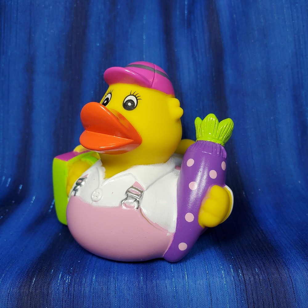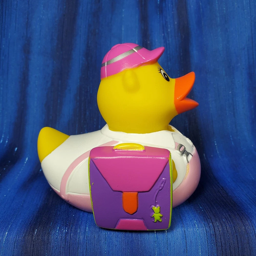 A bookbag full of school supplies and a gift for his teacher and she's all ready for the first day of school. Dimensions: Bill to Tail: 3.2" W: 3.25" H: 3" Squeaks: No Sealed: No Swims upright: No Material: Vinyl. Lead free and phthalate free. Age recommendation: 3-99 One (1) Back to School Gril Rubber Duck from Schnabels per unit.