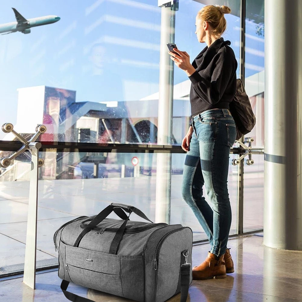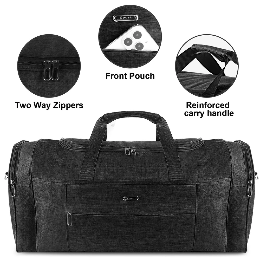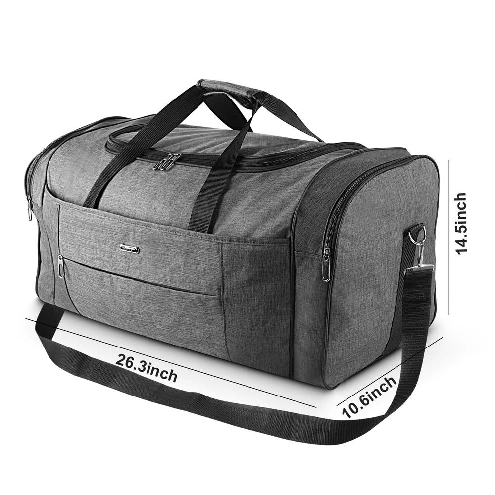 Description Multipurpose:This duffel bag is extra large and can be served as a sports, gym, luggage, weekender bag, oversize travel bag, military duffle bag, overnight bag, camping, airplane duffle or even household storage bag. It is suitable for women and men of all age. Detail Oriented Design:Men's weekender travel bag padded handles and an adjustable shoulder strap for carrying comfort and versatility. Lots of pockets and convenient Mesh string nets for handy storage. Foldable and Spacious:Huge luggage traveler bag can be fast folded into itself . It takes a little space while have a huge up-to 60 Liter capacity to be used as a backup overnight storage bag in case your suitcase swells up. Durable and Lightweight:Overnight travel duffel bag is 26.3" X 10.6" X 14.5"in size. Made out of high quality Oxford PU450 fabric.It is water wear, tear resistant and build to last. Package: 1*Overnight travel duffel bag