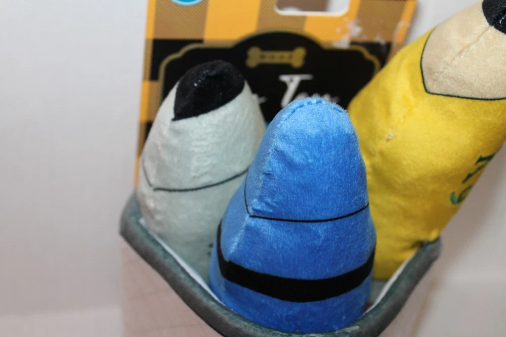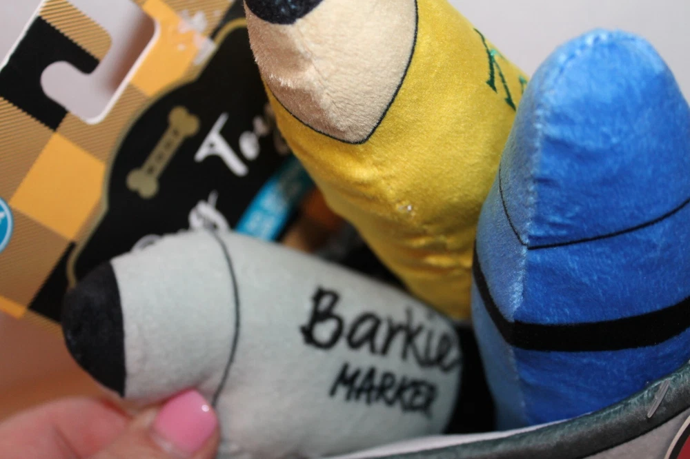 Back to School Pencil Cup Dog Toy Set Soft pencil cup with three toys inside: Blue Grrrayon K9 No. 2 Pencil Barkie Marker They make a squeak sound, and also some crinkle sound. Brand New with Tags! If you buy more than one item from me in a single transaction, I would be happy to combine shipping for you to save you money. Just request an invoice from me before paying. I ship quickly, the same day or next day.
