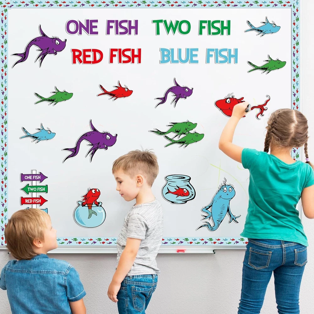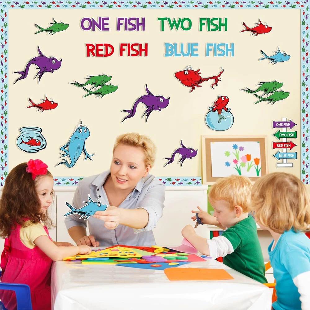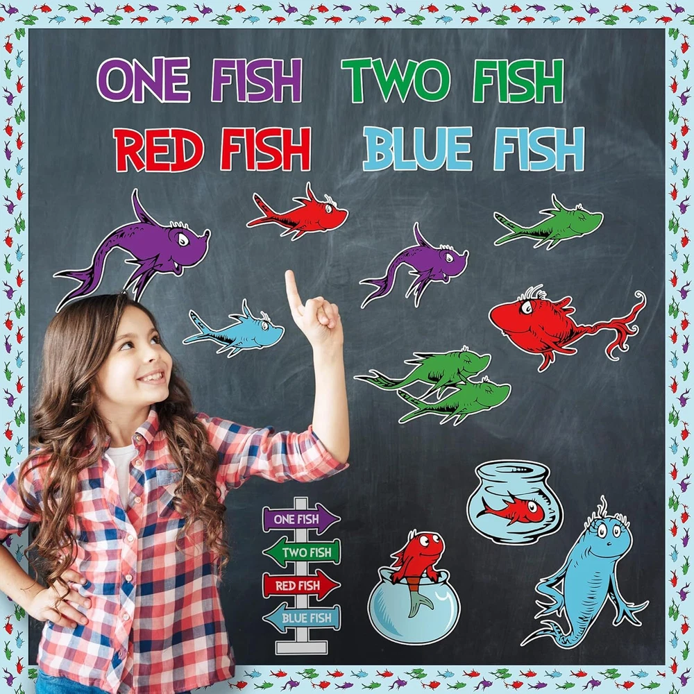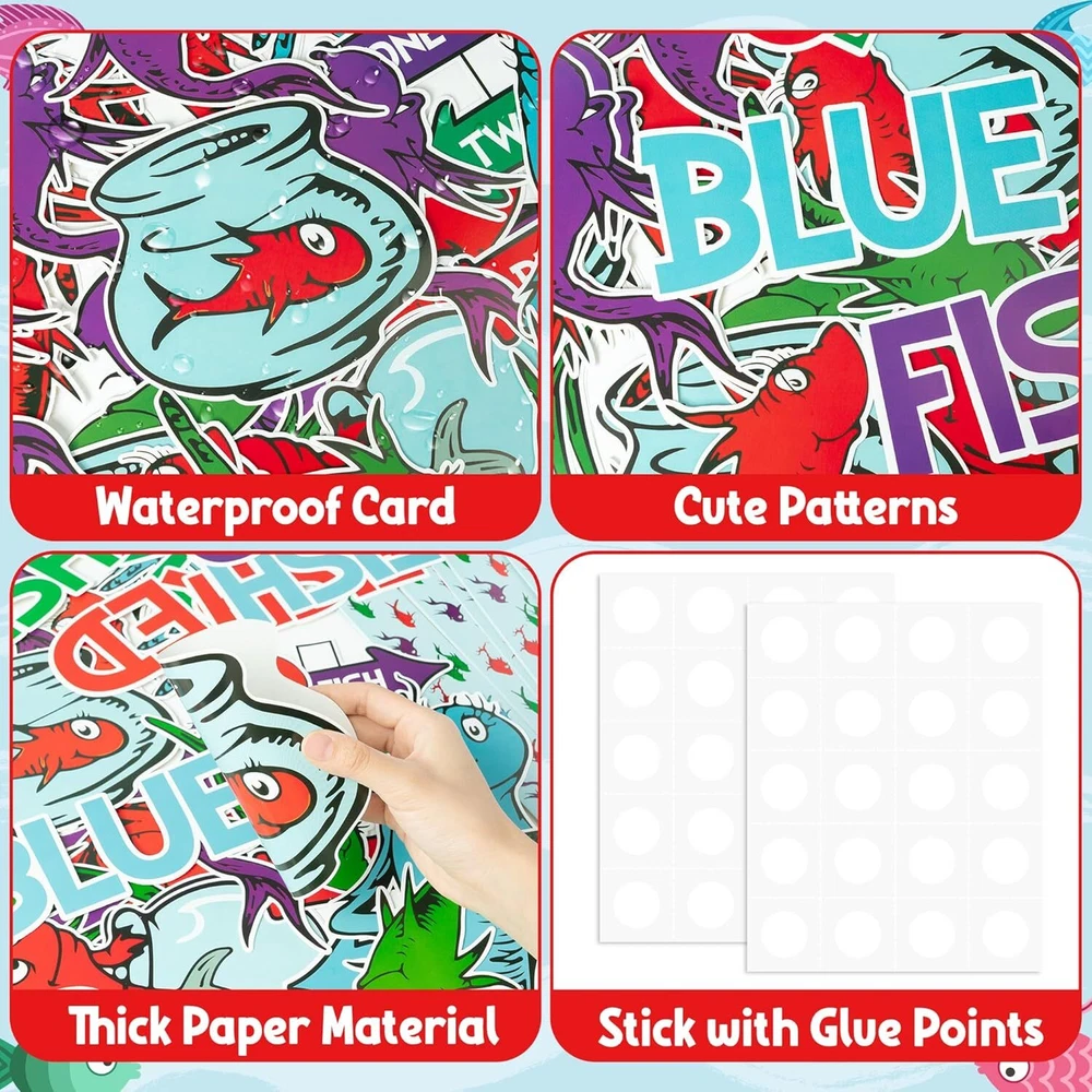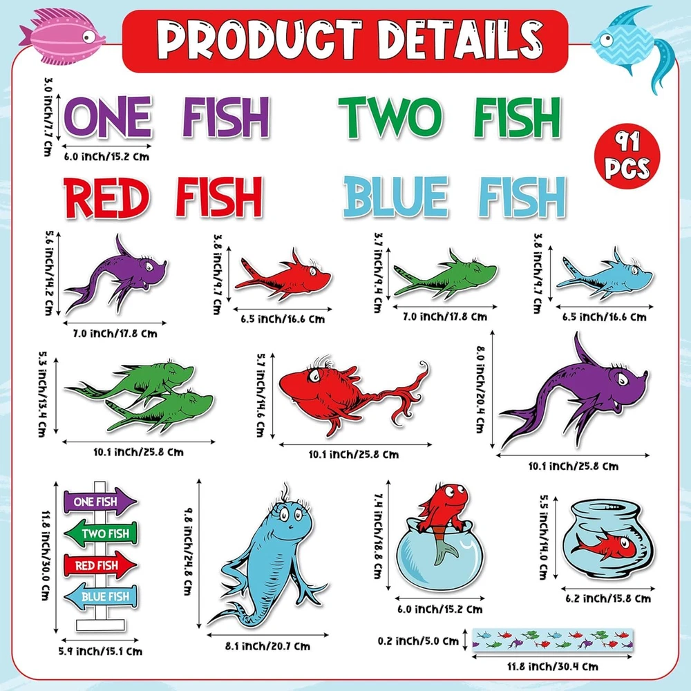 Back to School Seuss’Fish Bulletin Board, 91Pcs First Day of School Fish Theme Cutouts Chart Posters, Read Week Supplies Classroom Home Decoration Craft Set Decor for Kids Students Party Product Details Occasion: Back to School Theme: Animal Brand: Axbvok9Uconie Number of Pieces: 91 Cute Fish Theme Cutouts for Bulletin Board:Our Fish bulletin cardboard poster is a very innovative and interesting teaching tool for children, bright colours and cute, fun patterns will appeal to children, with the children to DIY these cards, and then decorate them in the classroom or the corner of the home. It will be a beautiful and unique sight. Value Decoration Set: You'll get 44 fish cards, 8 fishbowl cards, 30 border cards, 1 sign card, 8 word cards and 10 dots of adhesive, rich bulletin board poster cardstock for kids to create and learn freely. Premium Cardboard Material: Our back to school bulletin boards are made of waterproof and pliable cardboard, the printing process doesn't lose colour, non-toxic and odourless, very child friendly and reusable, making it a very ideal long term decoration. Multiple Usage: Our fish theme read week bulletin board cardboard posters will appeal to children. Teachers and parents can create a fun learning corner with their children in the classroom or at home. These cards will not only serve as decoration, but will also allow children to learn in a subtle way, which will help to lay the foundation for their future learning. Happy Shopping Experience: Thank you for your understanding. If you encounter any issues or have any concerns with our product, we are willing to providing after-sale service for any problems you may experience.