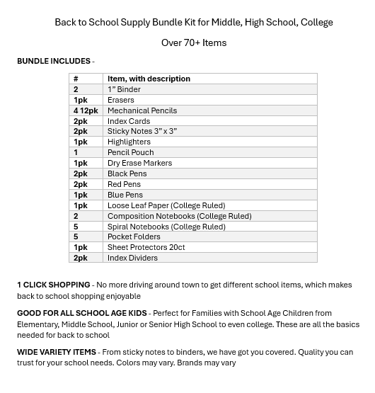 Back to School Supply Bundle Kit for Middle, High School, College Over 70+ Items Back to School Supply Bundle Kit for Middle, High School, College Over 70+ Items BUNDLE INCLUDES - # Item, with description 2 1” Binder 1pk Erasers 4 12pk Mechanical Pencils 2pk Index Cards 2pk Sticky Notes 3” x 3” 1pk Highlighters 1 Pencil Pouch 1pk Dry Erase Markers 2pk Black Pens 2pk Red Pens 1pk Blue Pens 1pk Loose Leaf Paper (College Ruled) 2 Composition Notebooks (College Ruled) 5 Spiral Notebooks (College Ruled) 5 Pocket Folders 1pk Sheet Protectors 20ct 2pk Index Dividers 1 CLICK SHOPPING - No more driving around town to get different school items, which makes back to school shopping enjoyable GOOD FOR ALL SCHOOL AGE KIDS - Perfect for Families with School Age Children from Elementary, Middle School, Junior or Senior High School to even college. These are all the basics needed for back to school WIDE VARIETY ITEMS - From sticky notes to binders, we have got you covered. Quality you can trust for your school needs. Colors may vary. Brands may vary Back to School Supply Bundle Kit for Middle, High School, College Over 70+ Items Back to School Supply Bundle Kit for Middle, High School, College Over 70+ Items BUNDLE INCLUDES - # Item, with description 2 1” Binder 1pk Erasers 4 12pk Mechanical Pencils 2pk Index Cards 2pk Sticky Notes 3” x 3” 1pk Highlighters 1 Pencil Pouch 1pk Dry Erase Markers 2pk Black Pens 2pk Red Pens 1pk Blue Pens 1pk Loose Leaf Paper (College Ruled) 2 Composition Notebooks (College Ruled) 5 Spiral Notebooks (College Ruled) 5 Pocket Folders 1pk Sheet Protectors 20ct 2pk Index Dividers 1 CLICK SHOPPING - No more driving around town to get different school items, which makes back to school shopping enjoyable GOOD FOR ALL SCHOOL AGE KIDS - Perfect for Families with School Age Children from Elementary, Middle School, Junior or Senior High School to even college. These are all the basics needed for back to school WIDE VARIETY ITEMS - From sticky notes to binders, we have got you covered. Quality you can trust for your school needs. Colors may vary. Brands may vary × Buy now and save! Shipping info Click the Shipping & Payments tab above the listing description for more info Click the Shipping & Payments tab above the listing description for more info! Additional delivery notes PICK UP OPTION Sorry, our items are NOT available for pick-up. PAYMENT Immediate payment is required upon selecting "Buy It Now" or upon checking out through the cart. We accept payment via U.S. PayPal accounts and all Major Credit Cards, Debit Cards & Google Pay. We are legally required to collect sales tax in those states and localities where we maintain a physical presence (nexus). The applicable amount of sales tax charged to an order will be calculated based on the shipment destination's state and local sales tax laws. Thank you for shopping with us on eBay! Additional Information No additional information at this time Ask seller a question You might also like LG 6-Month Twist-In Refrigerator Water Filter Part #LT700P 43 Item Pack Back to School Supply Bundle k-5 grade Fruit of the Loom Men's Micro-Stretch Trunk Boxer Briefs, 6 Pack Gildan Men's A-Shirts, 3-Pack Contact To contact our Customer Service Team, simply click the button here and our Customer Service team will be happy to assist. Ask seller a question © Copado's Liquidation LLC Shipping & Payments Click the Shipping & Payments tab above the listing description for more info Payment Accepted Payment Methods Immediate payment is required upon selecting "Buy It Now" or upon checking out through the cart. We accept payment via U.S. PayPal accounts and all Major Credit Cards, Debit Cards & Google Pay. We are legally required to collect sales tax in those states and localities where we maintain a physical presence (nexus). The applicable amount of sales tax charged to an order will be calculated based on the shipment destination's state and local sales tax laws. Thank you for shopping with us on eBay! Returns Returns are not accepted Seller will pay for return shipping. eBay integration by