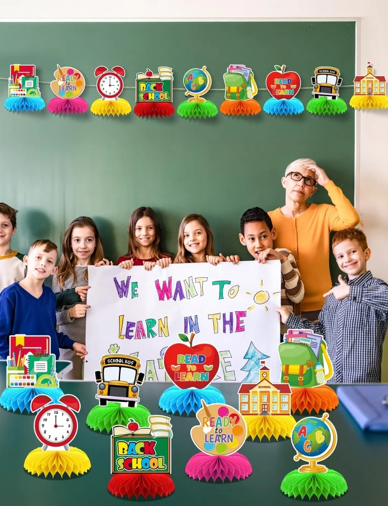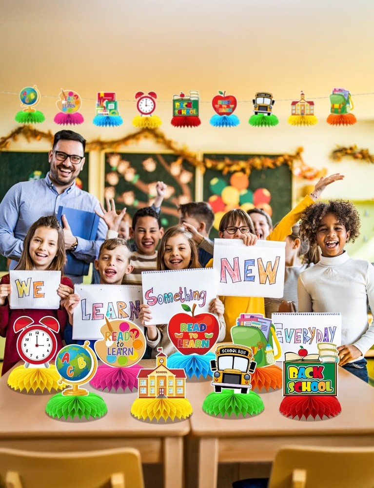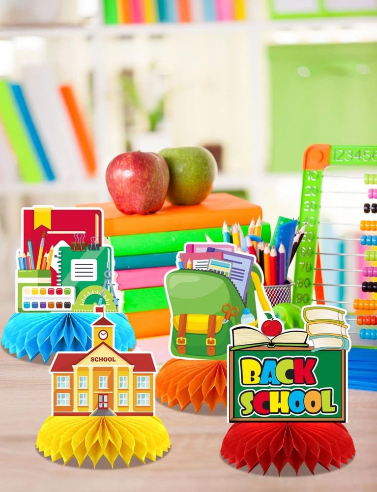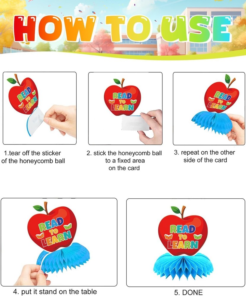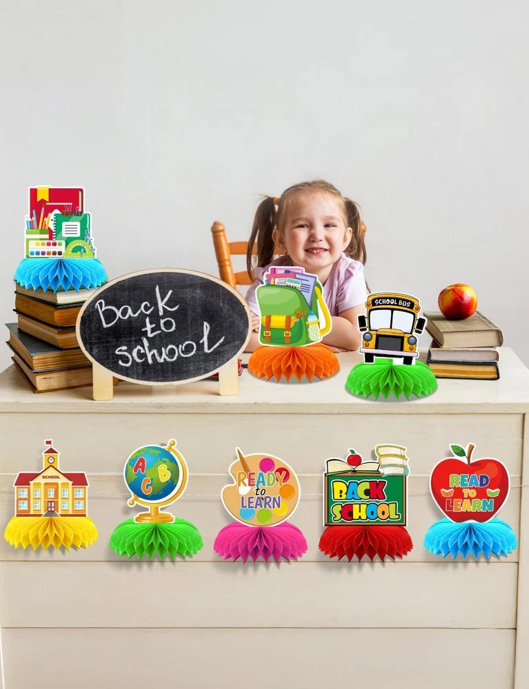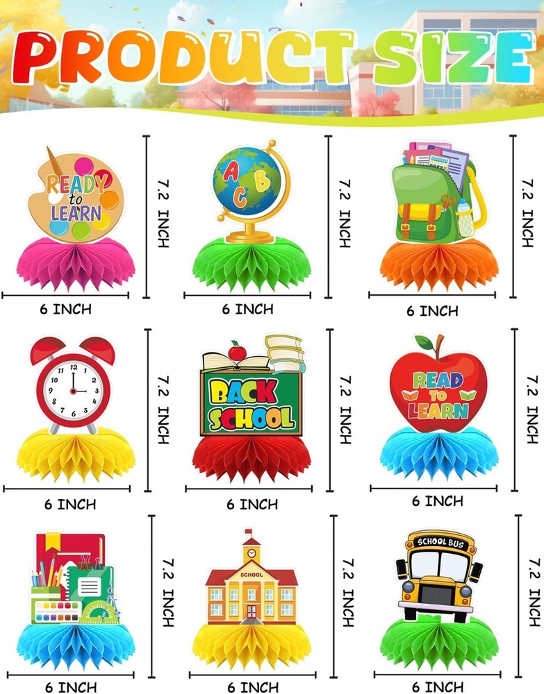 Back to School Table Decorations - 9 Pcs Welcome Back to School centerpieces for tables Bus Stationery Chalkboard Honeycomb Centerpiece Table Toppers for Teachers Students Classroom Supplies Product Features Happy First Day of School Decorations: You will receive 9 pieces of back to school centerpieces, abundant in quantity and diverse in style. Each piece has a unique design, including backpacks, blackboards, school buses, alarm clocks, apples, books, globes, various learning supplies, and more. These novel and cute back to school party supplies are perfect for celebrating the first day of school! High-Quality Back to School Decorations: These back to school centerpieces for tables are made from premium, thick, and sturdy cardboard material, featuring double-sided printing with vivid colors. The back to school honeycomb centerpieces can be placed on the table or hung up to attract guests' attention from different angles. This back to school decorations will add up to the excitement of your highly-anticipated new preschool classroom decor! Easy to assemble: These colorful welcome back to school decorations can be quickly assembled. Step 1: Tear off the sticker of the honeycomb ball. Step 2: Stick the honeycomb ball to a fixed area on the card. (Pay attention to alignment.) Step 3: Unfold the honeycomb ball and stick the other end of the honeycomb ball onto the card. In just a few minutes, you can easily decorate your party and enjoy the happy time! Widely Applicable: These happy first day of school decorations are essential for families, classrooms, and gatherings on the first day of school. You can use these back to school table centerpieces as photo props or DIY kits, placing them on desks, bulletin boards, dessert tables, office desks, blackboards, game rooms, party tables, and other spaces. The bright and vibrant colors will light up the first day of school, making the day full of meaning! Do you want your back to school party decorations to be extra special? This colorful and eye-catching back to school centerpieces kit is designed to create a joyful and unforgettable start to the school year for both students and parents. Shipping: Shipping is complimentary within the lower 48 US States. We Do Not Ship to PO/APO Boxes, HI or Alaska We Do Not Ship Outside of the Continental US All items ship within 24-72 hours of Payment For large items that require Freight shipping a valid phone number is required to call and schedule your delivery Terms of Sale and Feedback: Feedback is extremely important to us and eBay If you are satisfied with our transaction, please take a moment to leave Positive Feedback. YOUR Satisfaction is our #1 Priority! If there are any issues, PLEASE contact us BEFORE leaving a neutral or negative rating so that we may resolve any concerns. We PROMISE we can make you happy if you give us a fair chance. Returns / Concerns: All items qualify for returns within 14 - 30 days of receipt. Buyer is responsible for return shipping on any item that is not damaged Please be sure this is an item you want before making your purchase. Customer Satisfaction is our TOP priority! All items are IN STOCK at time of listing. Inventory on eBay changes constantly and it is impossible to maintain a perfectly accurate count of all items. Please do not penalize us if we have to issue you a refund! Thank You For Your Business!