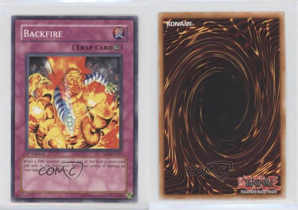 2005 Yu-Gi-Oh! Blaze of Destruction - Structure Deck [Base] - 1st Edition #SD3-EN031 Backfire COMC Item: 29599134 - YuGiOh Card - Featuring Backfire Search for more: 2005 Yu-Gi-Oh! Blaze of Destruction Search for more: 2005 Yu-Gi-Oh! Blaze of Destruction - Structure Deck [Base] - 1st Edition View all of our Listings Auctions Buy It Now About Us Located in the beautiful Pacific Northwest, COMC (Check Out My Cards) is the world's largest consignment service for trading card singles. More than 10,000 people have used our consignment service to list over 50 million trading cards. Find out how we can help you consign your items on eBay by contacting us through eBay messaging. COMC -- "The Safe & Easy Way to Buy & Sell" Raw Condition for Modern Cards Unless otherwise noted, raw modern cards are listed in Near Mint-Mint condition or better. A NM-MT card appears to be Mint at first glance, but upon closer inspection, may exhibit some of the following: minor print defects (e.g. roller marks, print line, dimple), minor scratches, slight edge wear, and slight corner wear. Centering is clearly visible in the images provided and does not factor into our condition assessment. Raw Condition for Vintage Cards Unless otherwise noted, raw vintage cards are listed in Excellent condition or better. An EX card may exhibit some of the following: minor rounding of corners, surface wear, print defects, light scratches, and slight edge wear/chipping. Centering is clearly visible in the images provided and does not factor into our condition assessment. Domestic Shipping Combined shipping for multiple items is available. To receive combined shipping, please ensure all desired items are in your eBay shopping cart before proceeding to checkout. eBay limits orders to 40 items per order. We automatically combine multiple orders placed on the same day. If you place multiple orders on the same day, please contact us to request a refund of applicable shipping costs. Signature confirmation may be required on invoices over $400. All cards are protected and shipped securely. International Shipping COMC offers eBay's International Shipping (EIS) for international orders under $2,500* (see country exceptions below). All duties and import fees are paid at checkout; in the rare event that there are additional import fees upon delivery, these are borne by the buyer. EIS packages route through a shipping hub in Erlanger, KY before shipping to their final destination. Please note that EIS does not allow for combined shipments. The shipping rates are determined by eBay and cannot be adjusted. *Maximum sale price exceptions: Colombia, Kuwait ($2,000); Taiwan ($1,539); Chile, Costa Rica, Guatemala, Honduras, Trinidad and Tobago ($1,000); Antigua and Barbuda, Aruba, Belize, Dominica, Grenada, Philippines, Saint Kitts and Nevis, Saint Lucia, Montserrat, Turks and Caicos Islands ($500); Dominican Republic, El Salvador ($200). Please request a shipping quote through eBay messaging for orders that exceed the maximum sale price supported by eBay's International Shipping. You will be responsible for all duties and import fees for international orders shipped outside the EIS. All cards are protected and shipped securely. Payment COMC does not accept offers on our cards through our eBay storefront. COMC utilizes eBay’s managed payments system. If you are experiencing difficulties making a payment, please contact eBay for assistance. Return Policy Returns are only accepted on the rare occasion the item is not as described. If you are making a return, please initiate the return process through eBay so a mailing label can be provided for you. Prior to listing, our expert team carefully assessed this item to represent it accurately. Please review the description and high-definition images prior to purchasing to ensure this item meets your satisfaction. We welcome you to contact us if you have further questions about this item. Trust and Integrity COMC carefully assesses each item consigned to us to prevent fraudulent items from entering the marketplace. If you believe an item offered on COMC may be fraudulent, please contact us with details so we can investigate the issue. Items we determine are outside our supported items policy may be removed. Last Modified: 6/1/2025 1:29:08 AM PDT