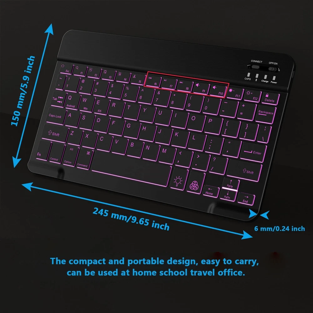 Please charge for more than 6 hours before first use. This keyboard comes with 7-color backlight mode, 1 breathing light mode, and 3 brightness levels. Turn on/off the backlight and adjust the backlight mode by the Light Bulb key. Switch colors between red, yellow, purple, green, ice blue, blue and white by RGB key. Press "Light Bulb+↑" key at the same time to increase the brightness. Press "Light Bulb+↓" key at the same time to decrease the brightness. When the keyboard is idle, the backlight will automatically turn off to save power. Backlight mode will deplete the battery faster. If the backlight mode is maintained during use, the battery may only last for 3-4 hours, especially in white light mode, and the use time is shorter. If you want to use it for a longer time after being fully charged, we recommend that you reduce the backlight brightness or turn off the backlight mode. Specifications: Connection Method: Bluetooth Keyboard Dimensions: 9.65 x 5.91 x 0.24 inch (24.5 x 15 x 0.6 CM) Weight: 6.53 ounce (185g) Keyboard Buttons: 78 keys Keyboard Layout: QWERTY layout Multimedia Shortcuts: Press FN+"F1-F12" function keys Material: Plastic and aluminum alloy This Bluetooth keyboard is specially designed for small mobile devices such as iPad, iPhone, , smartphone. The back of the keyboard is aluminum alloy design, which is perfect for use with iPad/ case with magnetic adsorption function. Does NOT with desktop devices such as laptops, PC, computers, Mac, MacBook, etc. Broad Compatibility: The Bluetooth keyboard is perfect for Android smartphone Samsung galaxy tab, iOS iPhone, iPad 6th 7th 8th 9th 10th 11th generation 10.2 in 10.9 inch, iPad M3 M2 11/13 inch 3rd 4th 5th gen, iPad 13 inch, iPad 11 inch 1st 2nd 3rd 4th , iPad 12.9 inch 3rd 4th 5th 6th gen, iPad Mini 5 6 7 gen 7.9" 8.3". How to connect the Bluetooth keyboard: 1. Turn on the keyboard 2. Turn on the Bluetooth of your or 3. Click the "CONNECT" button 4. Search and click "Bluetooth Keyboard" on the mobile device to connect Package Include: 1* Backlit Bluetooth Keyboard 1* -Charging Cable 1* User Manual 7-Color Backlit: This Bluetooth keyboard has a 7 colors backlight mode, 1 breathing light mode, and 3 brightness levels. Even in the dark, it makes your typing more easily and conveniently. You can turn the lights on/off and adjust the backlight mode by the light bulb key, and switch colors among red, yellow, purple, green, ice blue, blue, and white by the RGB key. When the keyboard is idle, the light will automatically turn off to save power. Broad Compatibility: It's suitable for smartphone cell surface, Samsung galaxy tab, iPhone iPad, iPad , iPad Mini, iPad and so on mobile devices with built-in Bluetooth, and with Android, Windows, iPad OS, iOS, etc. multiple operating systems. This Bluetooth keyboard is specially designed for small mobile devices such as , smartphones. SO, NOT suitable for desktop devices such as laptops, computers, etc. Stable and Reliable Bluetooth Connection: The advanced Bluetooth technology can provide a stable reliable and powerful connection. The keyboard is easy to connect and easy to use. Don't worry about delay. The keyboard has shortcut hot keys, which makes your work easier and more efficient. Keyboard size: 9.65 x 5.91 x 0.24 inch.Weight: 6.53 ounce/0.4pounds. Rechargeable Battery: The Bluetooth keyboard has a built-in rechargeable battery, so there is no need to replace the battery frequently, you can use the -cable for charging. It will enter sleep mode after about 5 minutes of inactivity to save power, you can press any key to activate it and wait for 3 seconds to use it again. If not used for a long time, you can turn off the keyboard power. Quiet Typing and Ultra-Slim: The keyboard adopts a scissor switch structure to provide you with a quiet, sensitive and comfortable typing experience, so that you can focus on your work without worrying about disturbing others. The compact and portable design can be easily put into your bag or backpack, easy to carry, can be used at home travel office. The back of the keyboard is aluminum alloy design, which is perfect for use with iPad/ case with magnetic adsorption function.