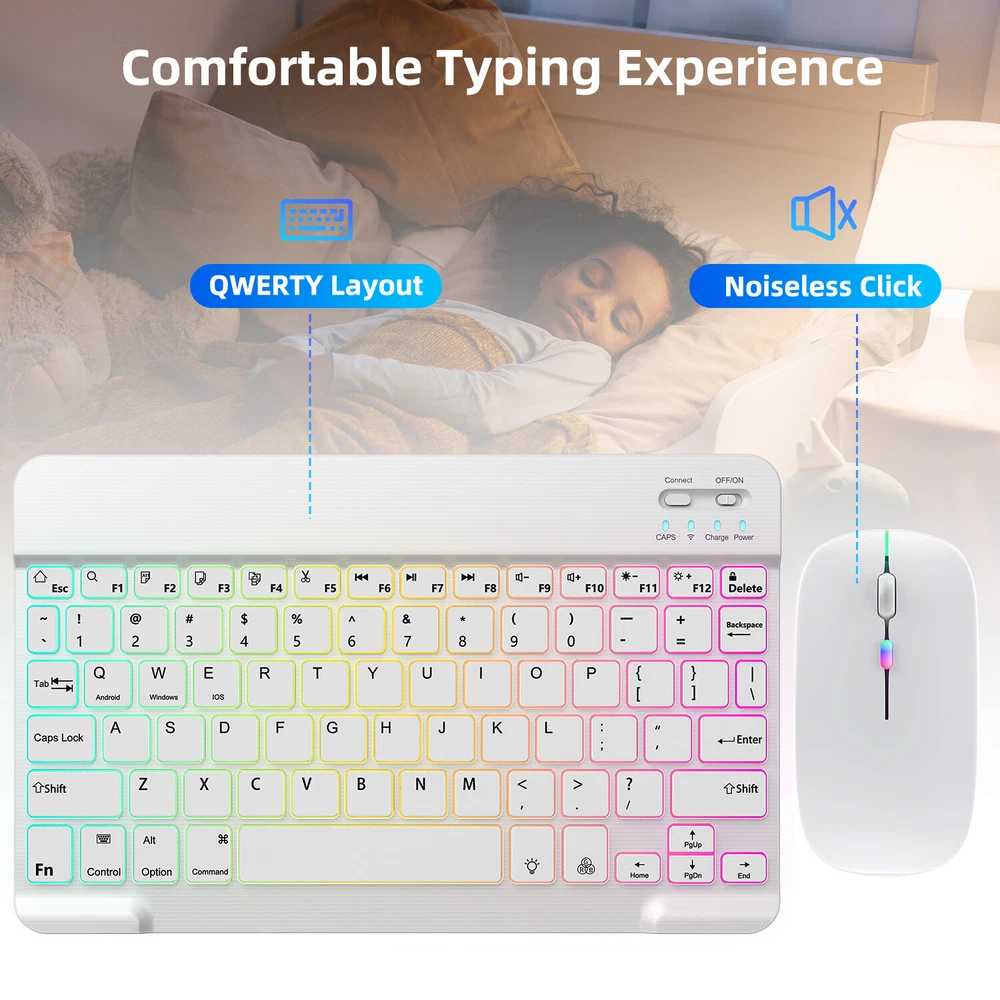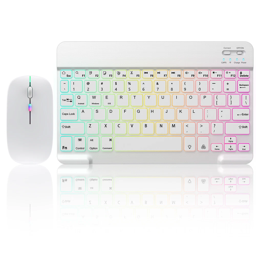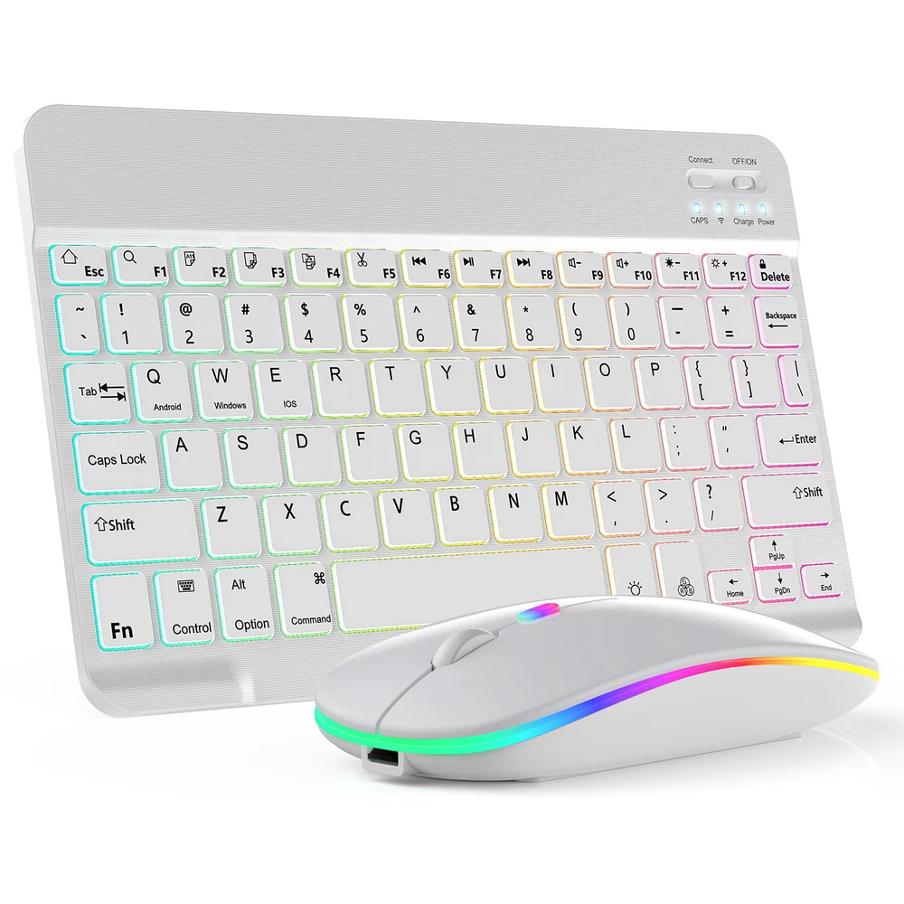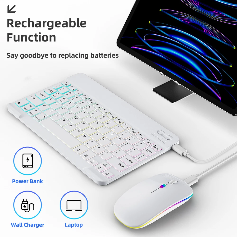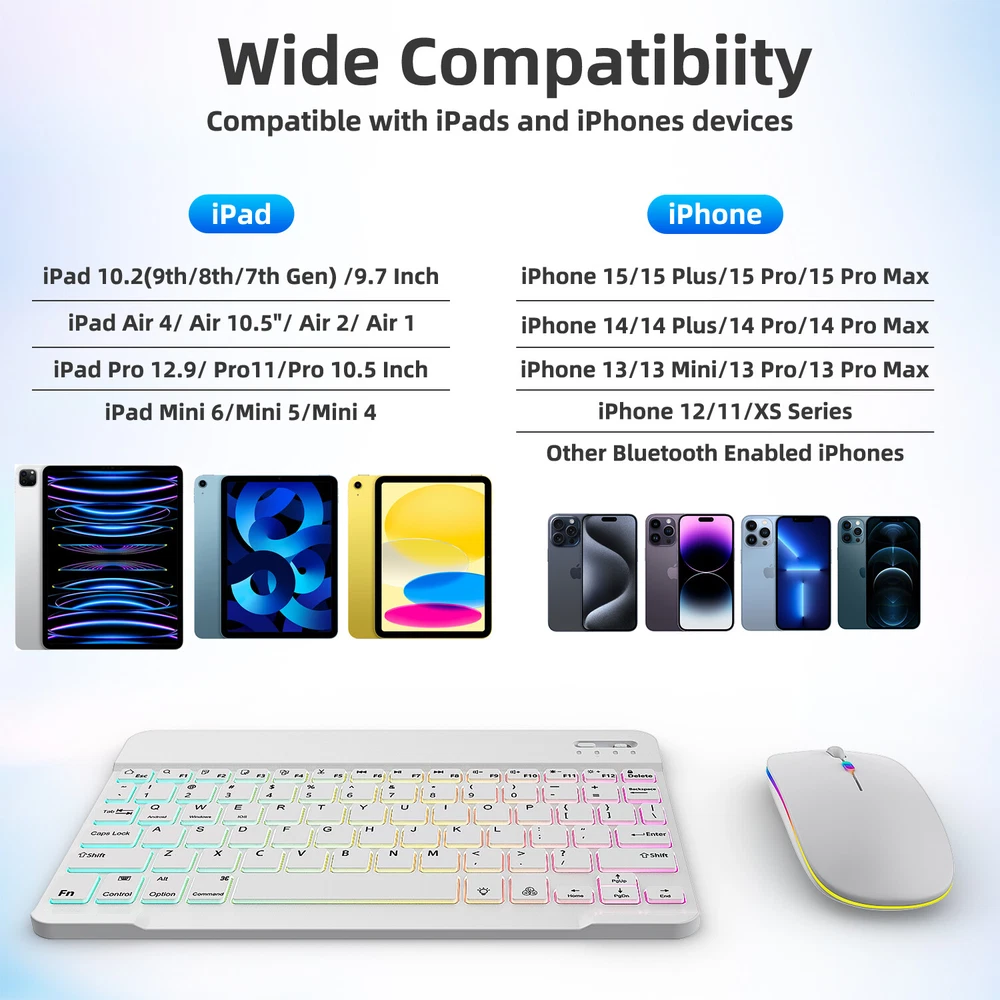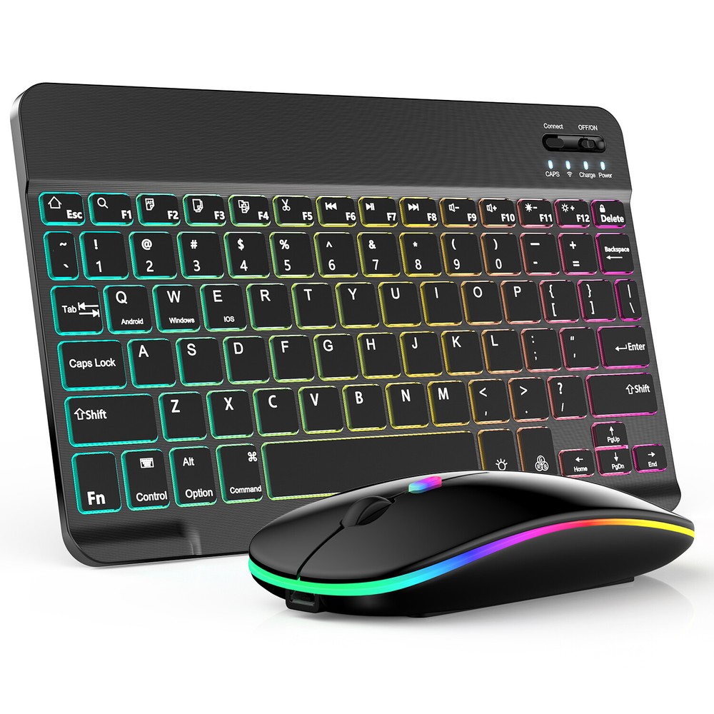 Bluetooth Keyboard and Mouse Combo for iPad - Rechargeable Wireless Keyboard Feature (Keyboard & Mouse): 【 Premium Durable Quality 】ABS plastic material with Keystrokes life up to 10 million times. 【 Rainbow Color Keyboard & Mouse 】This backlit bluetooth keyboard has 7 switchable backlight colors, It helps you to type easily in the absence of light. 【 Built-in Rechargeable Battery 】Power consumption is very small, with a long battery life. 【 Stable Connection 】Advanced Bluetooth-compatible technology provides a cable-free connection within a 10-meter (33ft) working range. 【 Intelligent power management system 】multi-mode power saving function, support PC standby wakeup, connectionless auto sleep without action. 【 Ultra-thin and Lightweight Design 】Ultra-thin wireless keyboard and mouse combo, you can put the keyboard and mouse in your briefcase, handbag or backpack at will. 【 Silent keyboard and silent mouse 】The small light weight keyboard is designed with scissors switch, which allows you to have a comfortable and quiet typing experience. 【 Dual Mode: BT 5.0 + 2.4GHz 】The cordless mouse allow to switch between two devices. Note: Bluetooth mode and 2.4G mode can not be used at the same time. 【 Wide Compatibility 】The Bluetooth keyboard and mice support iPad OS, iOS, Android and Windows operating systems. And compatible with apple iPad 10th 9th 8th 7th generation 10.9/ 10.2 inch, iPad Air 5th 4th gen 10.9", iPad Pro 12.9 inch 6th 5th 4th gen, iPad Pro 11 inch 4th 3rd 2nd gen, iPad 6th 5th 9.7 inch, iPad mini 6 5, iPhone 14 13 12 11 Pro Max, Samsung galaxy tab tablet smartphone cell phone Google Pixel Surface and other Bluetooth enabled mobile device. Product Specification: Materia: ABS Dual Mode: Bluetooth 5.0 + 2.4GHz (USB) Wireless Distance: 10 Meters/33ft Tracing System: Optical Operating System: Windows, MAC OS and Linux ect. Built-in Rechargeable Battery: 500mAh Operating Voltage: 3.7VDC (Built-in lithium polymer battery) Operating Current: <5mA Standby Current: 1.0mA Sleep Current: <0.25mA Package Included: $23.95 For 1 x Wireless Keyboard & Mouse $6.95 For 1 x Mouse Pad
